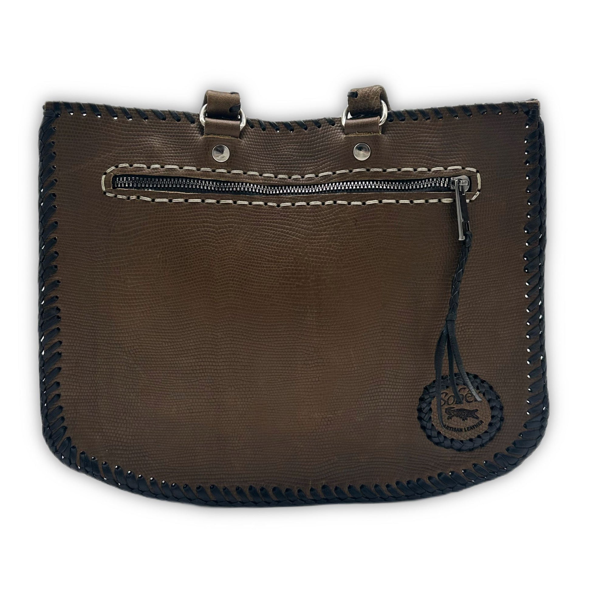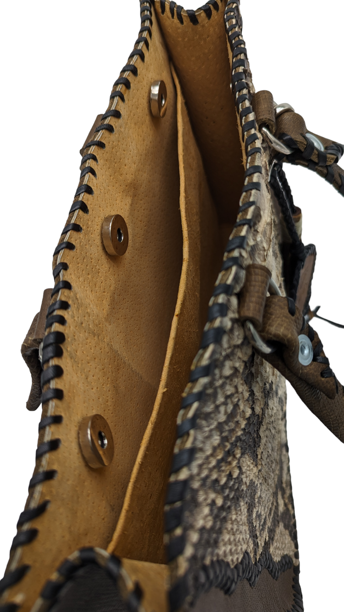 • مصنوعة يدويًا بخبرة من جلد الثعبان بلون بني فاتح جميل وجلد عجل محبب. هذه الحقيبة مصنوعة يدويًا بالكامل وتتميز بتصميم فريد بخياطة سوطية تضفي عليها لمسةً من المتانة والأنوثة. يتميز الجزء الخلفي من الجلد بسحاب عملي لسهولة الوصول. كما أن الجزء الداخلي مبطن بجلد العجل. تتميز بقفل مغناطيسي واحد وقفلين جانبيين مغناطيسيين إضافيين يسمحان للحقيبة بالتمدد. هذه الحقيبة مصنوعة لتدوم طويلًا!