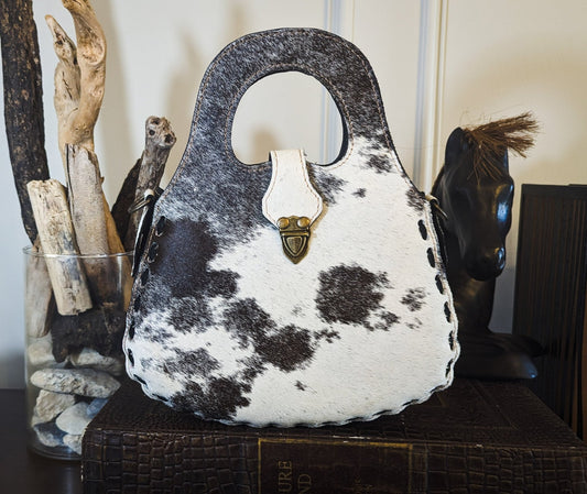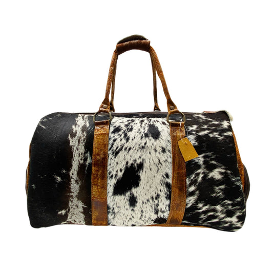Black and White Spotted Cowhide Genuine Distressed Leather Barrel Duffel BagRegular price $204.99 USDRegular priceUnit price per$249.99 USDSale price $204.99 USDSold out