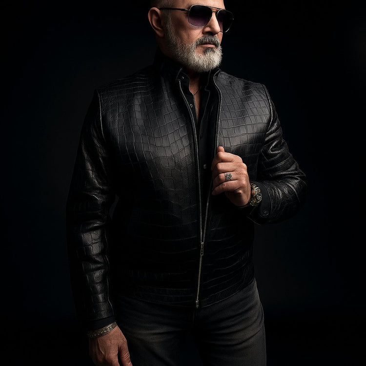 Men’s Black Alligator Leather Jacket – Luxury Exotic Skin Stand-Collar Bomber – Size XL