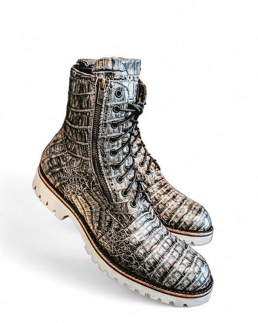 Men’s Alligator Lace-Up Combat Boots – Size 12 | Goodyear Welt | Handmade Exotic Leather Footwear