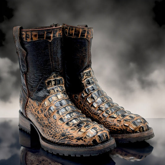 Sobek Leather – Men's US Genuine Alligator Hornback Cowboy Boots | Dubai Toe | Dark Brown Shaft | Goodyear Welt | Antique Lug Sole