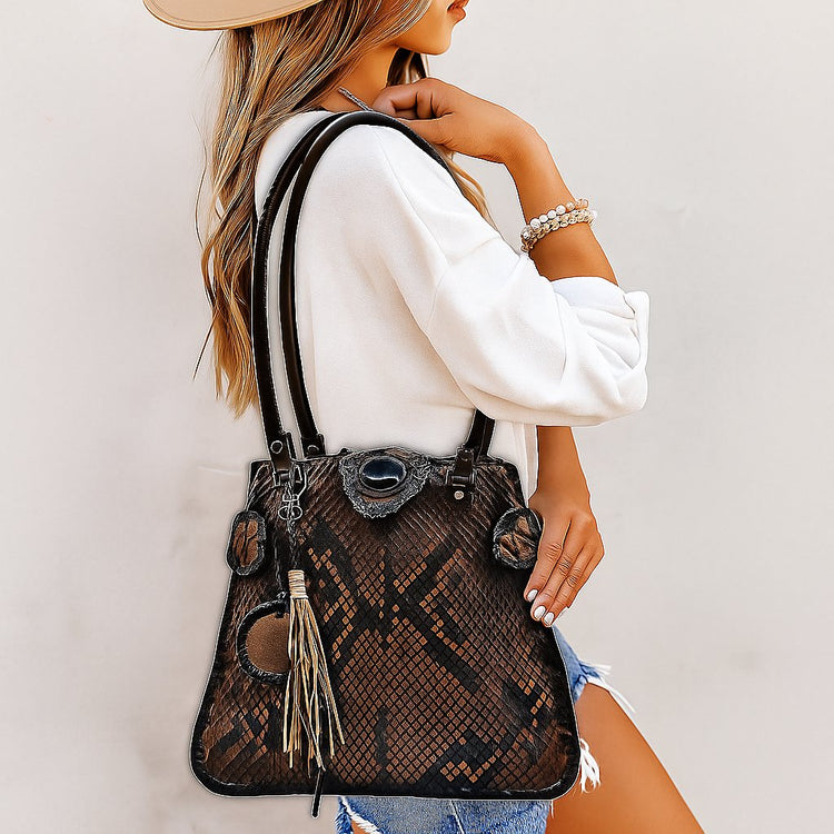 Bohemian Snakeskin Leather Hip Bag with Beaded Tassels