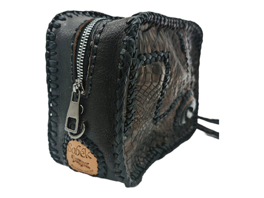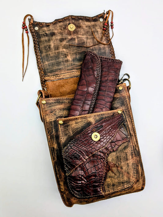 Real Alligator Patchwork Leather Crossbody Bag, Obsidian Stone Accent, Gift for Her, Whipstitch, Leather Wristlet, Festival Bag