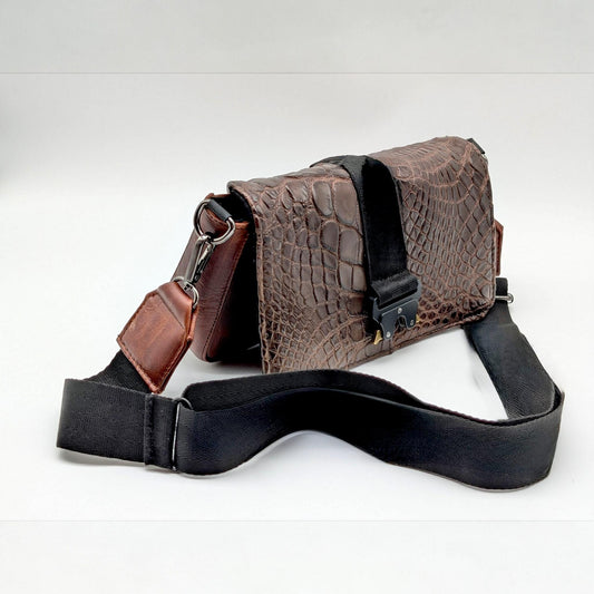 Alligator Leather Crossbody Bag, Tactical Buckle Purse, Handmade Exotic Leather Shoulder Bag, Luxury Brown Clutch, Artisan Unisex Gift