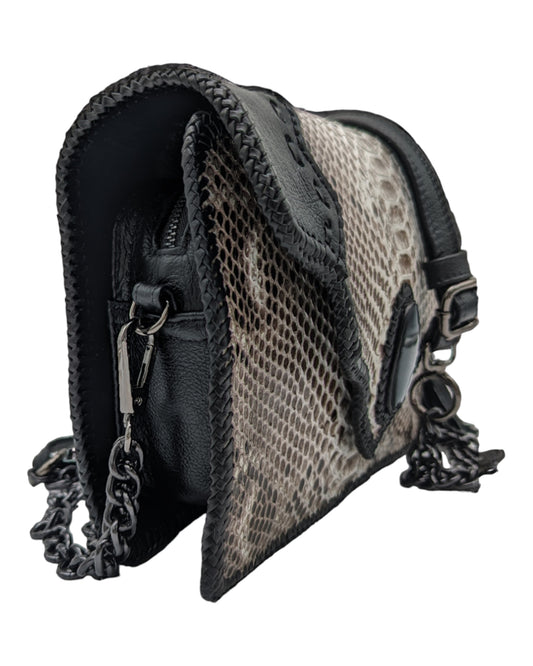 Trifecta Snakeskin Leather Shoulder Bag in Taupe and Obsidian Stone