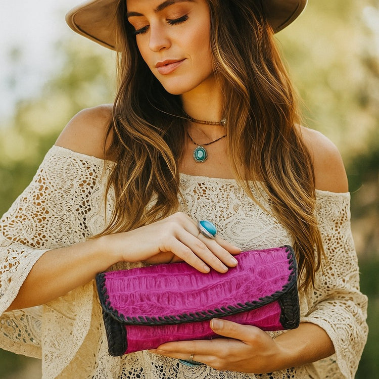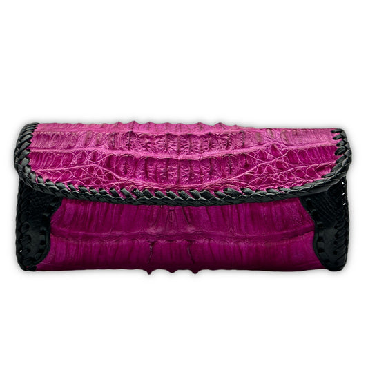 Trifecta Alligator Clutch in Fuscia and Artisan Whipstitch Leather