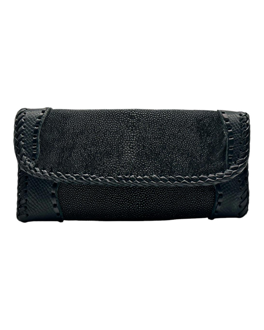Stingray Leather Women's Wallet – Handmade Black Clutch with Coin Pocket, Mirror, Zipper & Card Slots