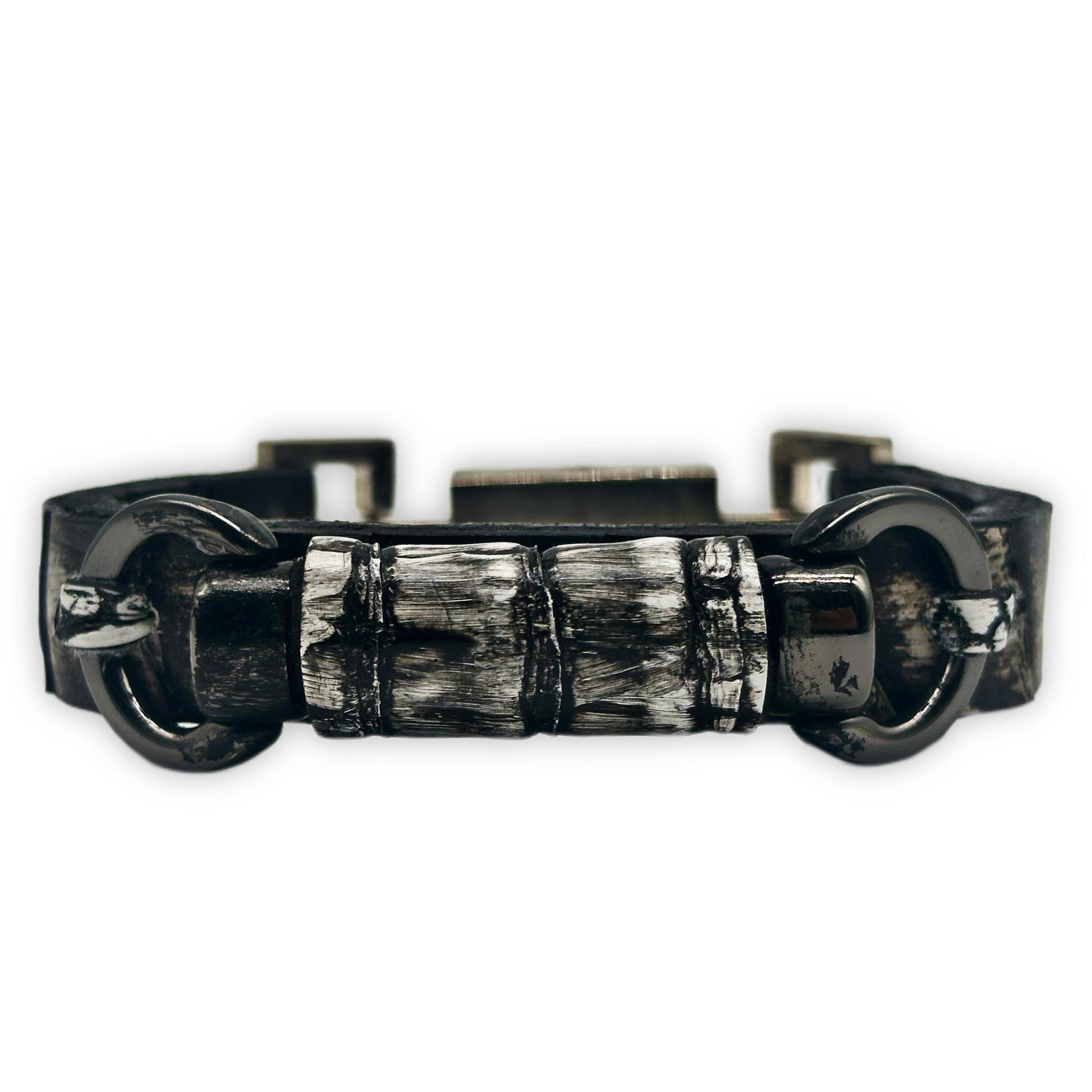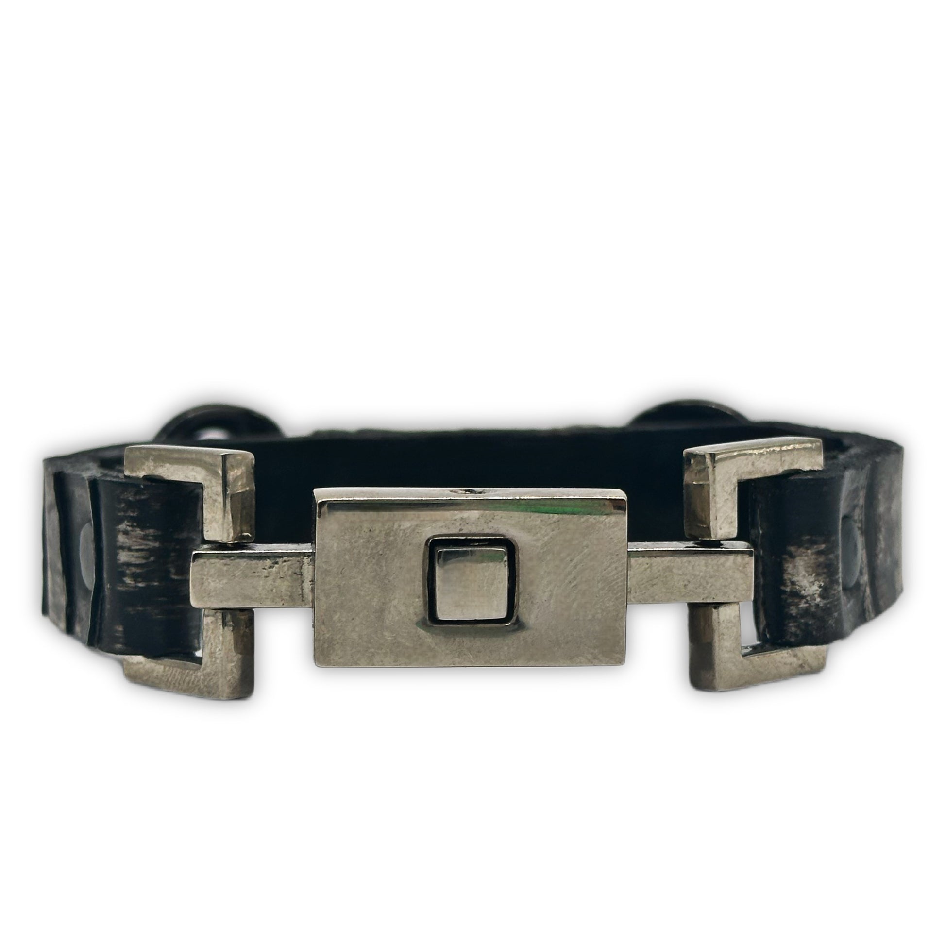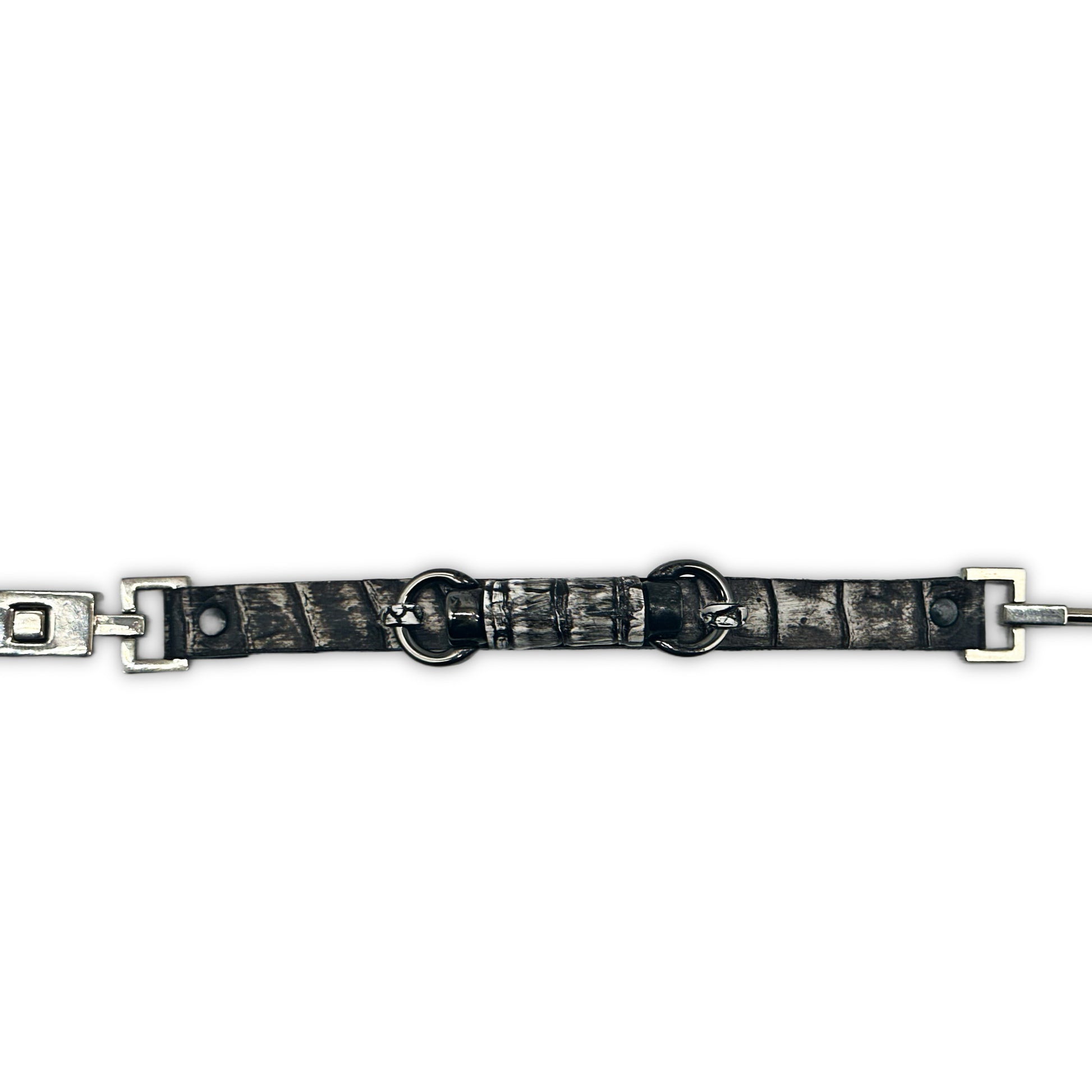 • With its distinctive alligator leather, this bracelet is a standout accessory, perfect for those who want to make a statement. It features silver embellishments, adding an elegant touch to the overall design.