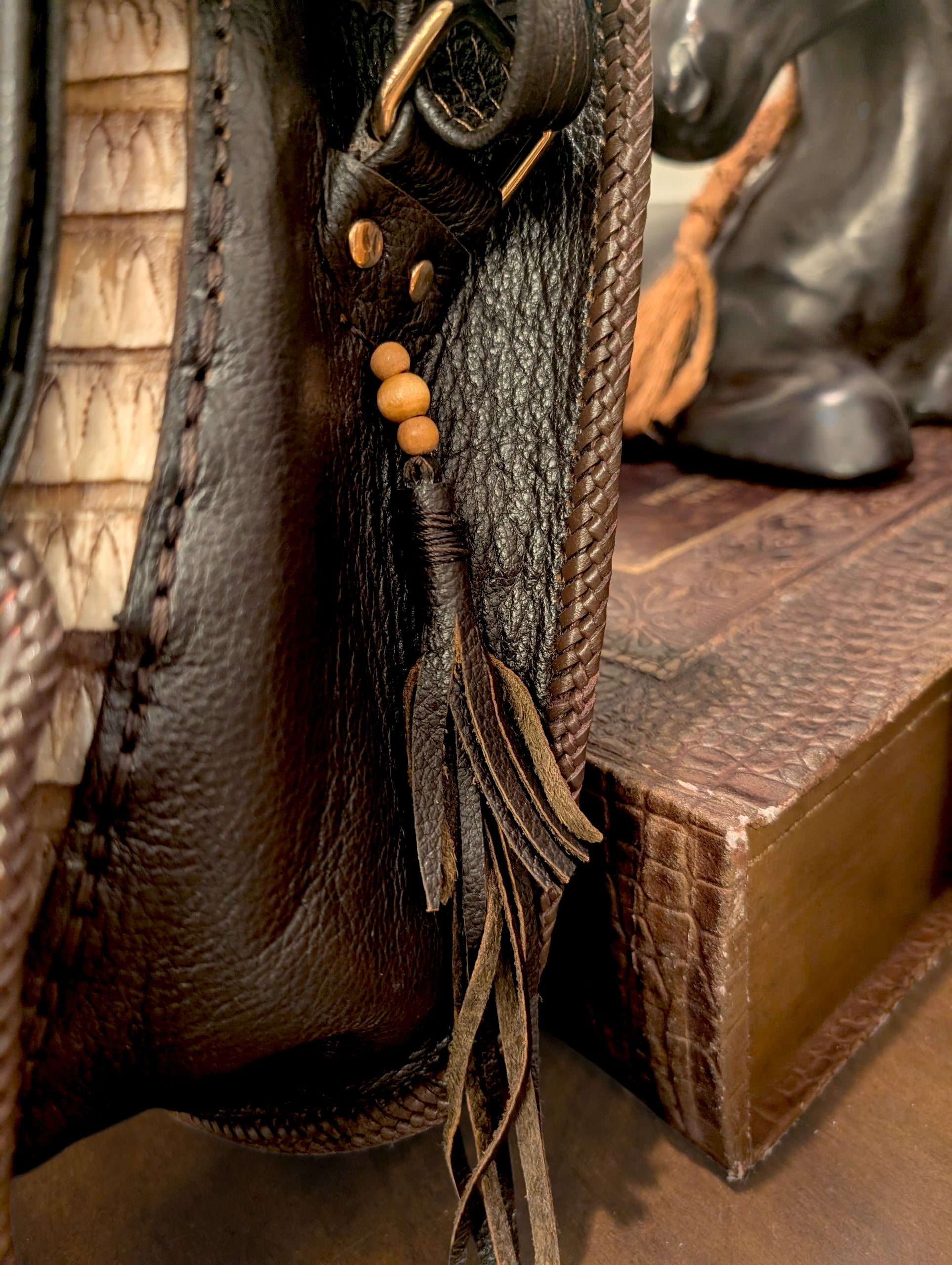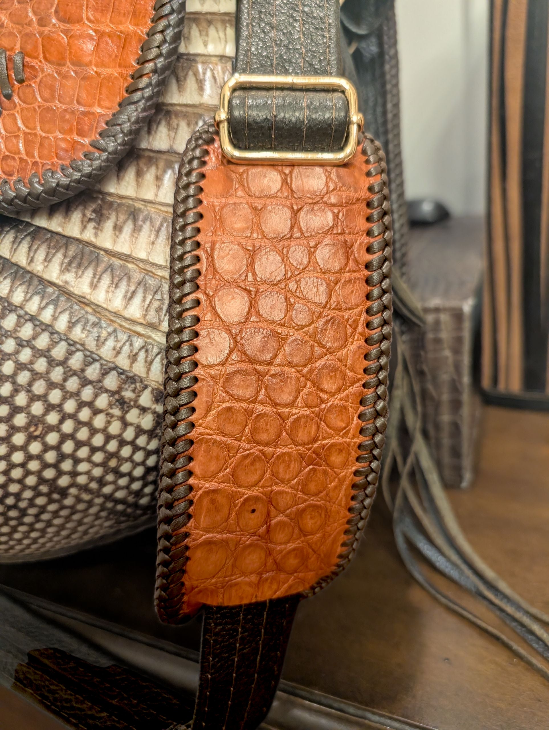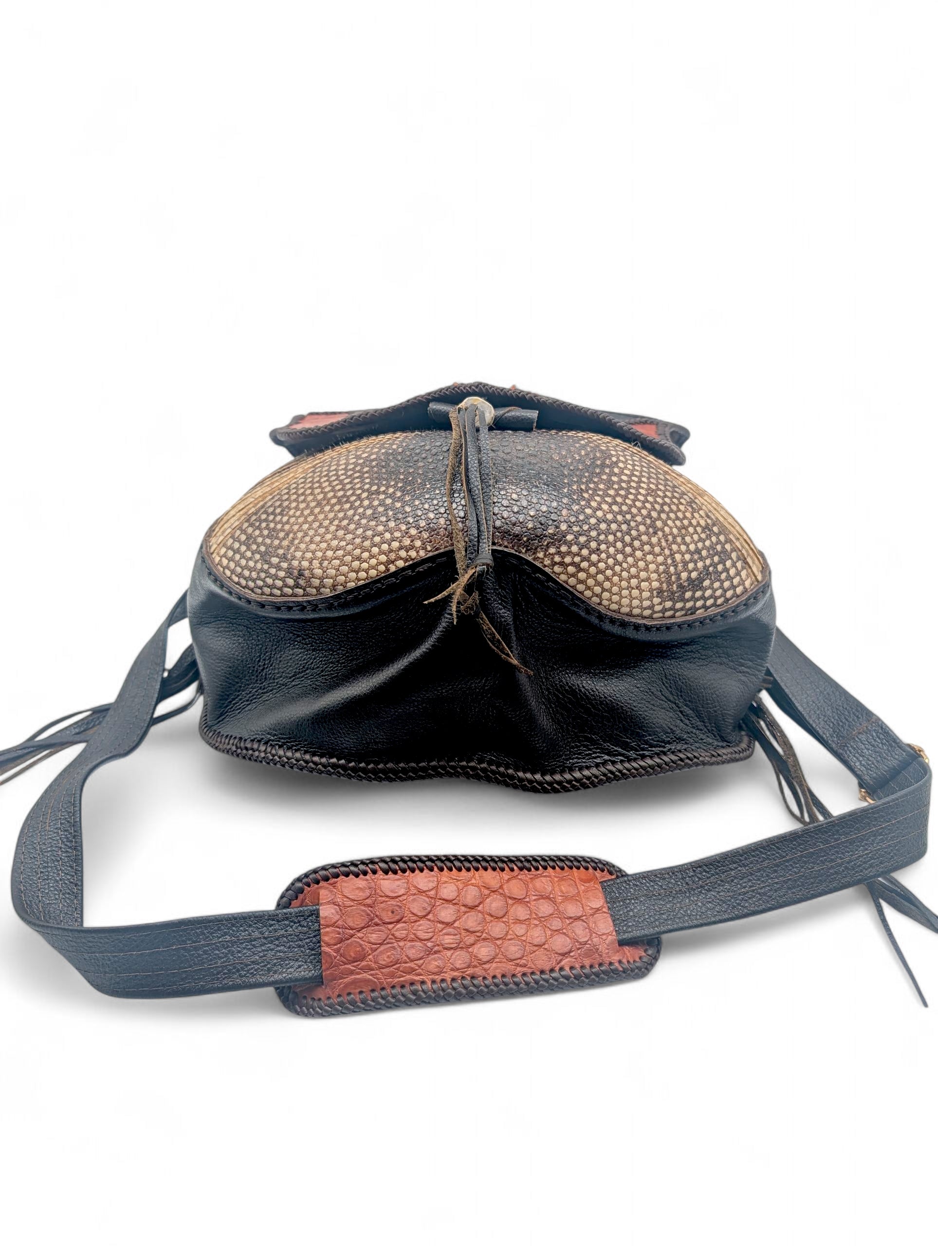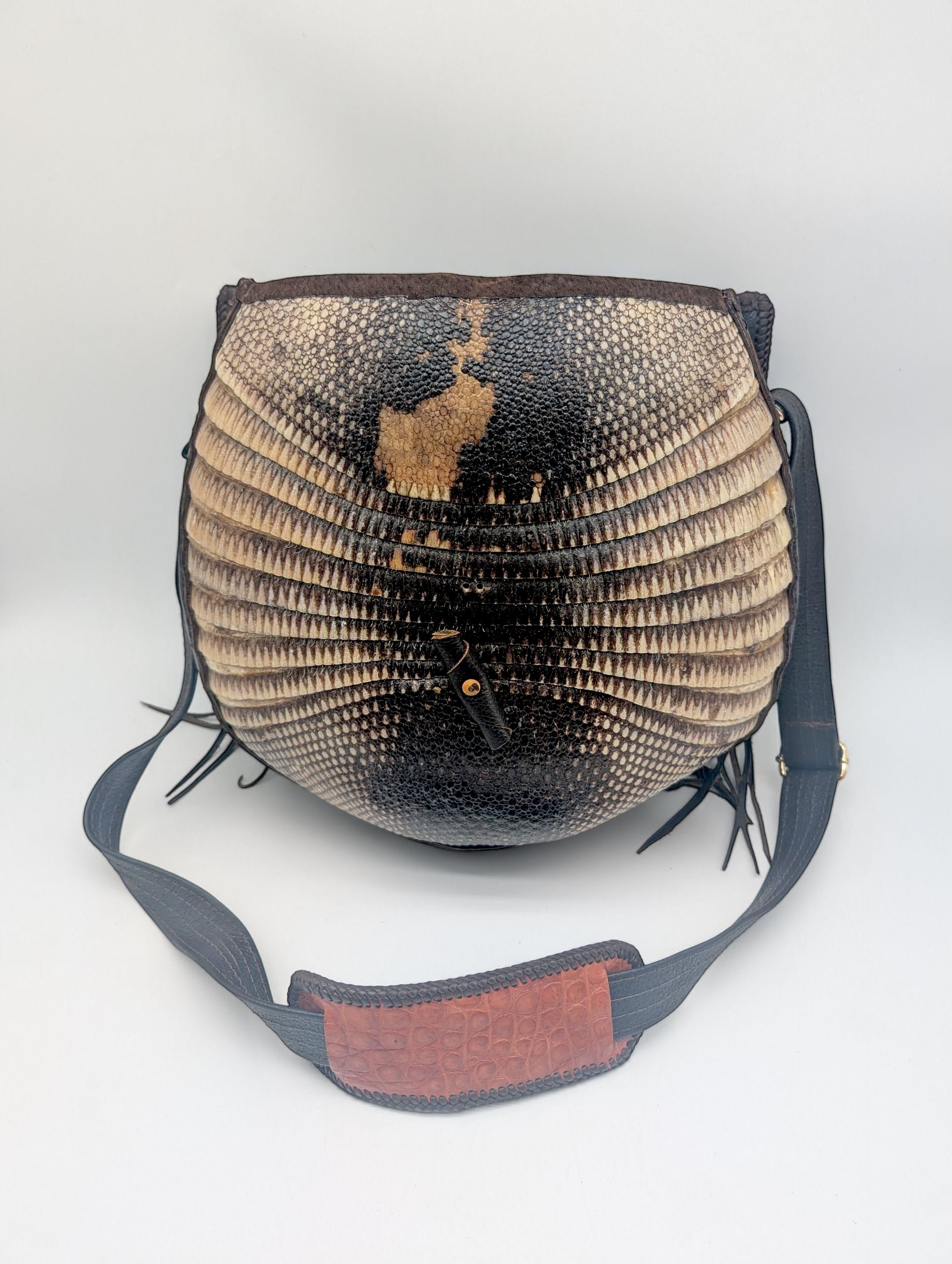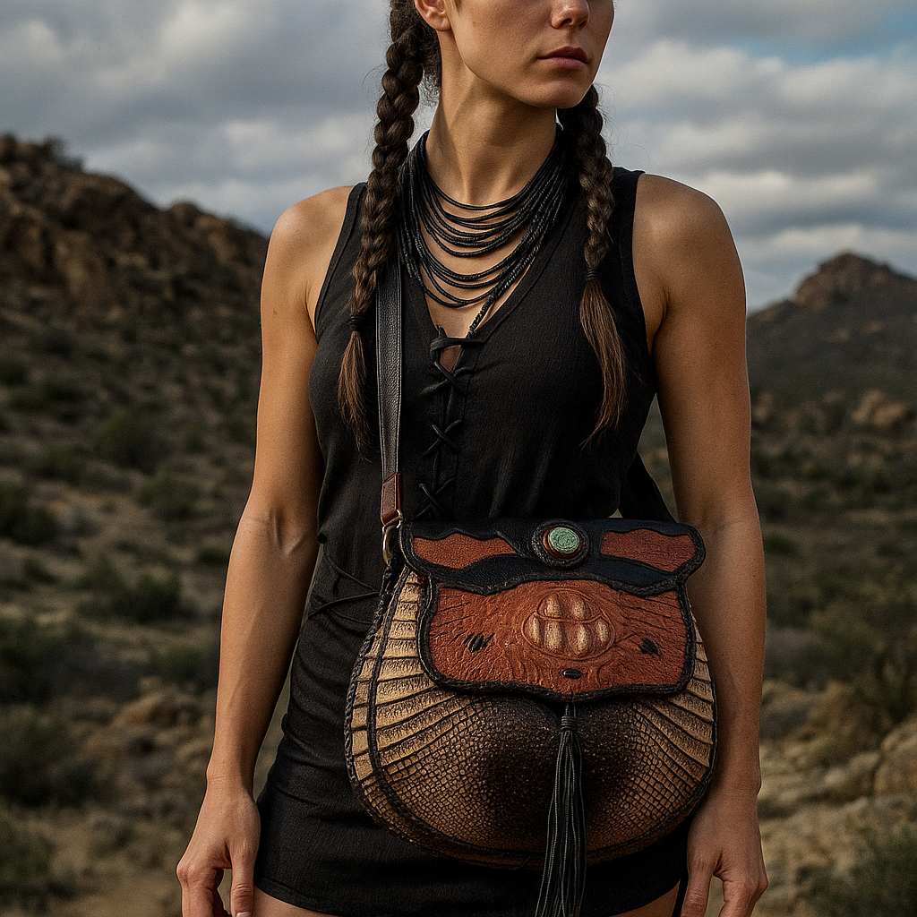 This handcrafted artisan bag is a true collector’s piece, blending natural textures, rugged elegance, and free-spirited Bohemian style. Made from genuine armadillo shell and crowned with the most exotic part of the alligator hide—the hornback crown (head), this is a rare piece you won’t see twice.