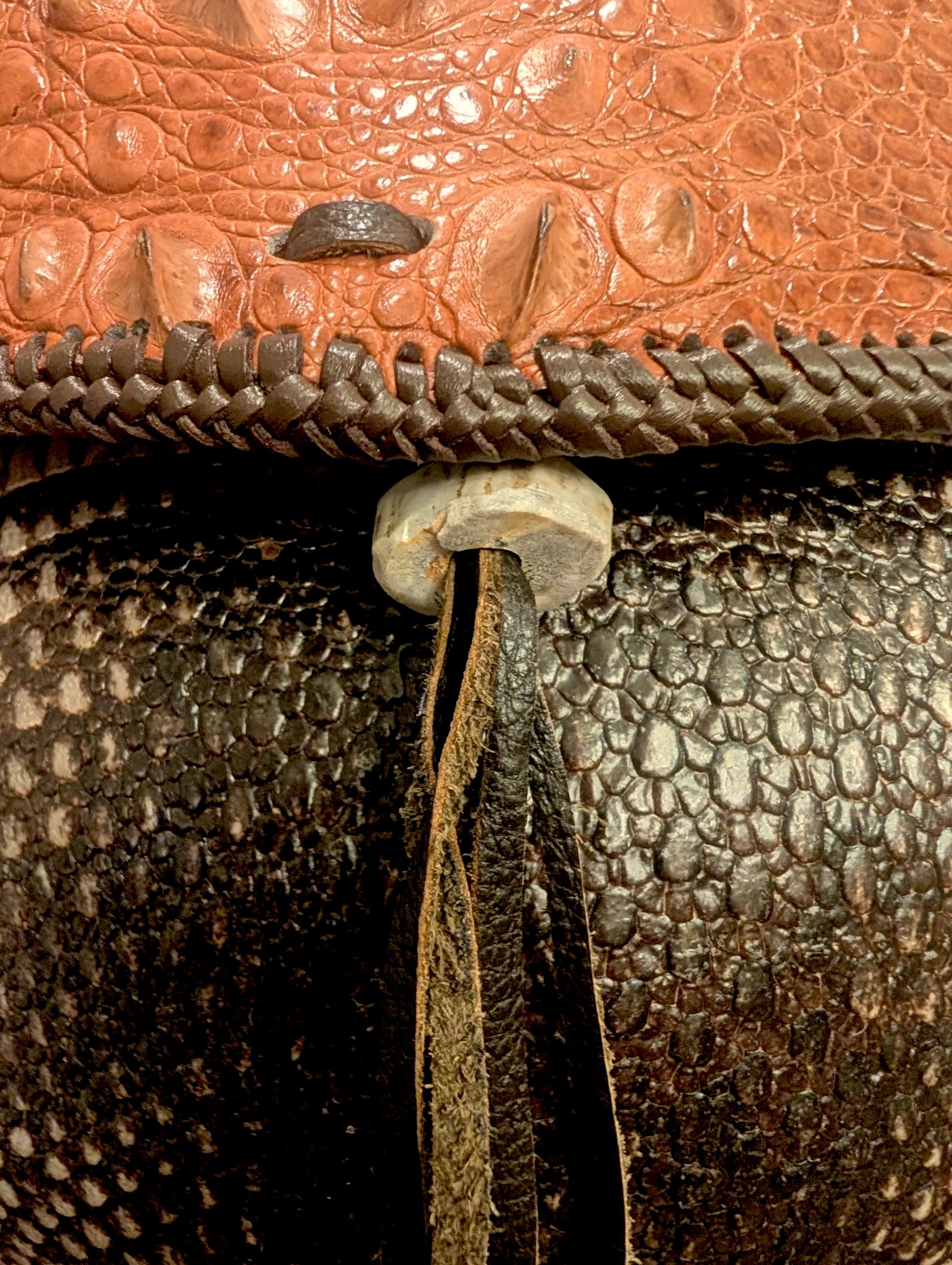 Materials: Armadillo shell, alligator hornback leather, turquoise, antler bone, leather, beads