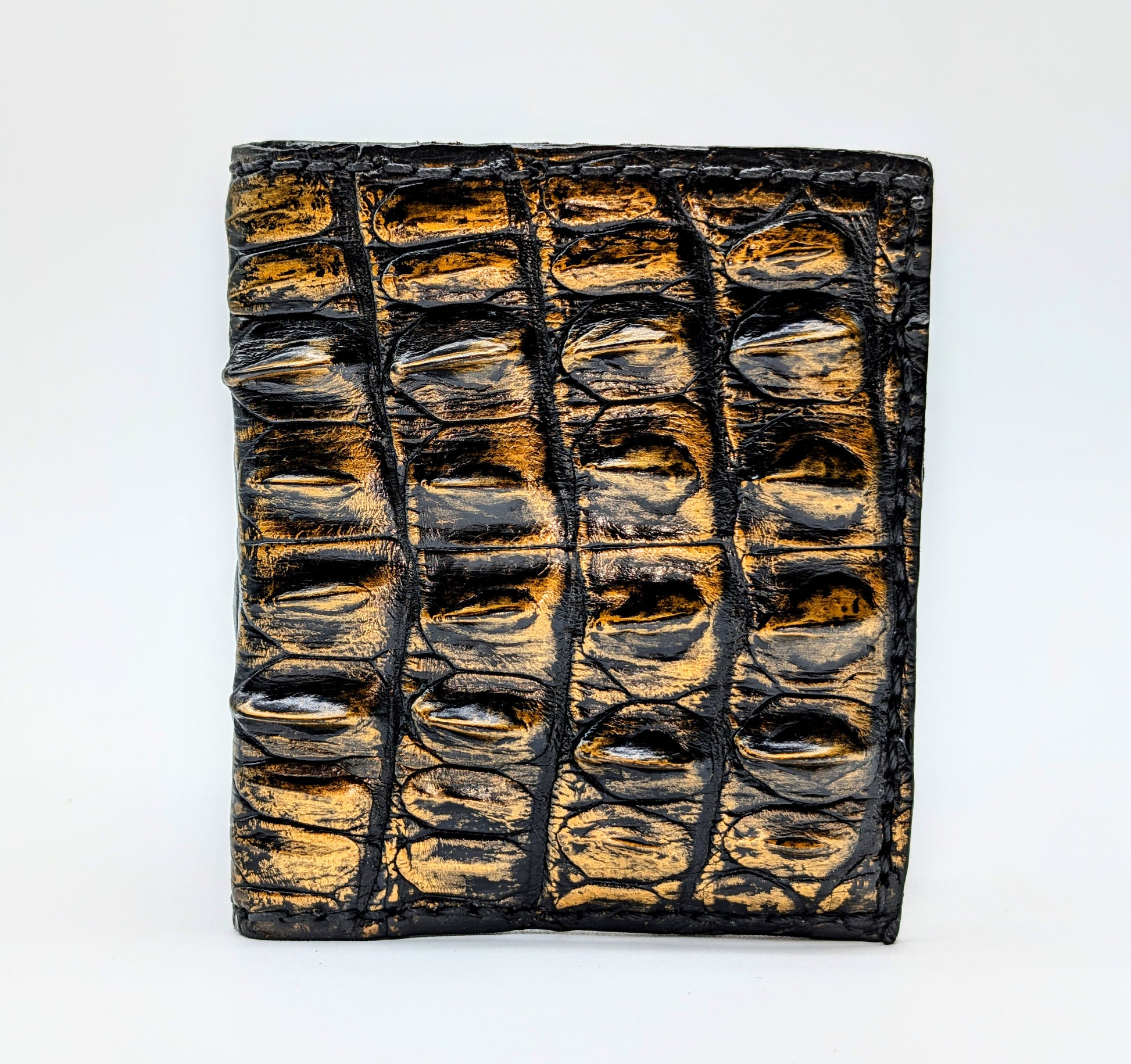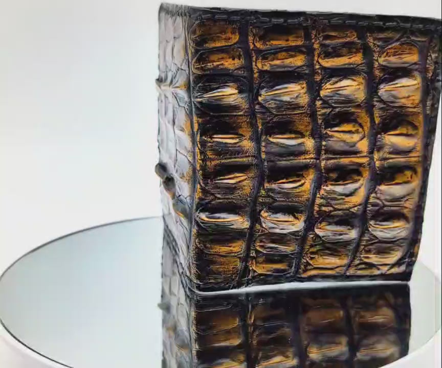 Introducing the crown jewel of craftsmanship: a full alligator hornback leather wallet by Sobek Leather, meticulously handmade with genuine exotic leather on both the exterior and interior. Dyed in a deep black and gold finish, this wallet is a symbol of sophistication and status.