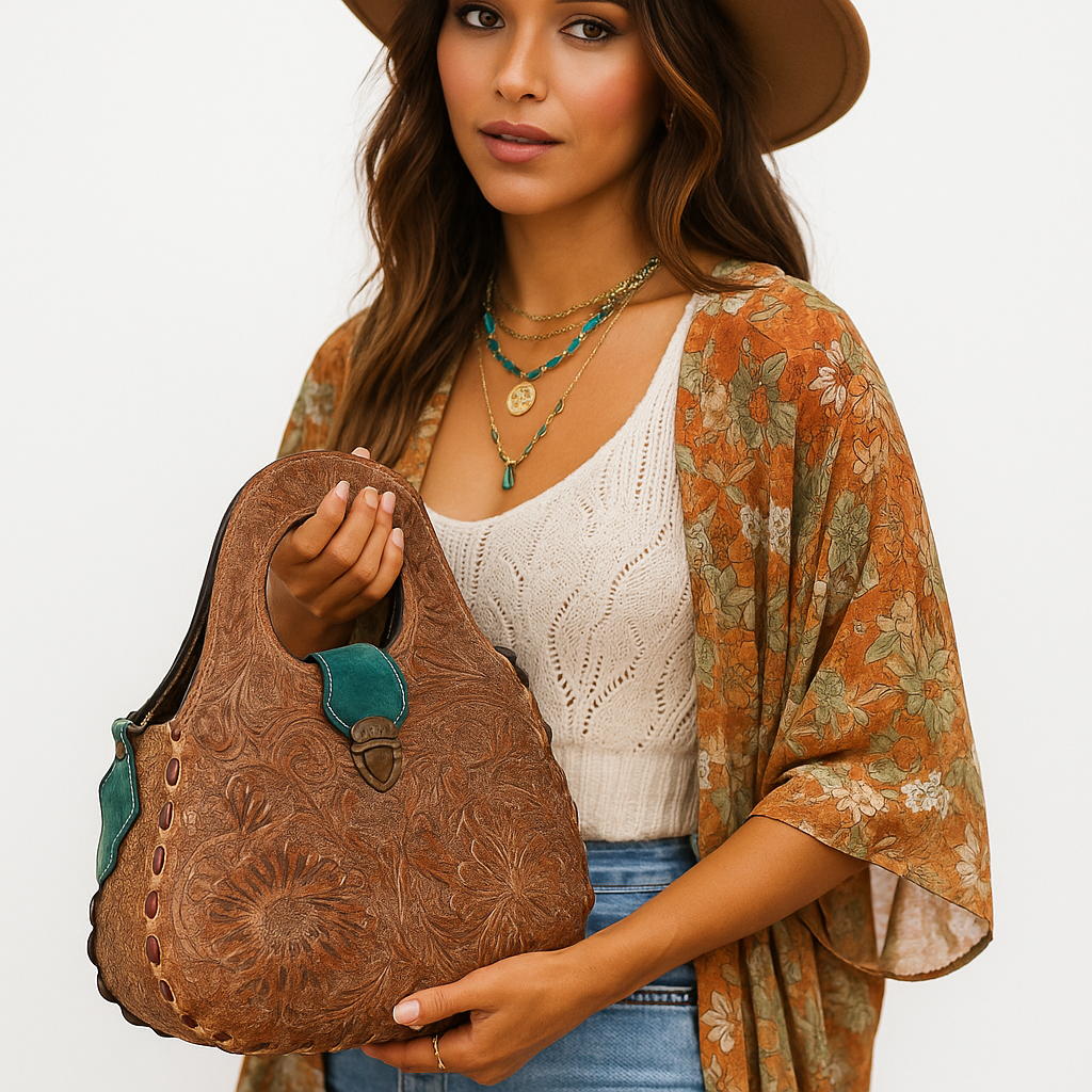 Blossom Floral Tooled Leather Round Top Handle Purse