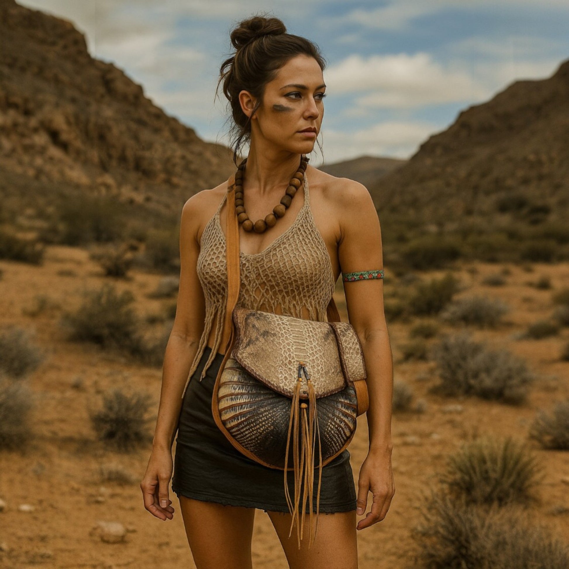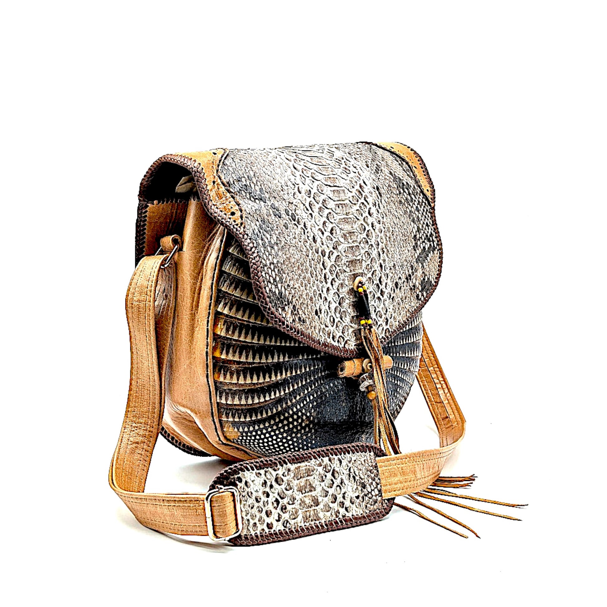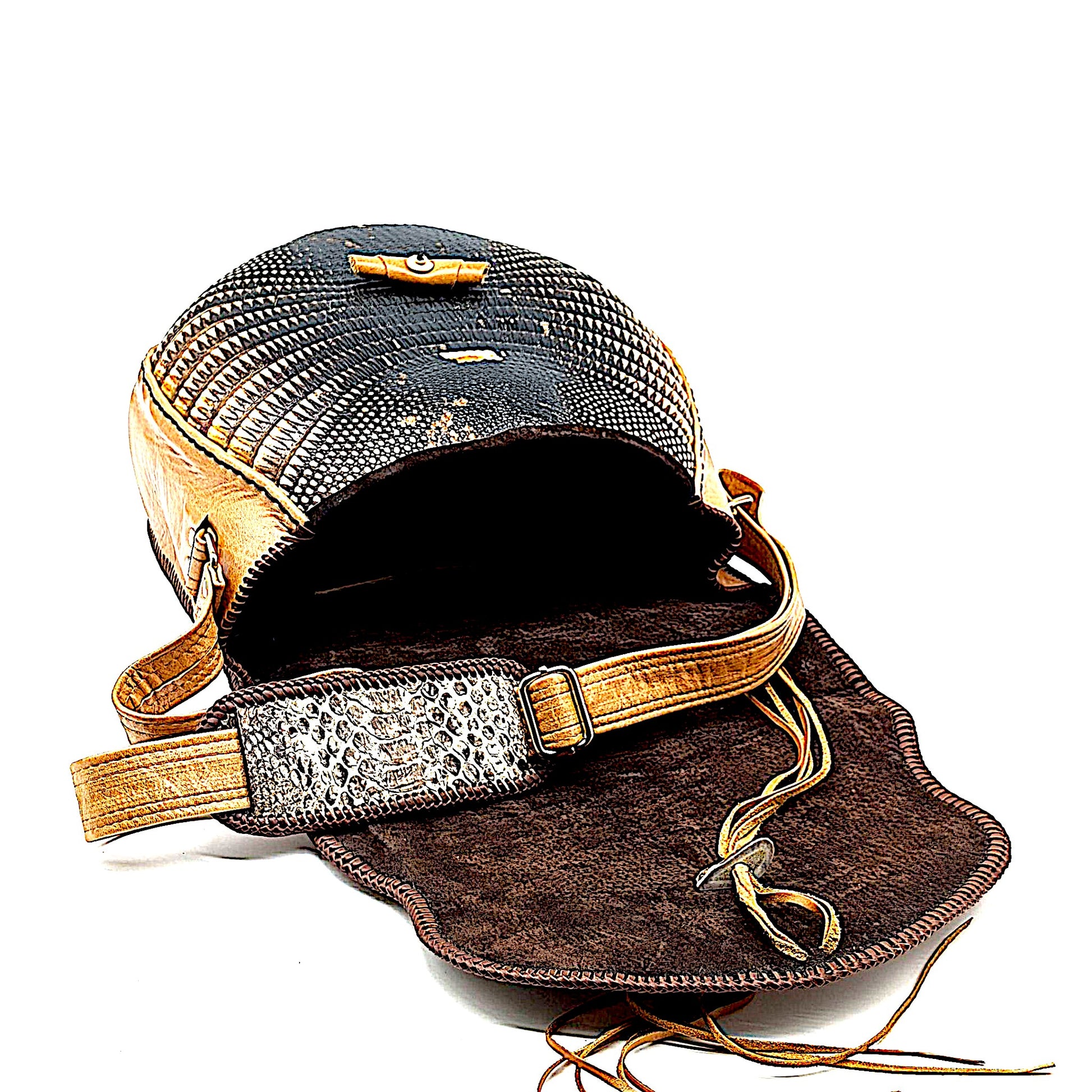This is a completely artisanal and sustainably crafted crossbody bag, a rare and captivating conversation piece. Meticulously handcrafted over many hours, this bag features a genuine armadillo shell, cleaned, processed, and polished by hand to showcase its natural beauty. The elegantly whipstitched flap is made from genuine snakeskin, displaying stunning earth tones that complement the shell perfectly.