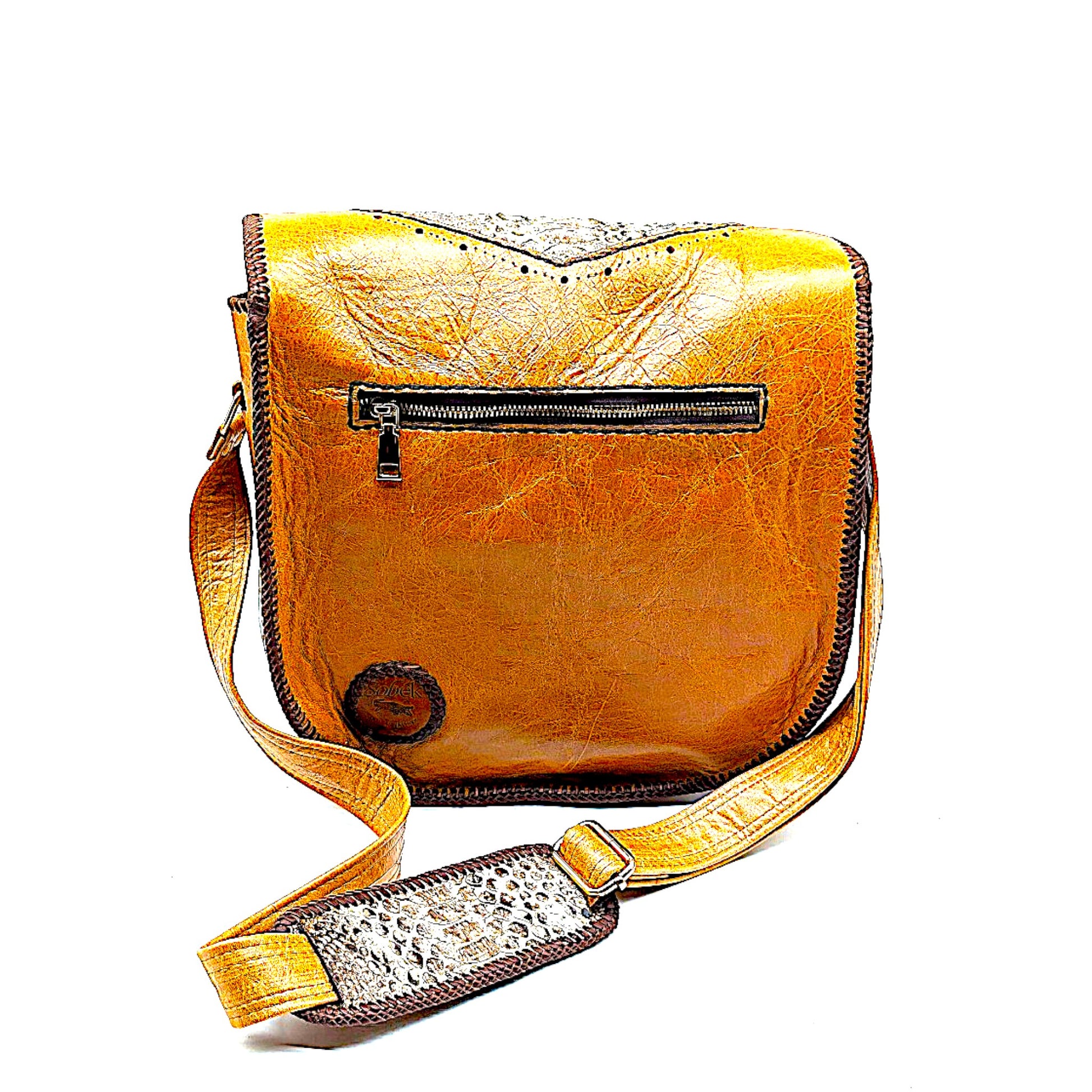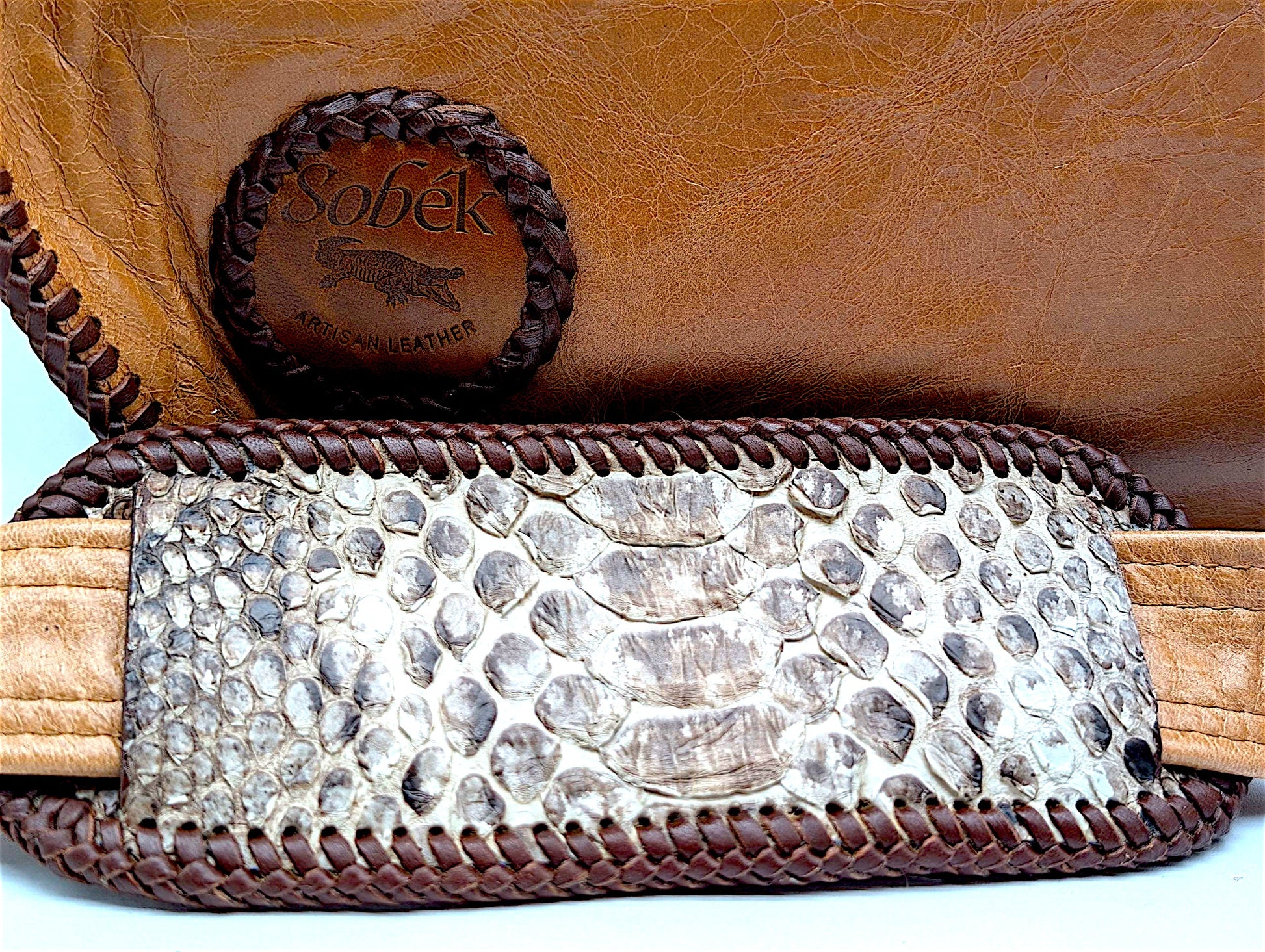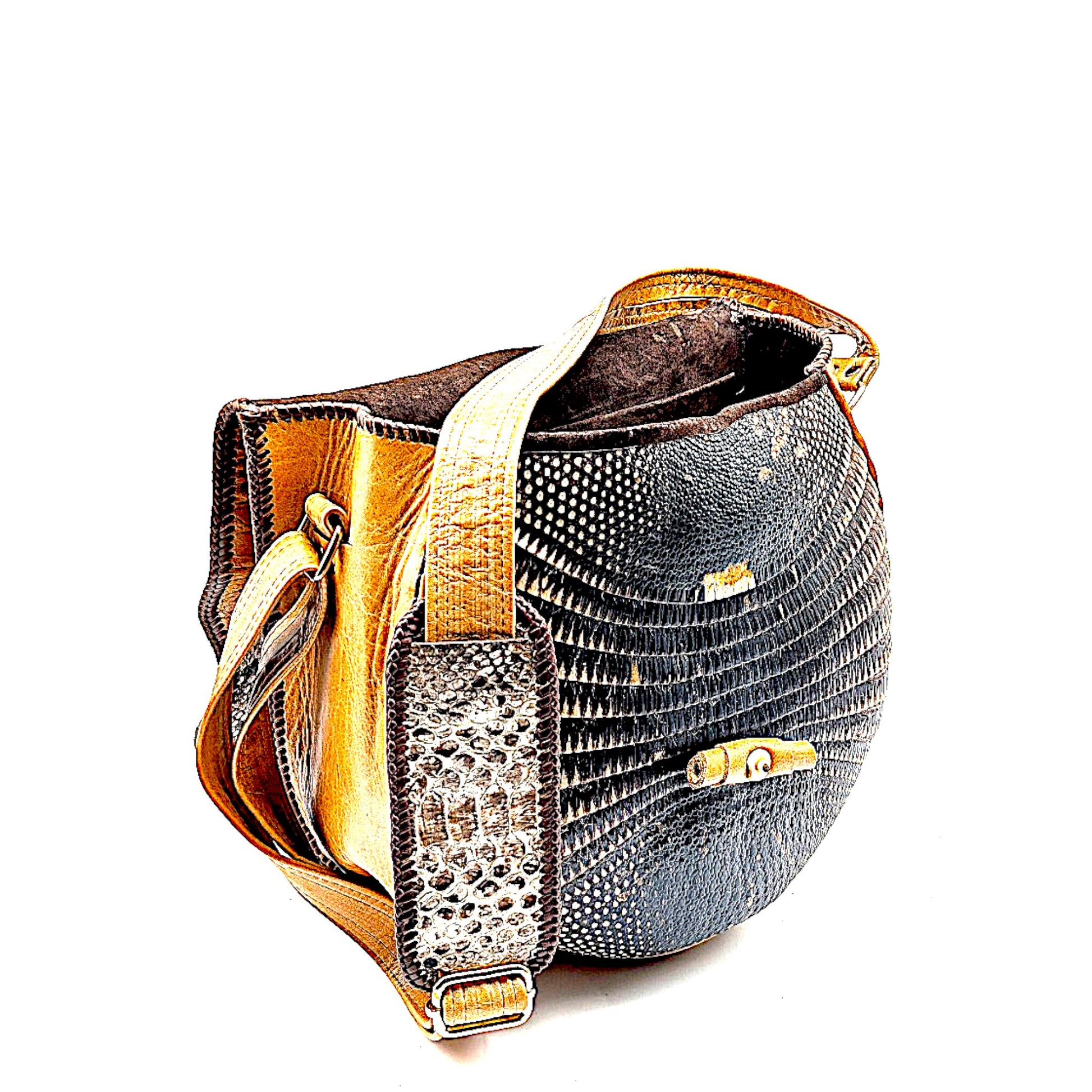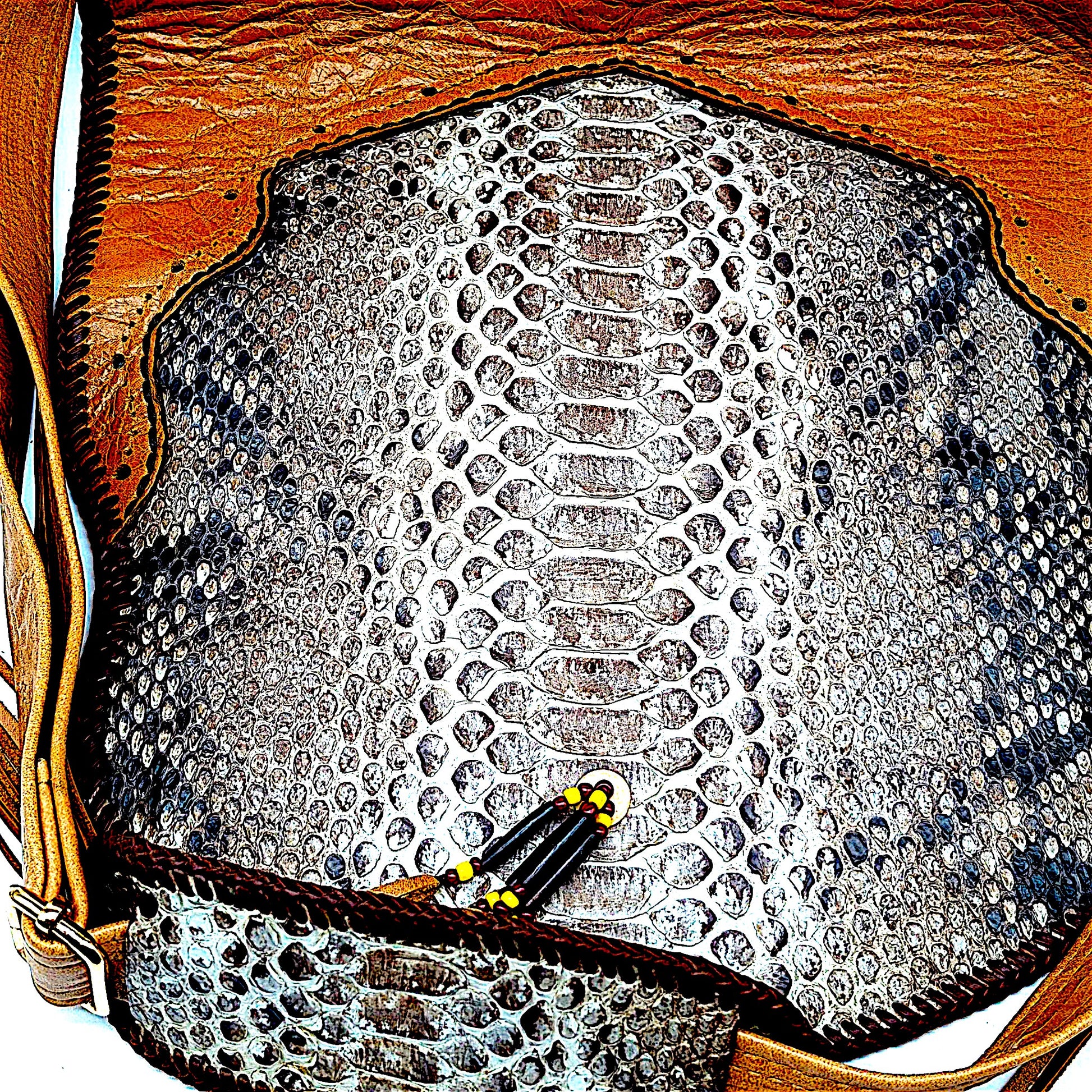This is a completely artisanal and sustainably crafted crossbody bag, a rare and captivating conversation piece. Meticulously handcrafted over many hours, this bag features a genuine armadillo shell, cleaned, processed, and polished by hand to showcase its natural beauty. The elegantly whipstitched flap is made from genuine snakeskin, displaying stunning earth tones that complement the shell perfectly.