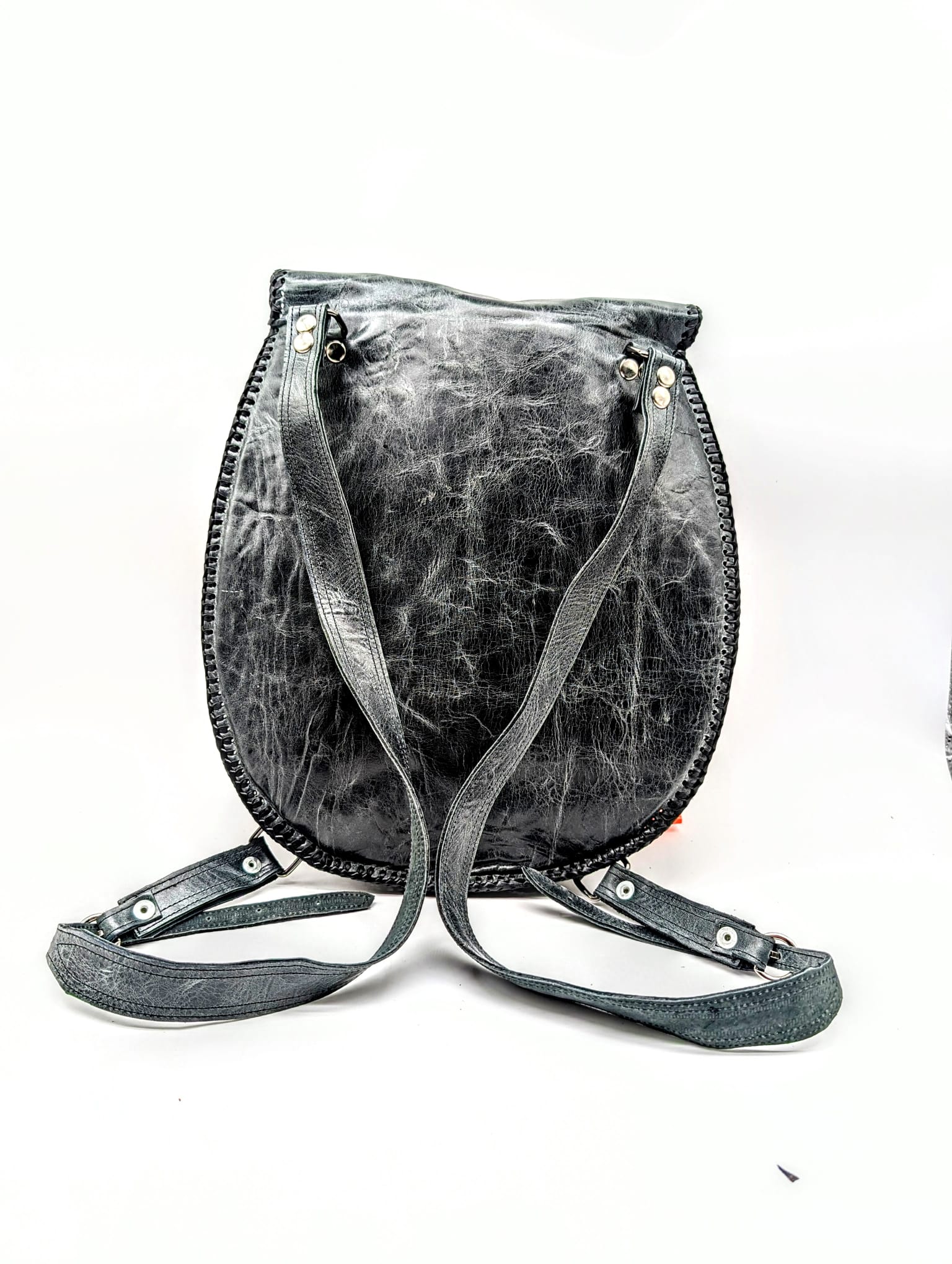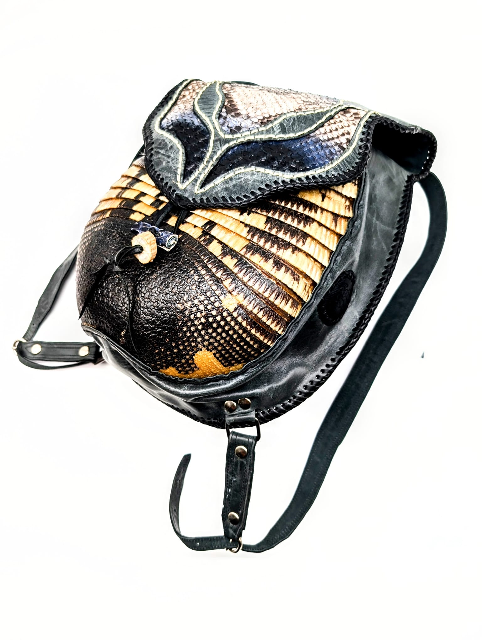 Bohemian Armadillo Snakeskin Whipstitch Leather Backpack with Antler Bone Closure, Bohemian Bag with Armadillo Shell and Fringe Charm