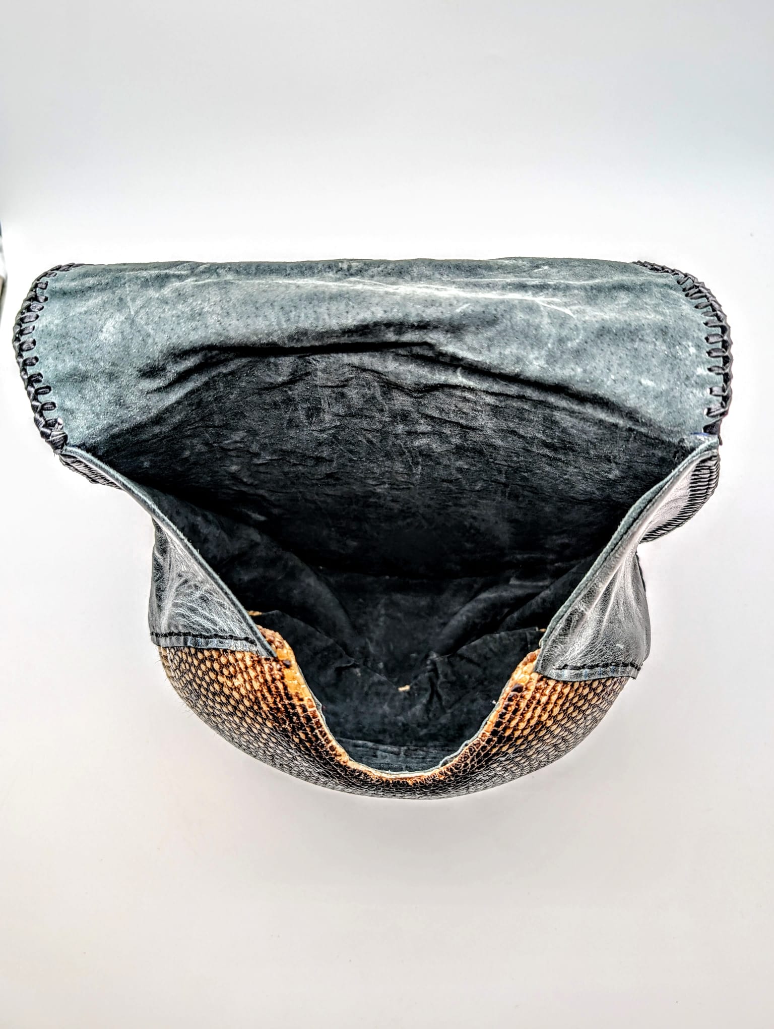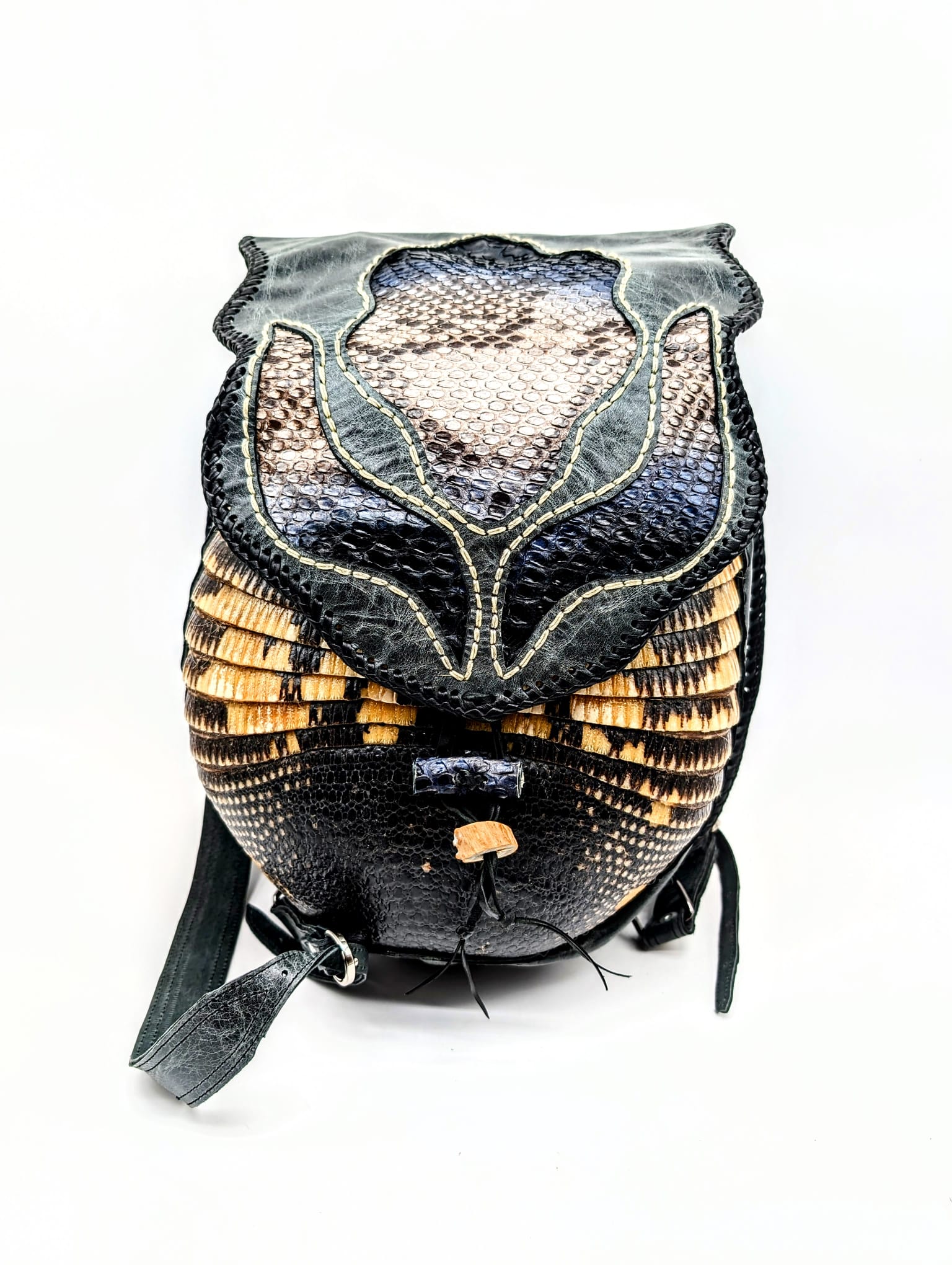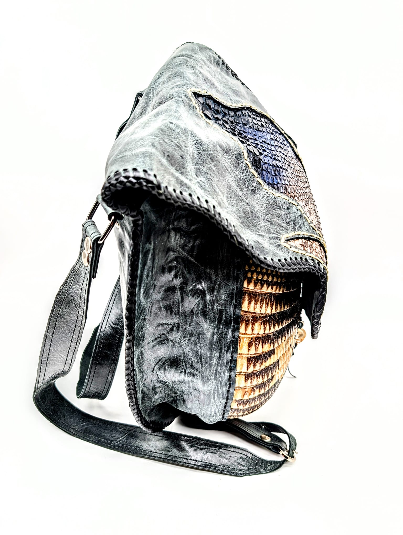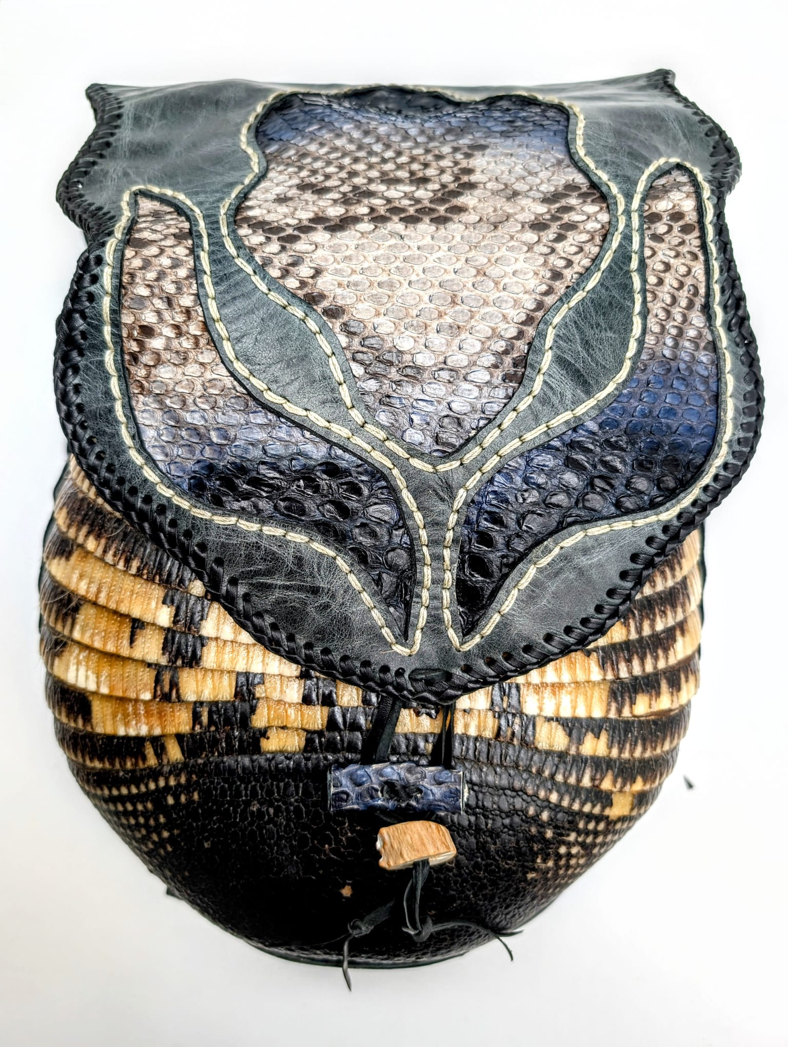 This bag is completely artisanal/handmade and has taken many hours to complete. It is a rare bag that is surely a conversation piece. It is made from a real armadillo shell that has been cleaned, processed, and polished by hand in such a unique way to enhance its natural beauty. The genuine snakeskin flap is elegantly whipstitched and the skin showcases a beautiful ombre blue hue. It's whipstitch design adds to this bags durability. This bag was designed to be worn as a backpack for hands free wear. Everything about this bag is completely clever. Even the flap is secured by a string closure made from real antler bone. This piece will surely add Bohemian vibes to any outfit.
