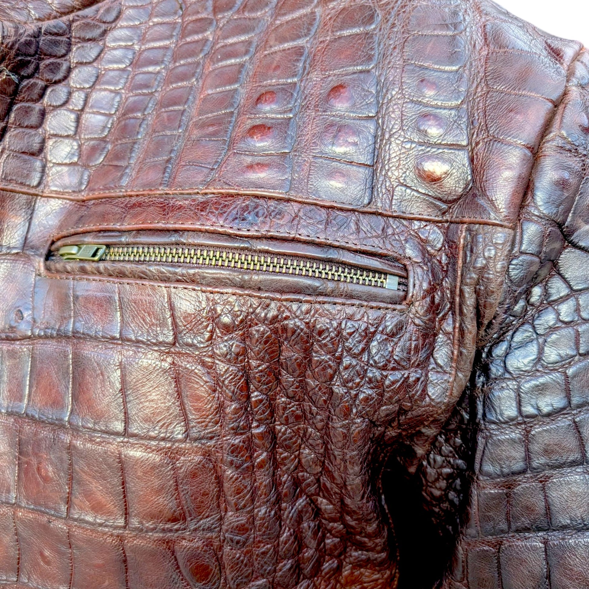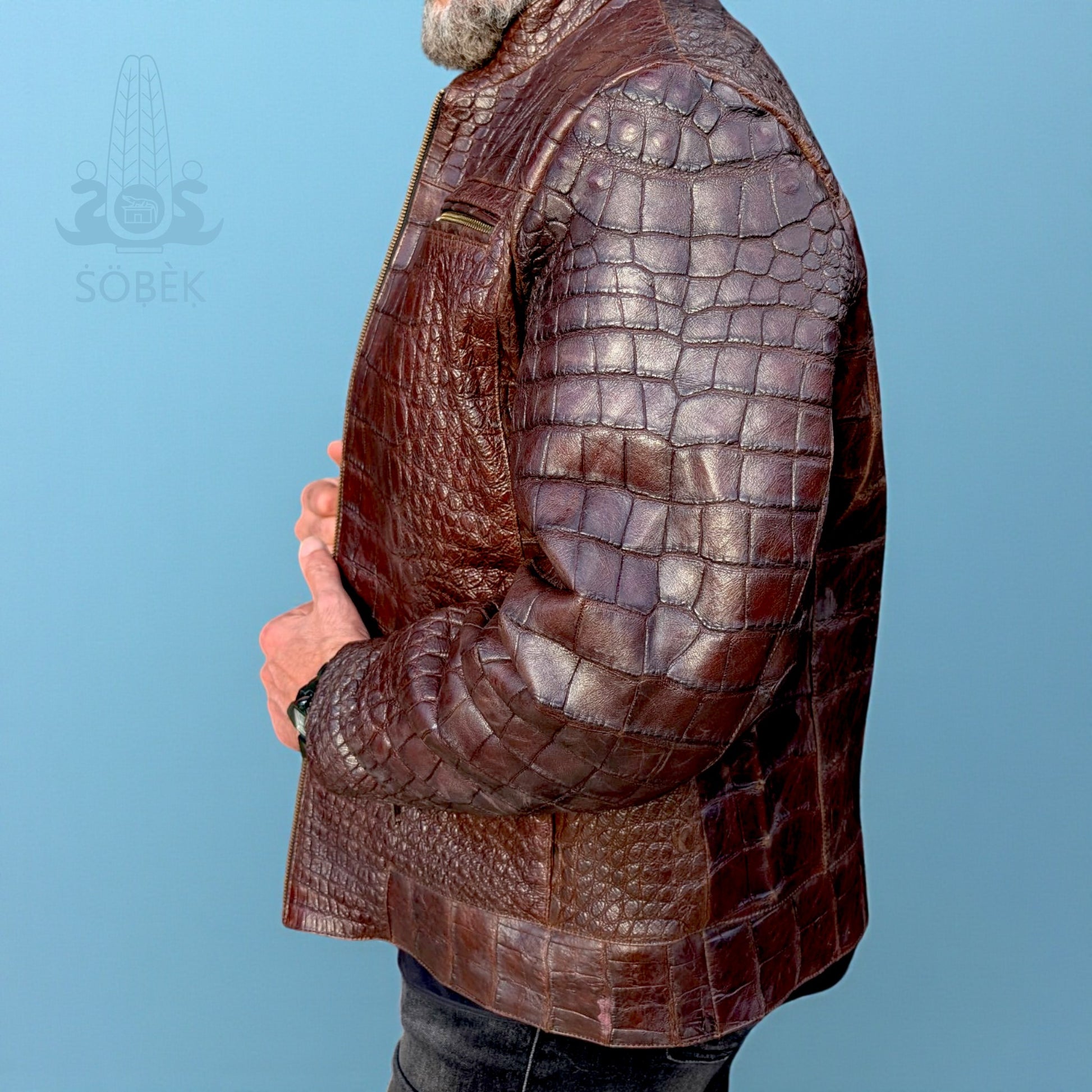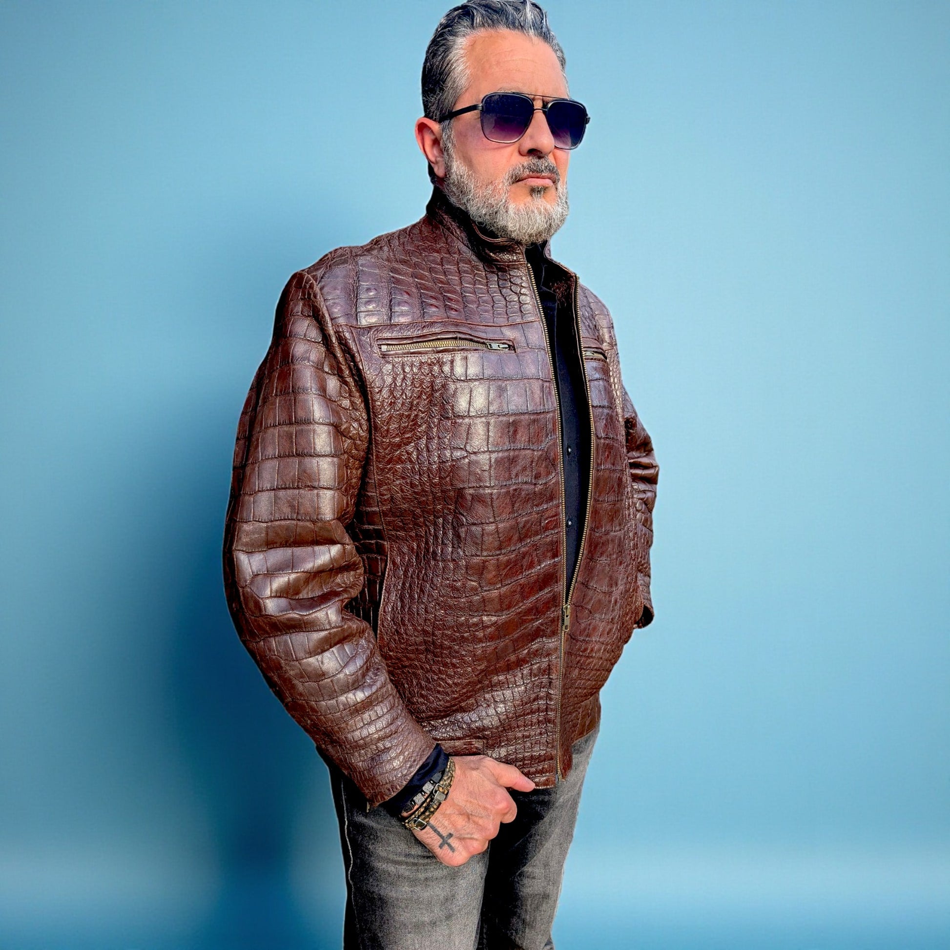 Elevate your wardrobe with this one-of-a-kind brown alligator leather bomber jacket, handcrafted from 100% genuine alligator skin. This statement piece blends the classic bomber silhouette with the rich texture and prestige of authentic alligator leather, creating a jacket that is as bold as it is timeless.
