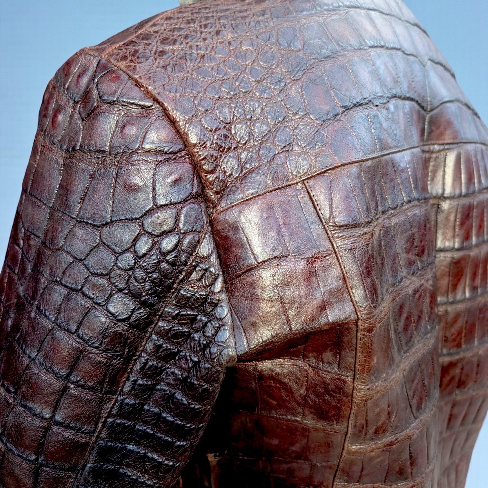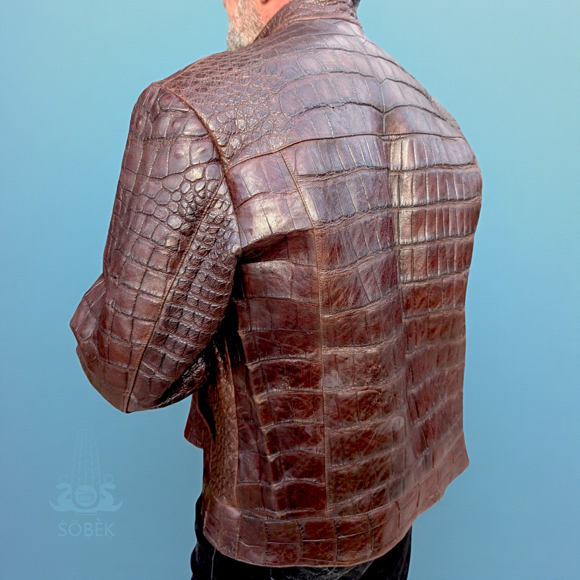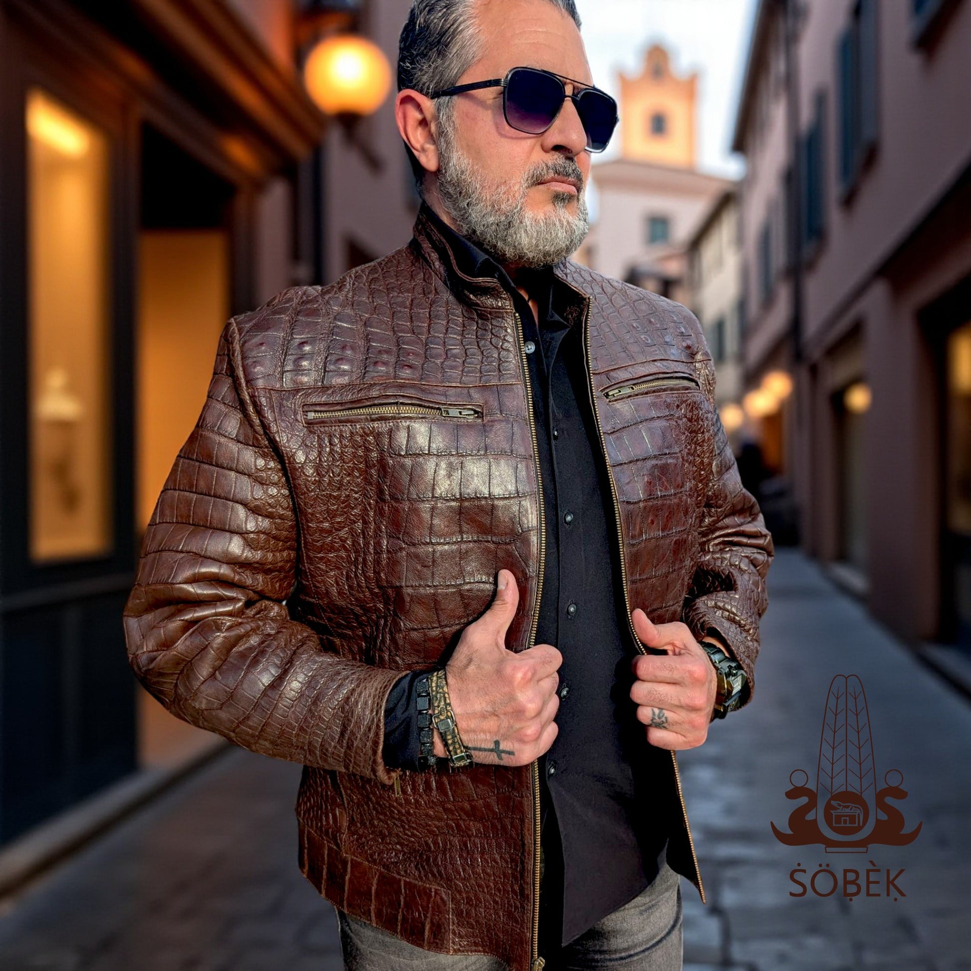 Elevate your wardrobe with this one-of-a-kind brown alligator leather bomber jacket, handcrafted from 100% genuine alligator skin. This statement piece blends the classic bomber silhouette with the rich texture and prestige of authentic alligator leather, creating a jacket that is as bold as it is timeless.
