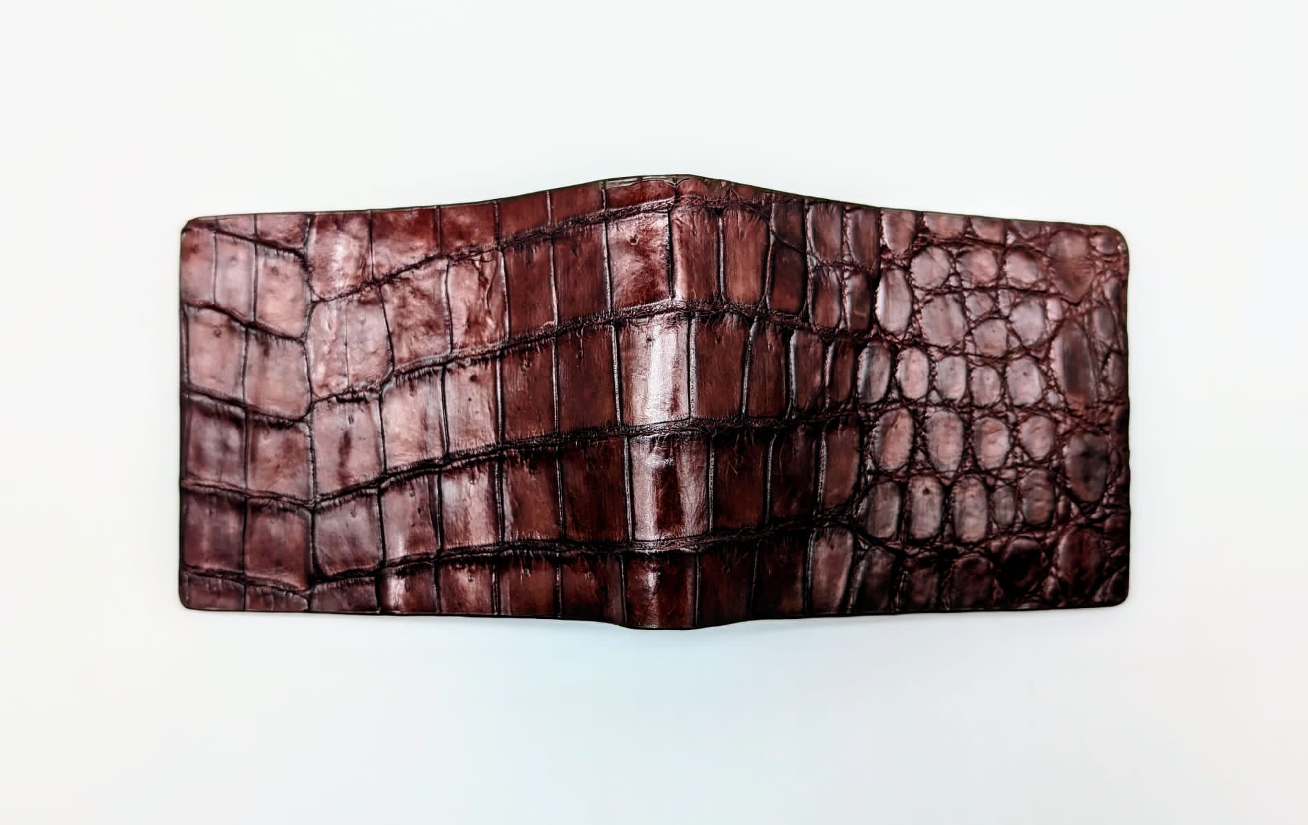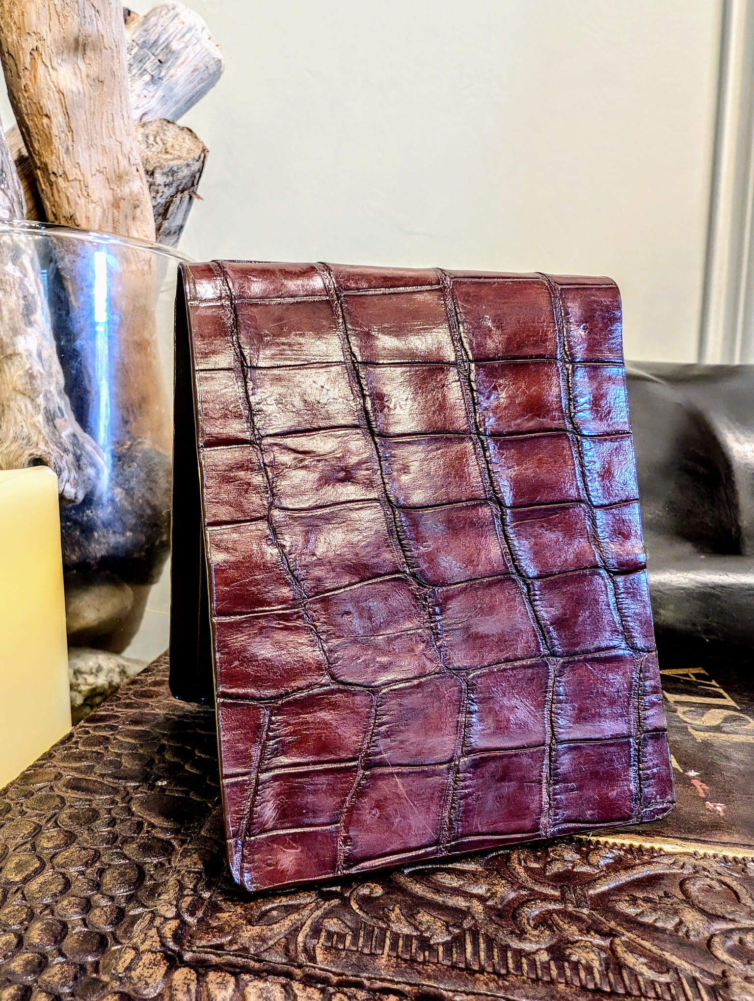 • Crafted from genuine alligator leather showcasing the unique scale patterns and unique texture in a glazed finish.