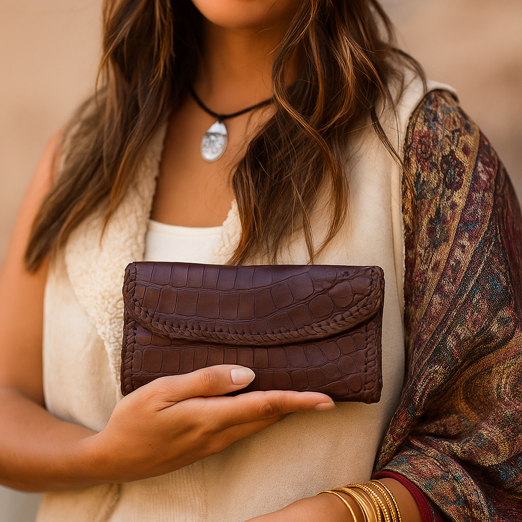 Indulge in the exquisite allure of this woman's clutch, meticulously handcrafted from alligator skin and artistically whipstitched by artisanal hands. Size: 3.5" H x 8" L x 1 W"