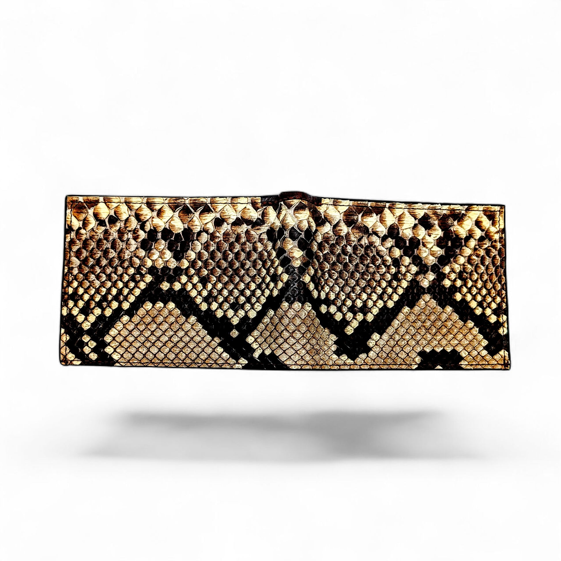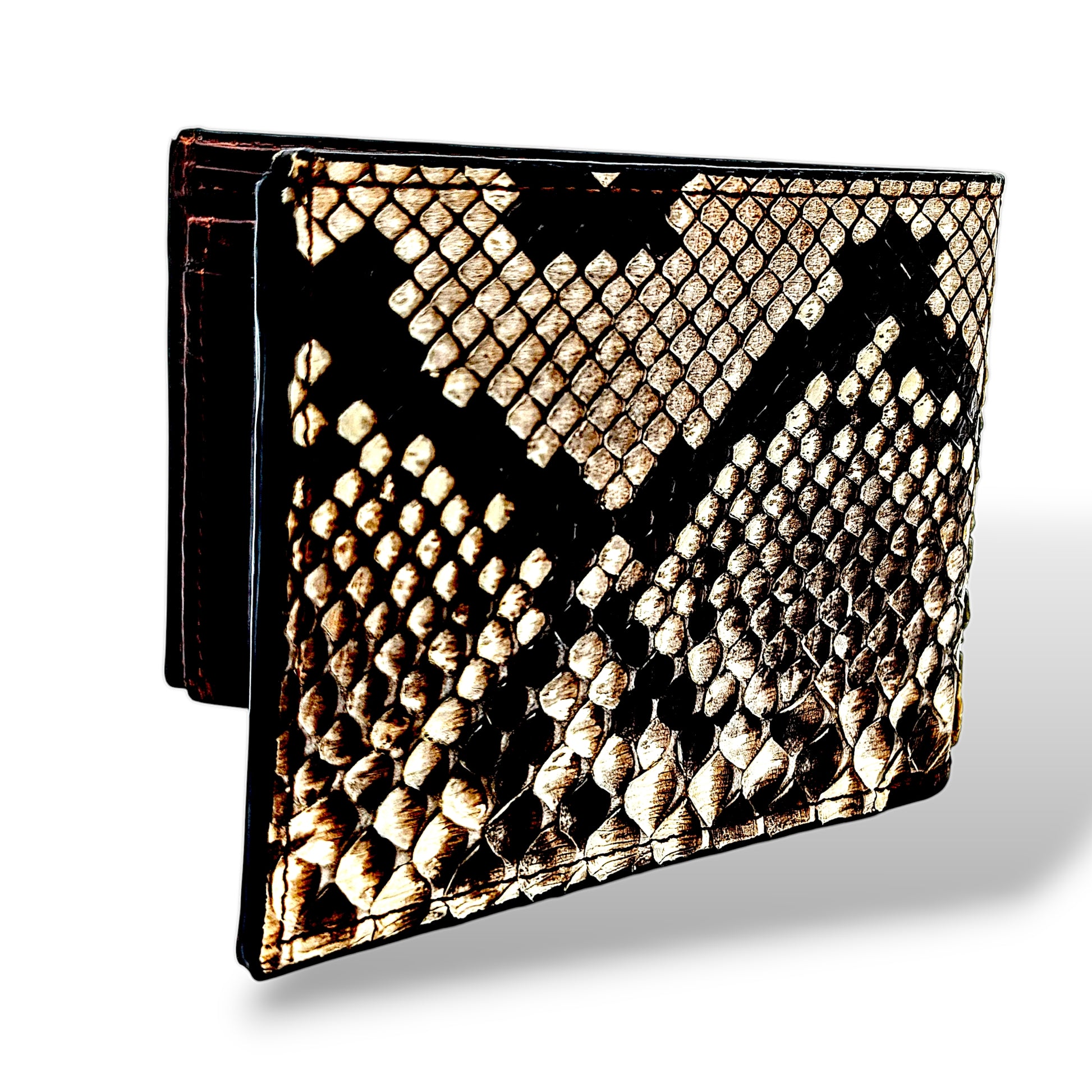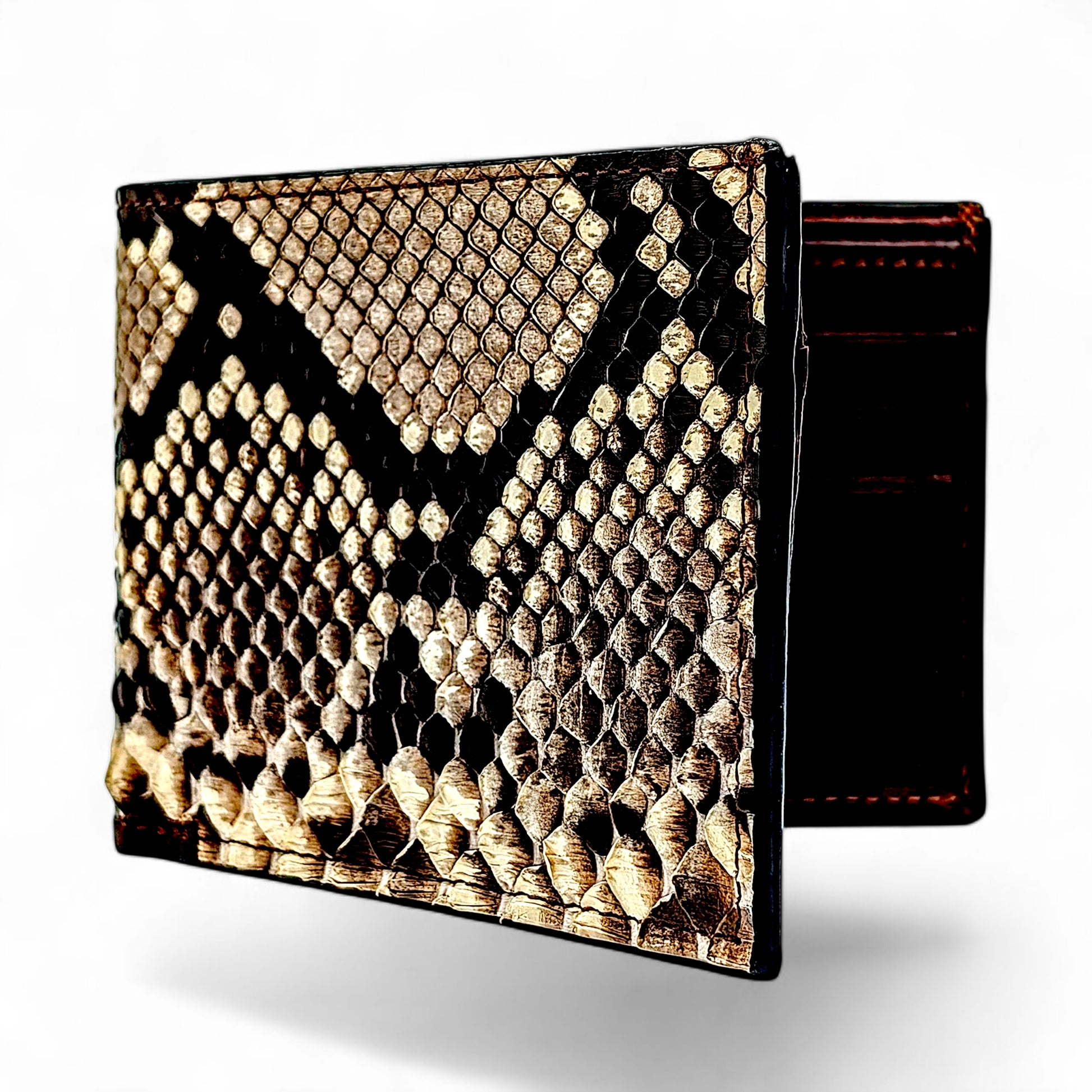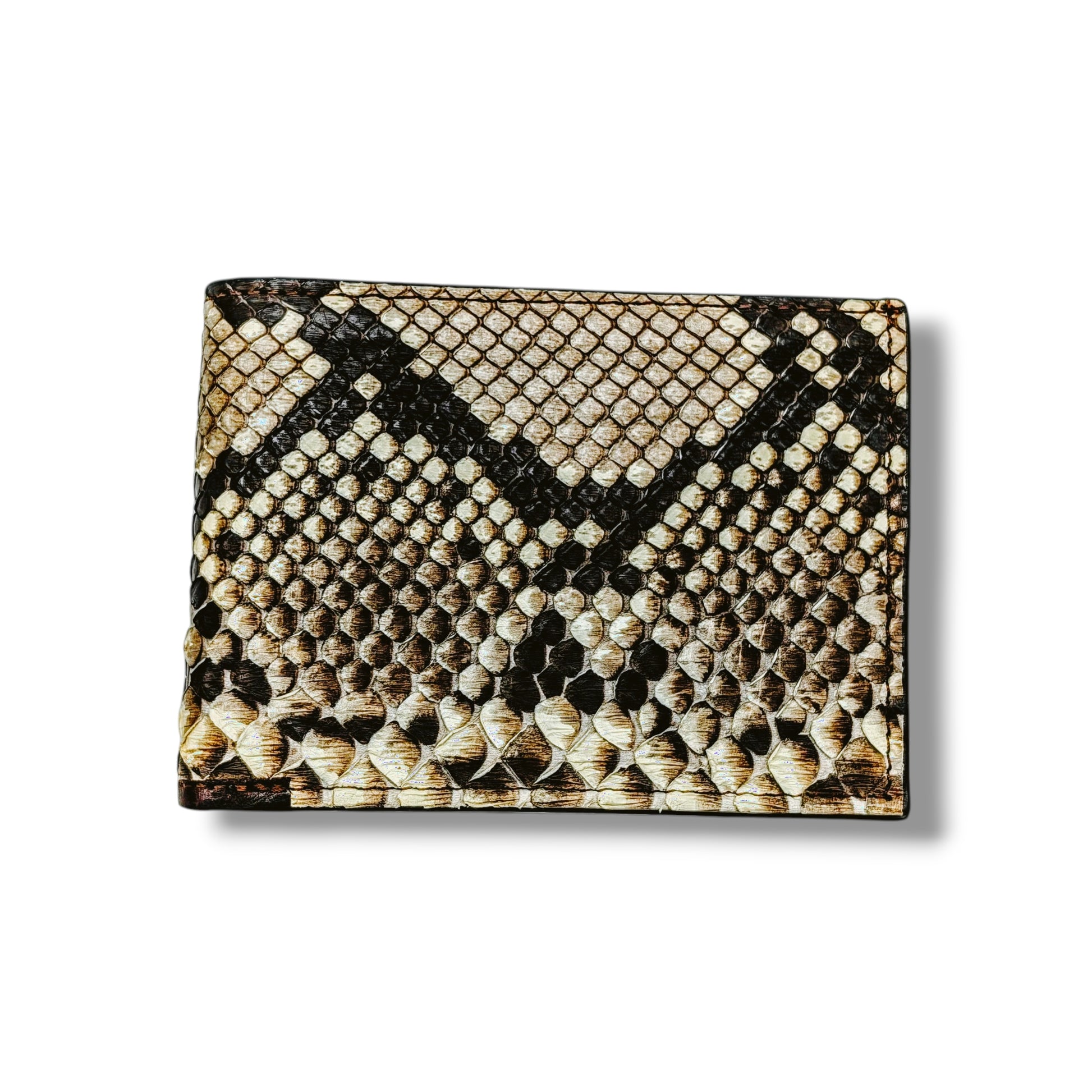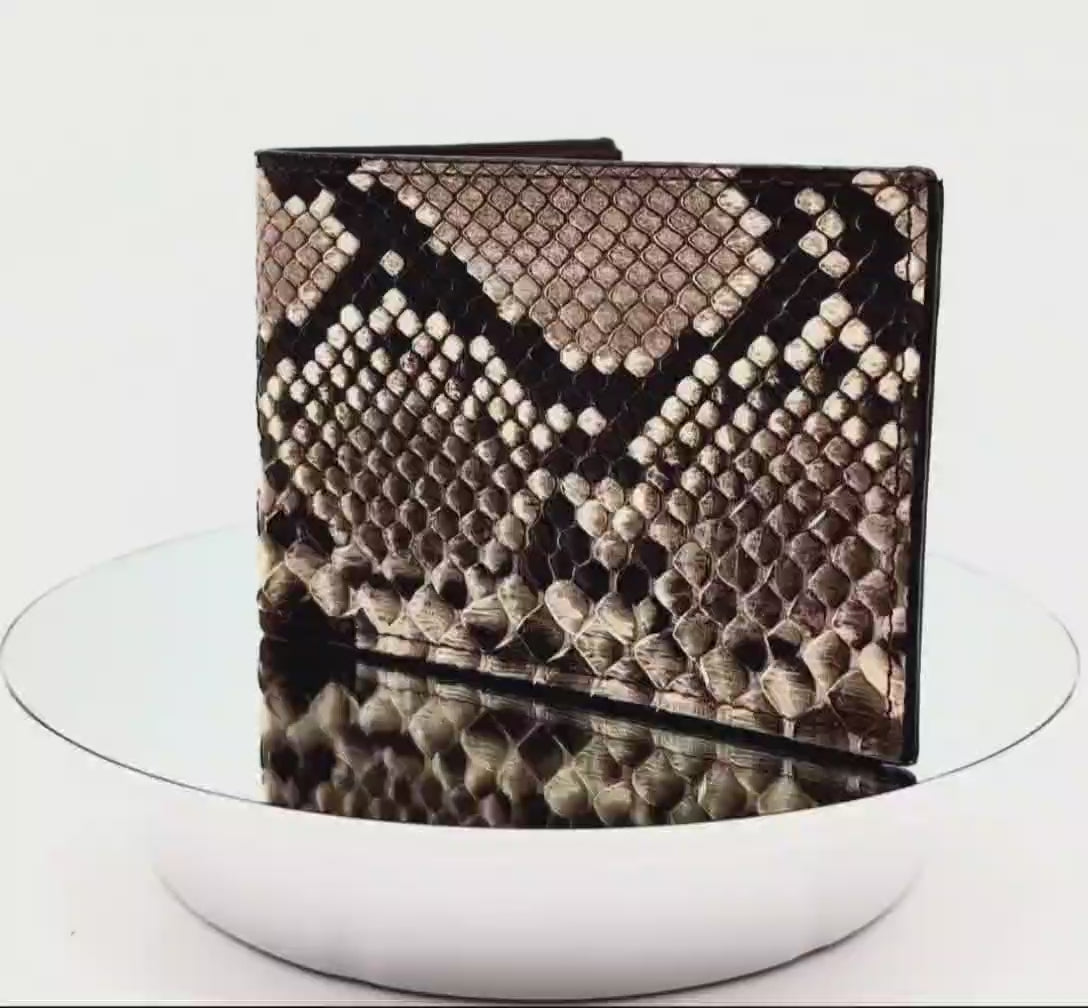 A wallet as bold as you are. This handcrafted bifold wallet features genuine python snakeskin in its natural scale pattern—showcasing dramatic diamond markings in shades of ivory, tan, and charcoal. The interior is crafted from premium brown leather with a rugged yet refined finish, making this wallet a true piece of functional art.