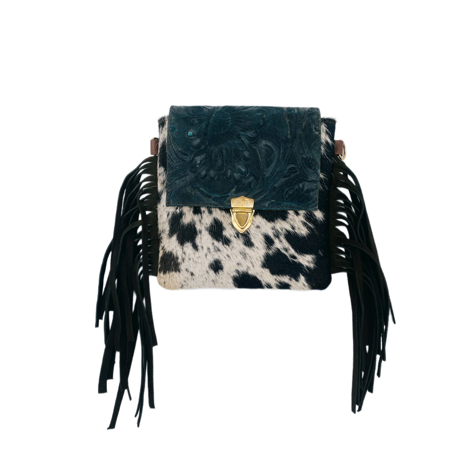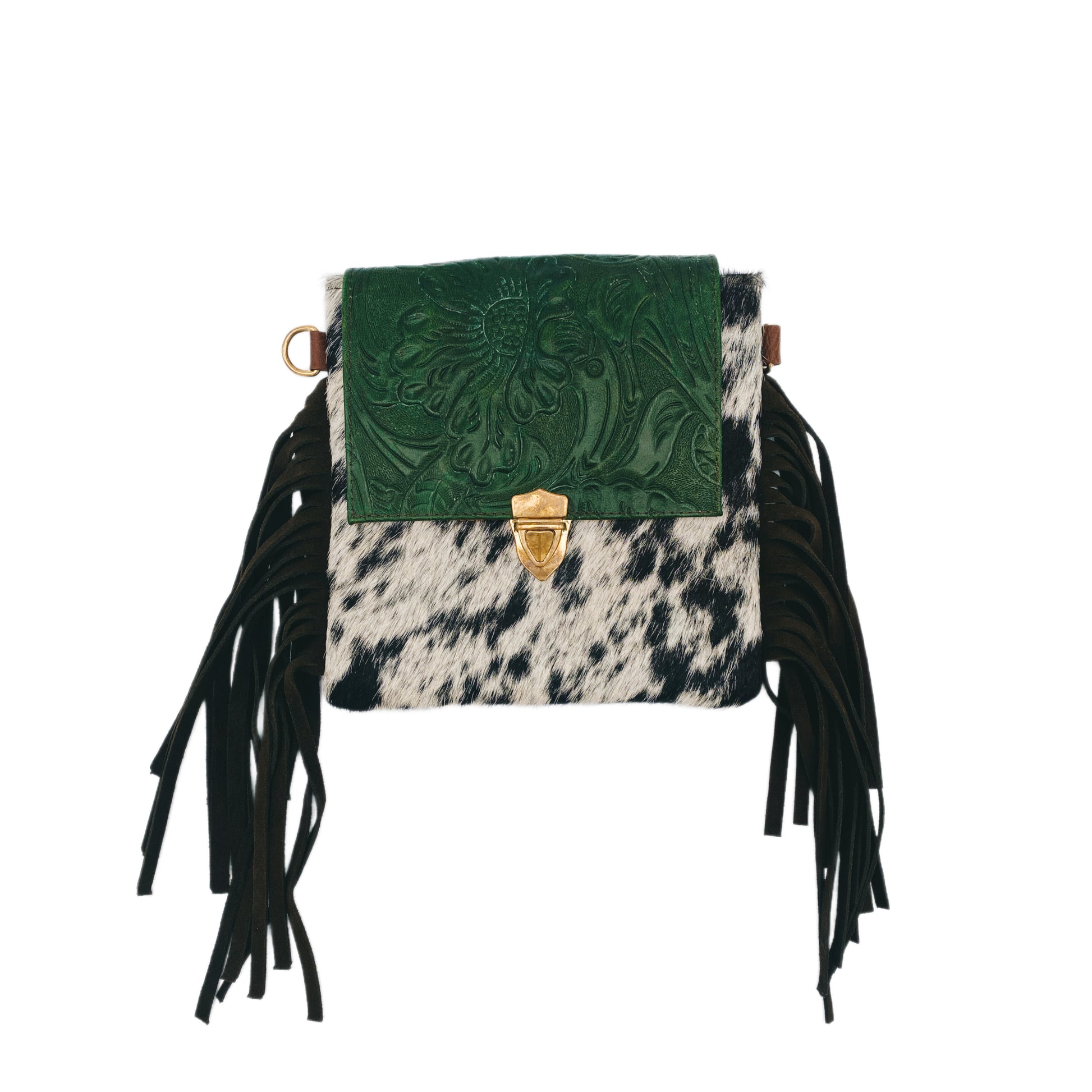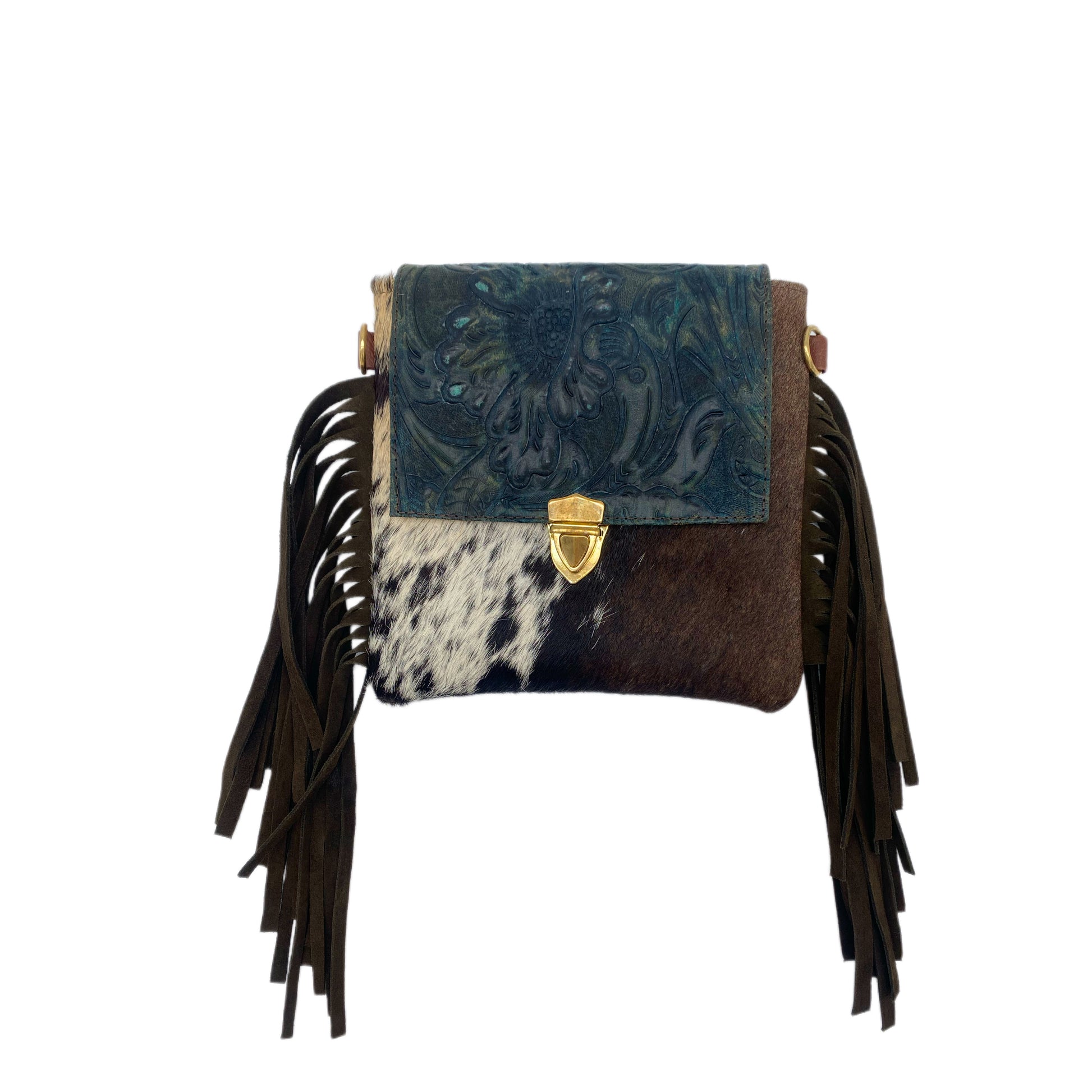 • 8.5"L x 8.5"H x 0.5"W Di-color genuine cowhide and leather construction with a handmade floral print design • Features fringed detailing for an eye-catching look • Compact design is perfect for carrying essentials • Convenient and versatile, perfect for any occasion • Secures with a clip closure.