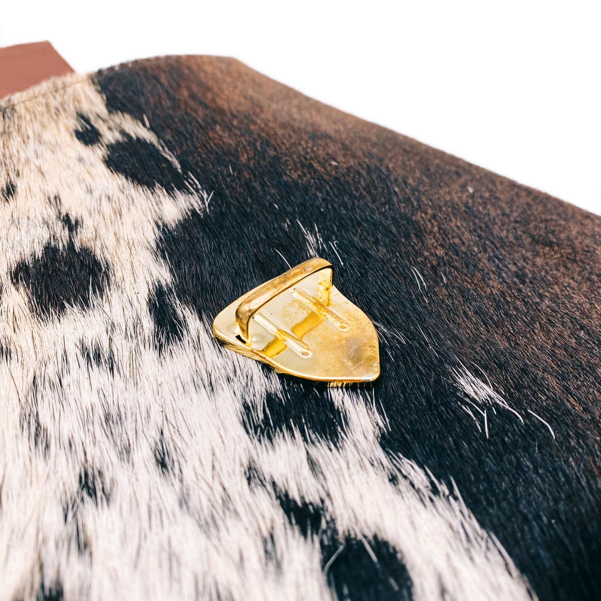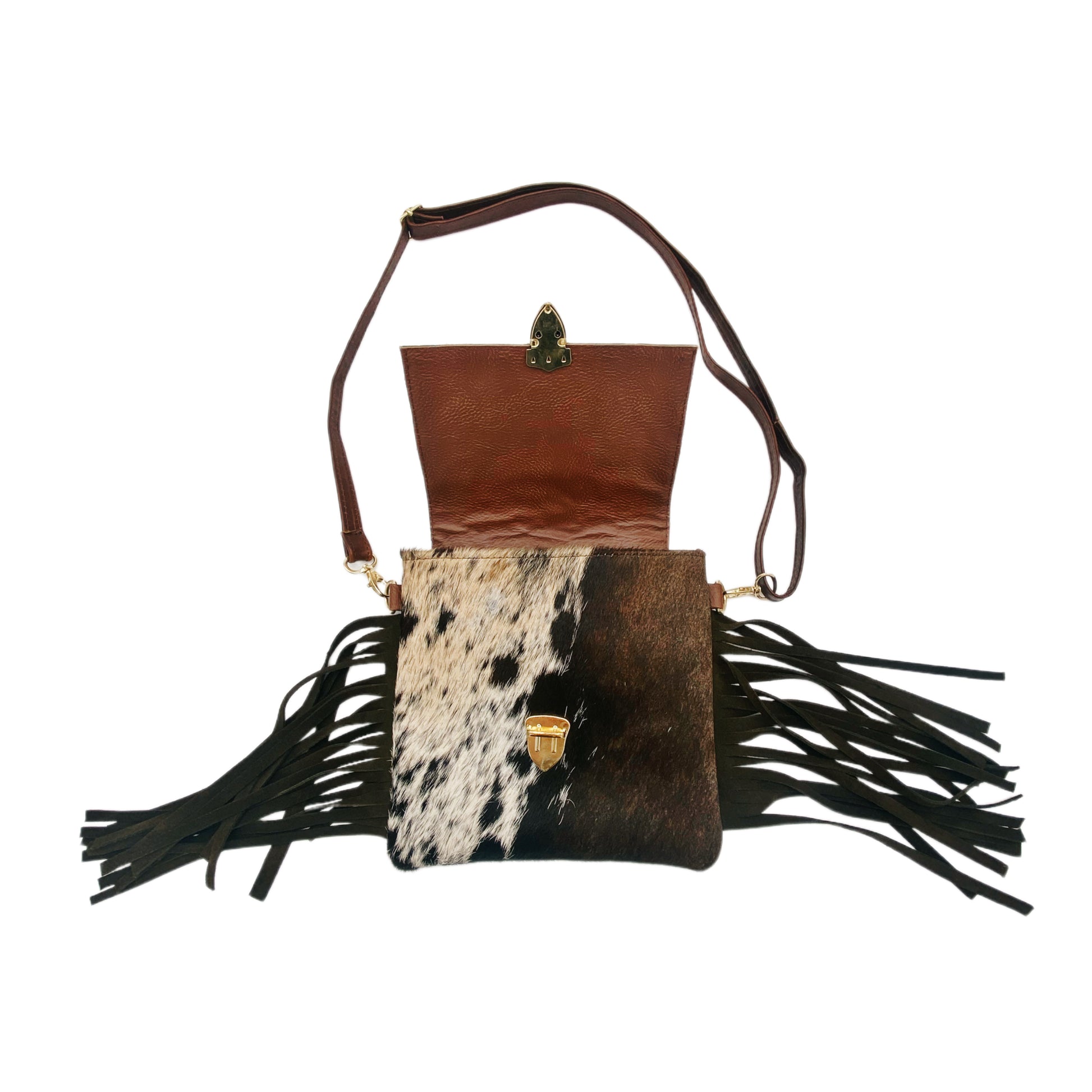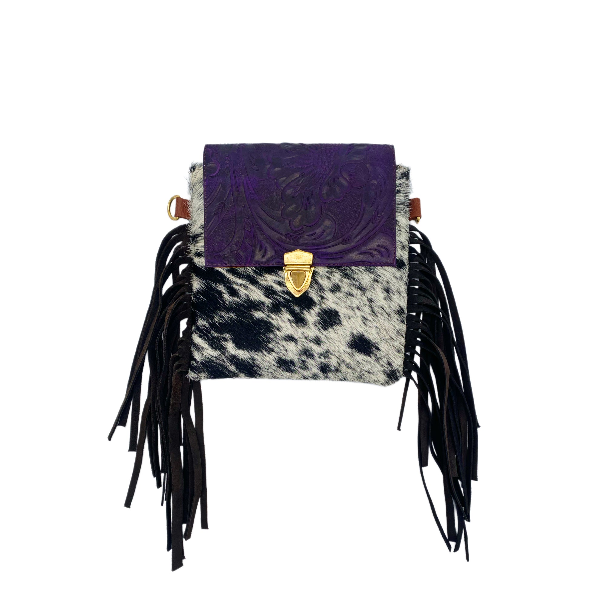 • 8.5"L x 8.5"H x 0.5"W Di-color genuine cowhide and leather construction with a handmade floral print design • Features fringed detailing for an eye-catching look • Compact design is perfect for carrying essentials • Convenient and versatile, perfect for any occasion • Secures with a clip closure.