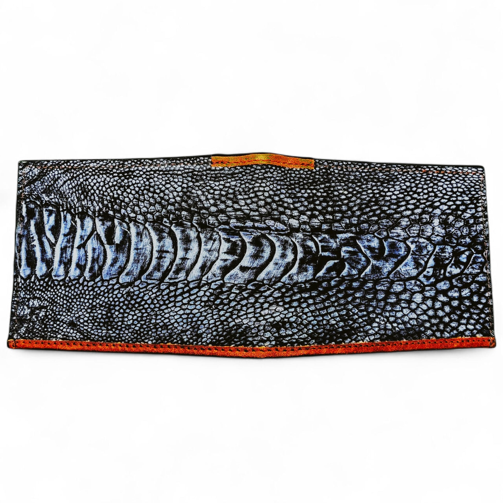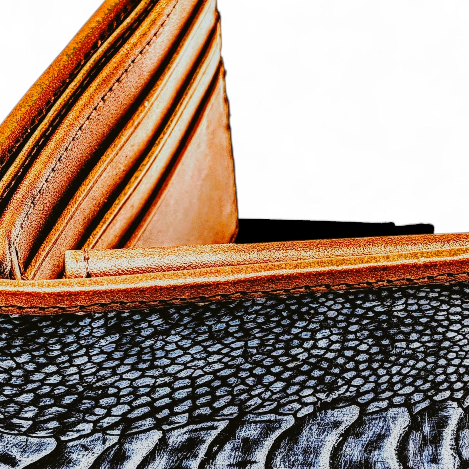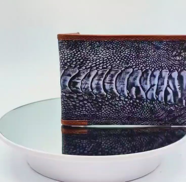 Own a piece of exotic craftsmanship. This genuine ostrich leg bifold wallet in a blue jean suede finish is a bold expression of natural texture and refined style. The rugged scale patterns and soft matte finish are complemented by a warm brown leather interior, offering a perfect blend of wild character and everyday function.
