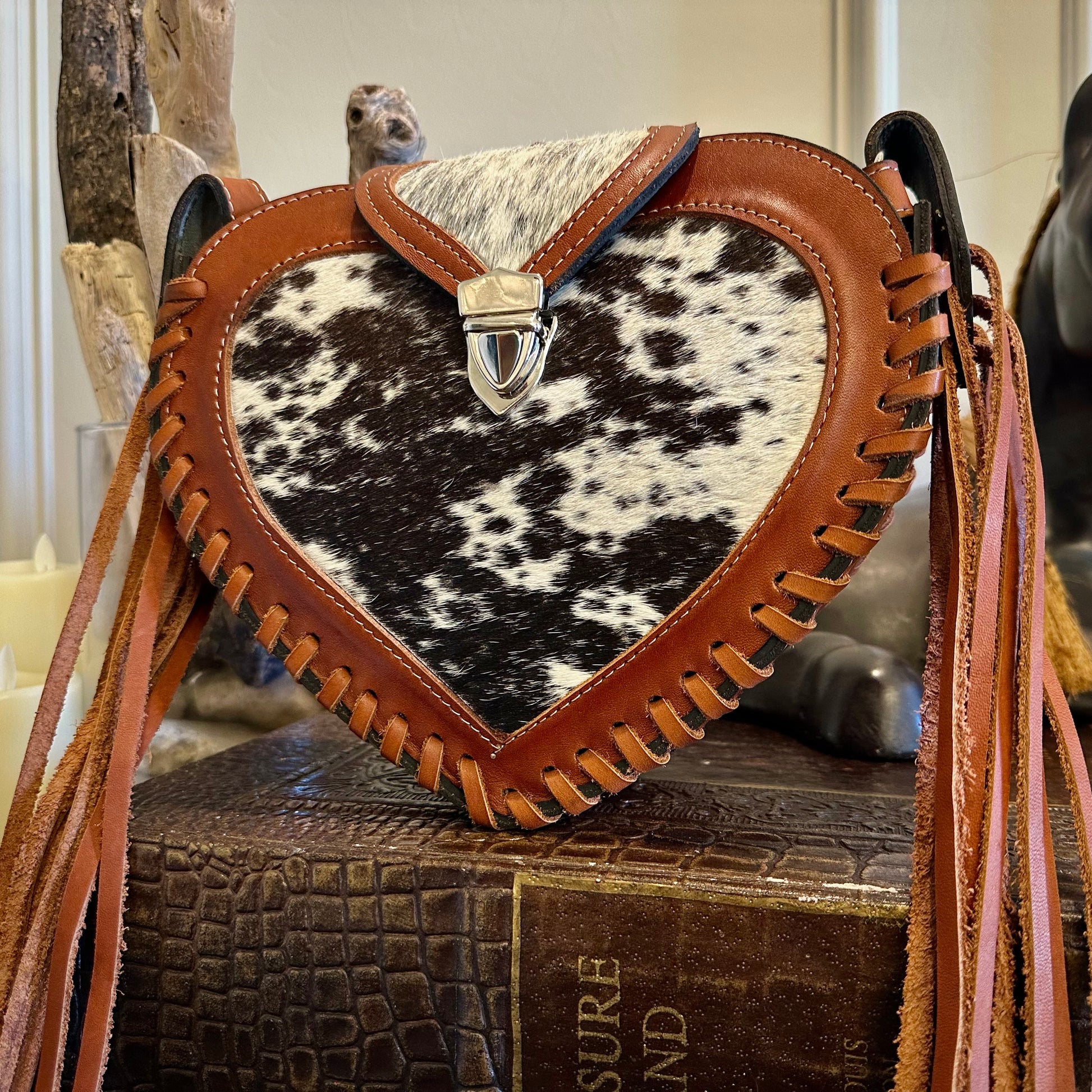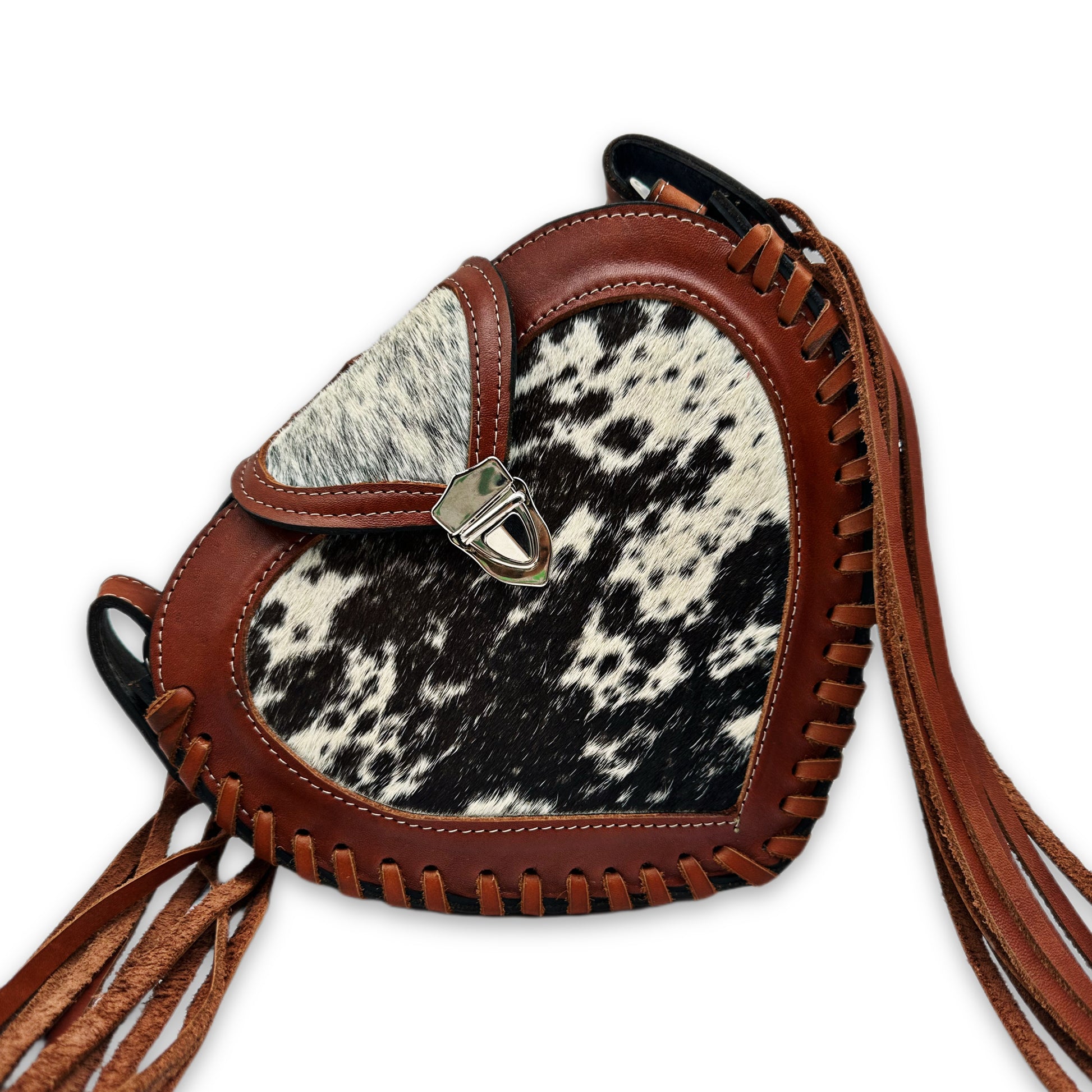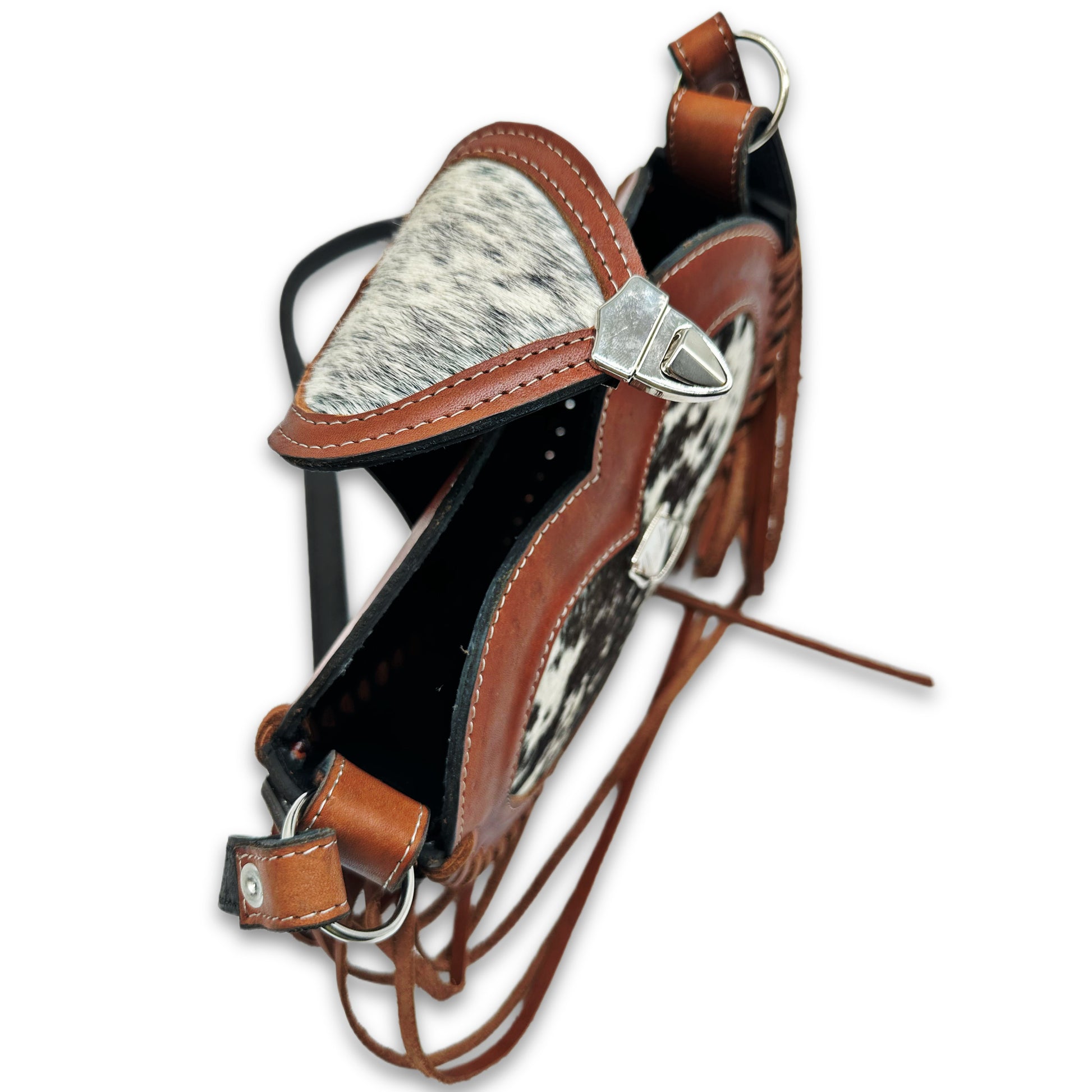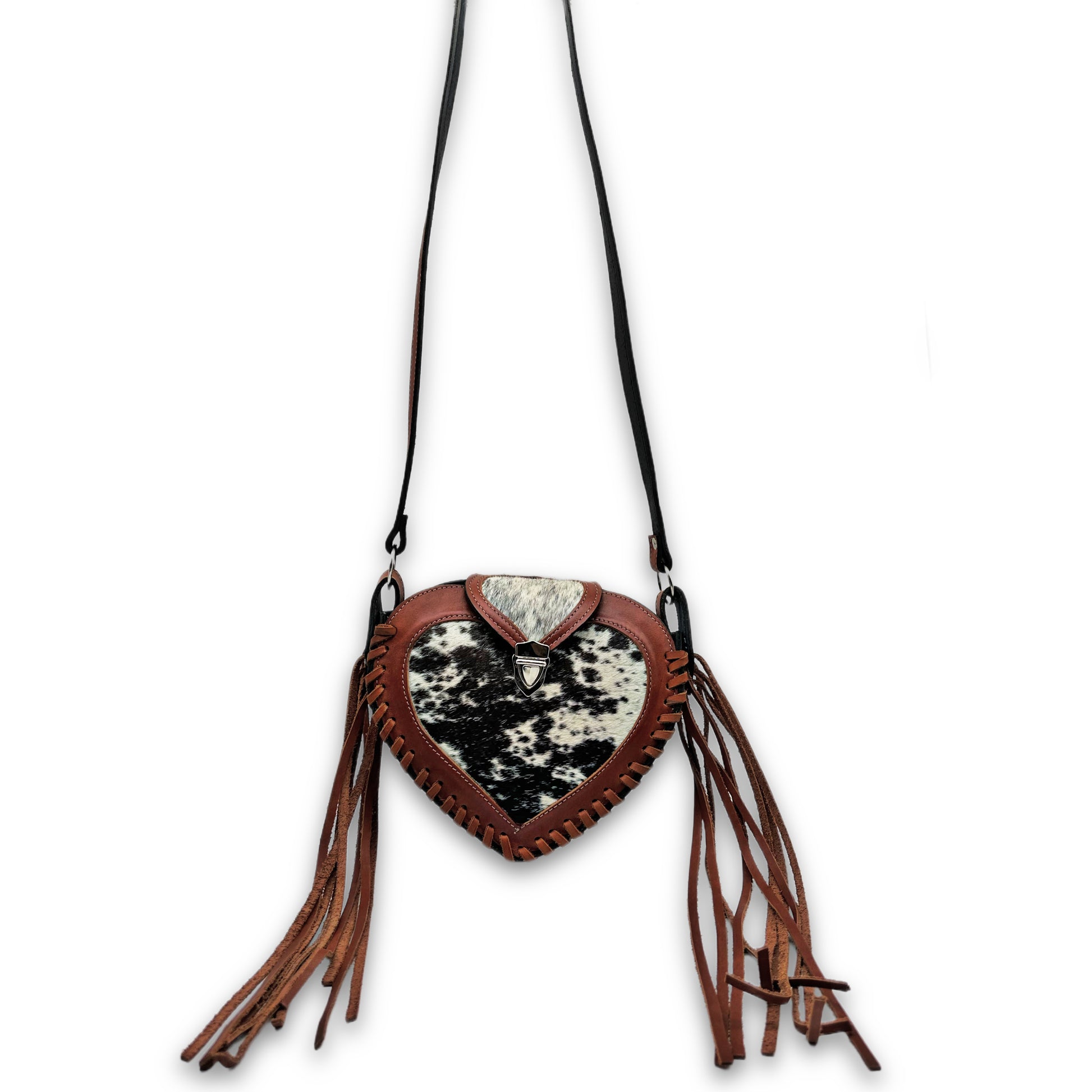 • The use of real cowhide adds a touch of rustic charm and further enhances the bag's natural appeal.This purse displays expert whip stitching in leather strappings , fringe, and a push closure for keeping your items safe and secure. This bag exudes quality!
