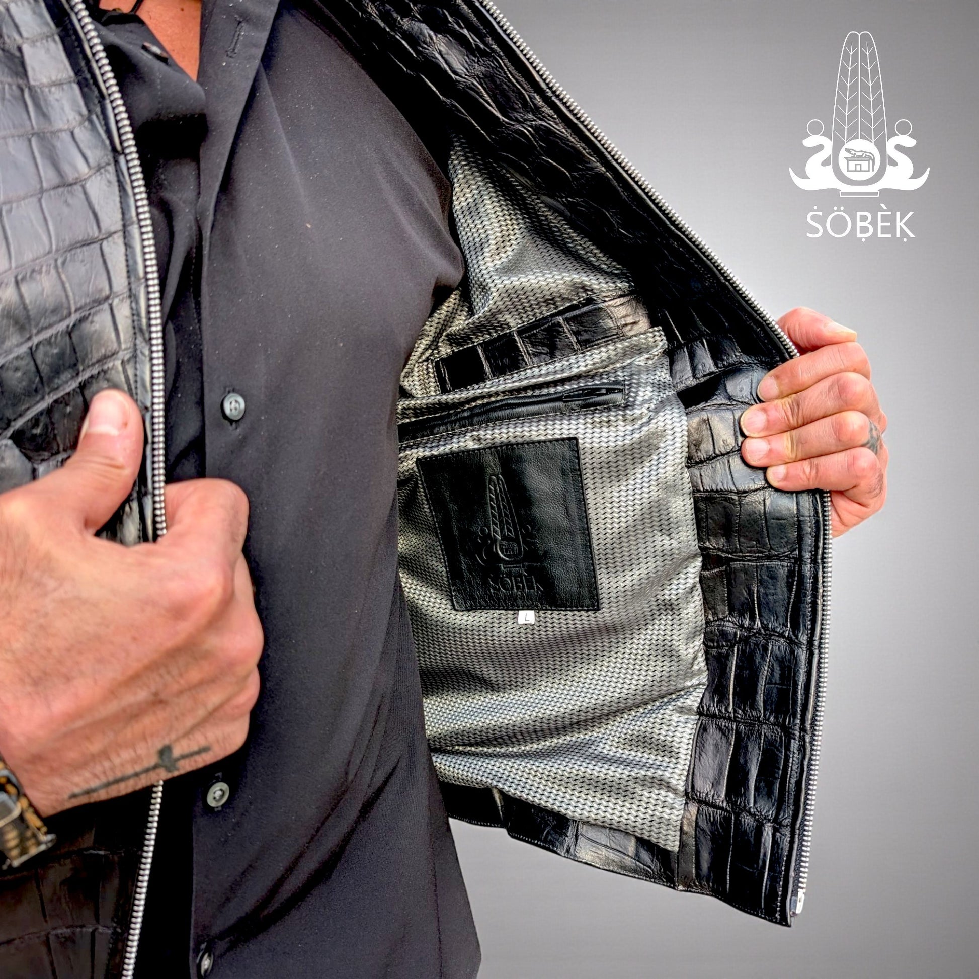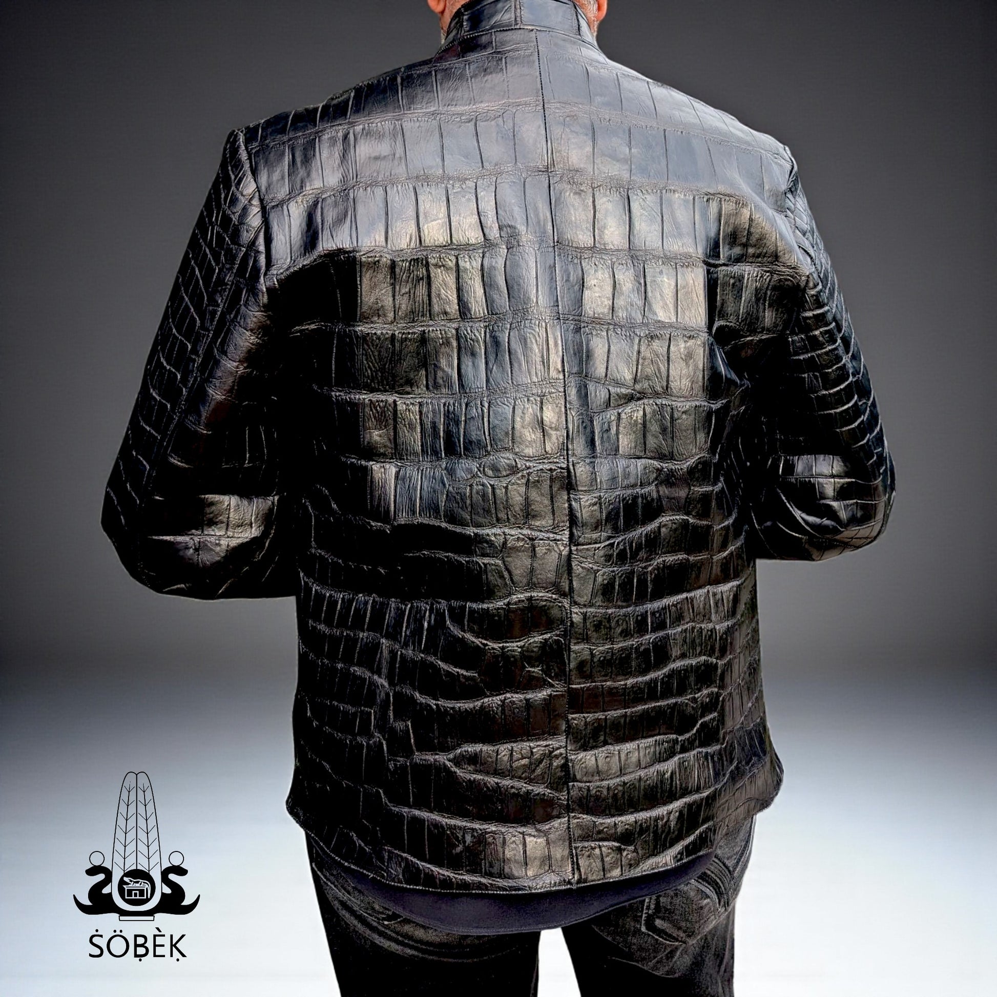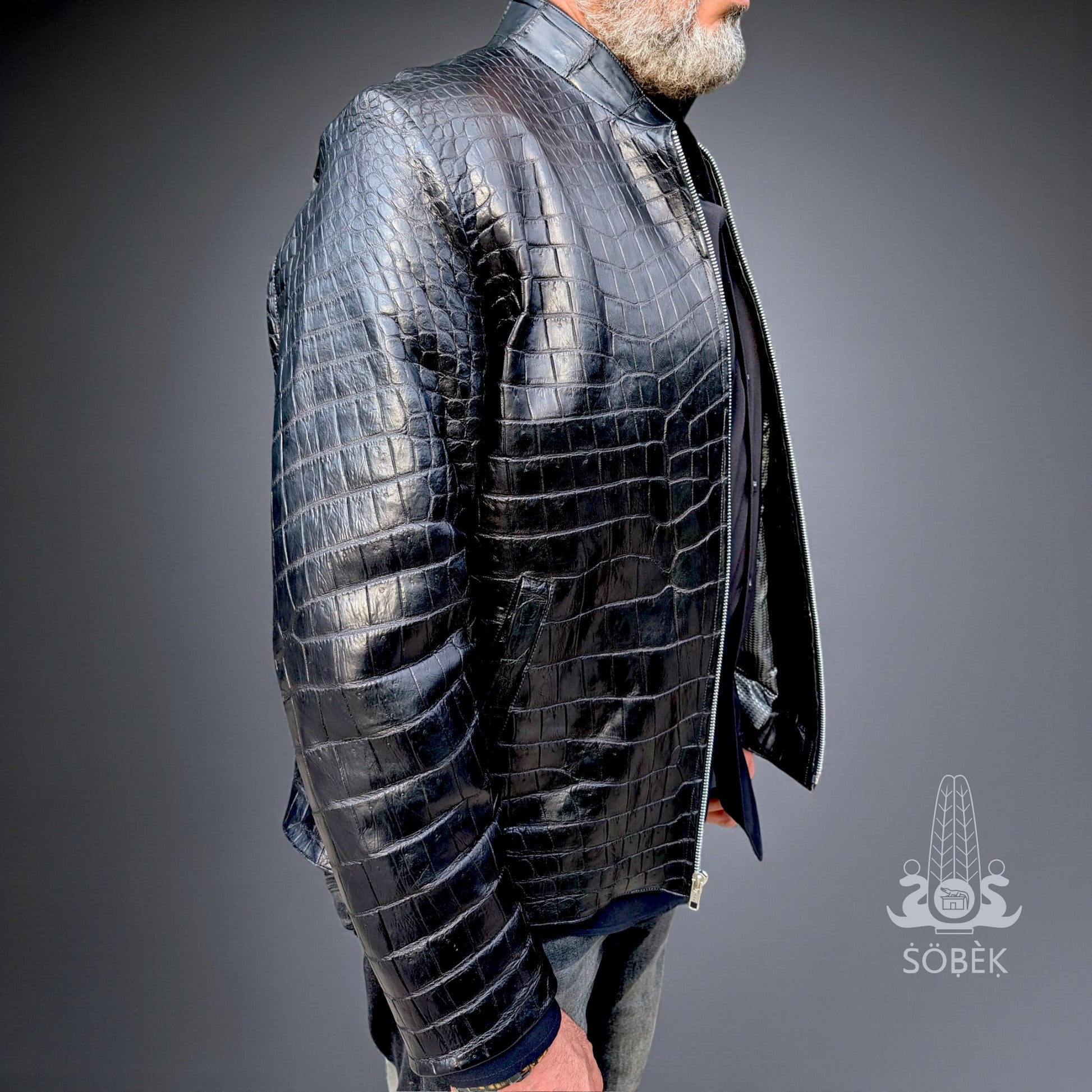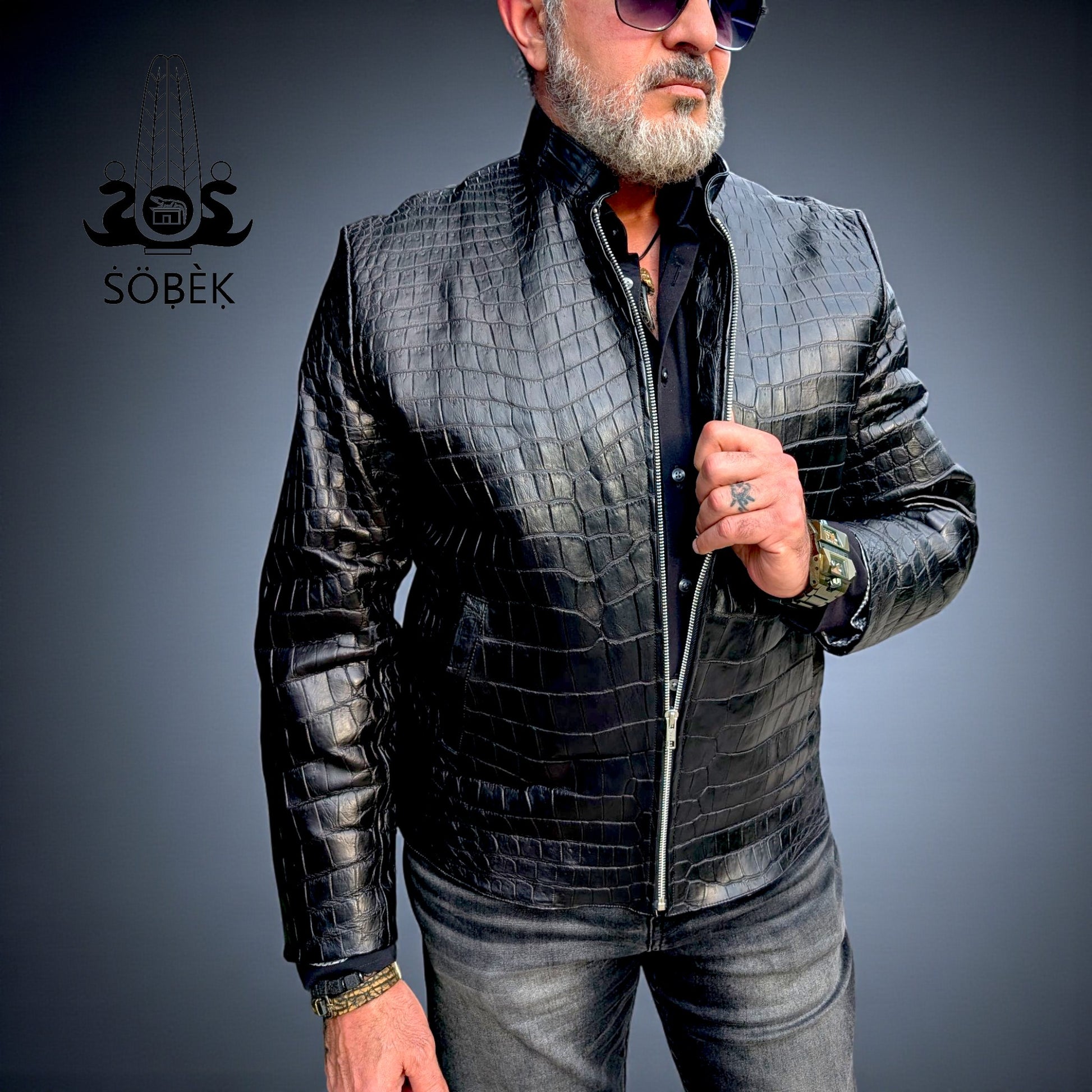 Men’s Black Alligator Leather Jacket – Luxury Exotic Skin Stand-Collar Bomber – Size XL
