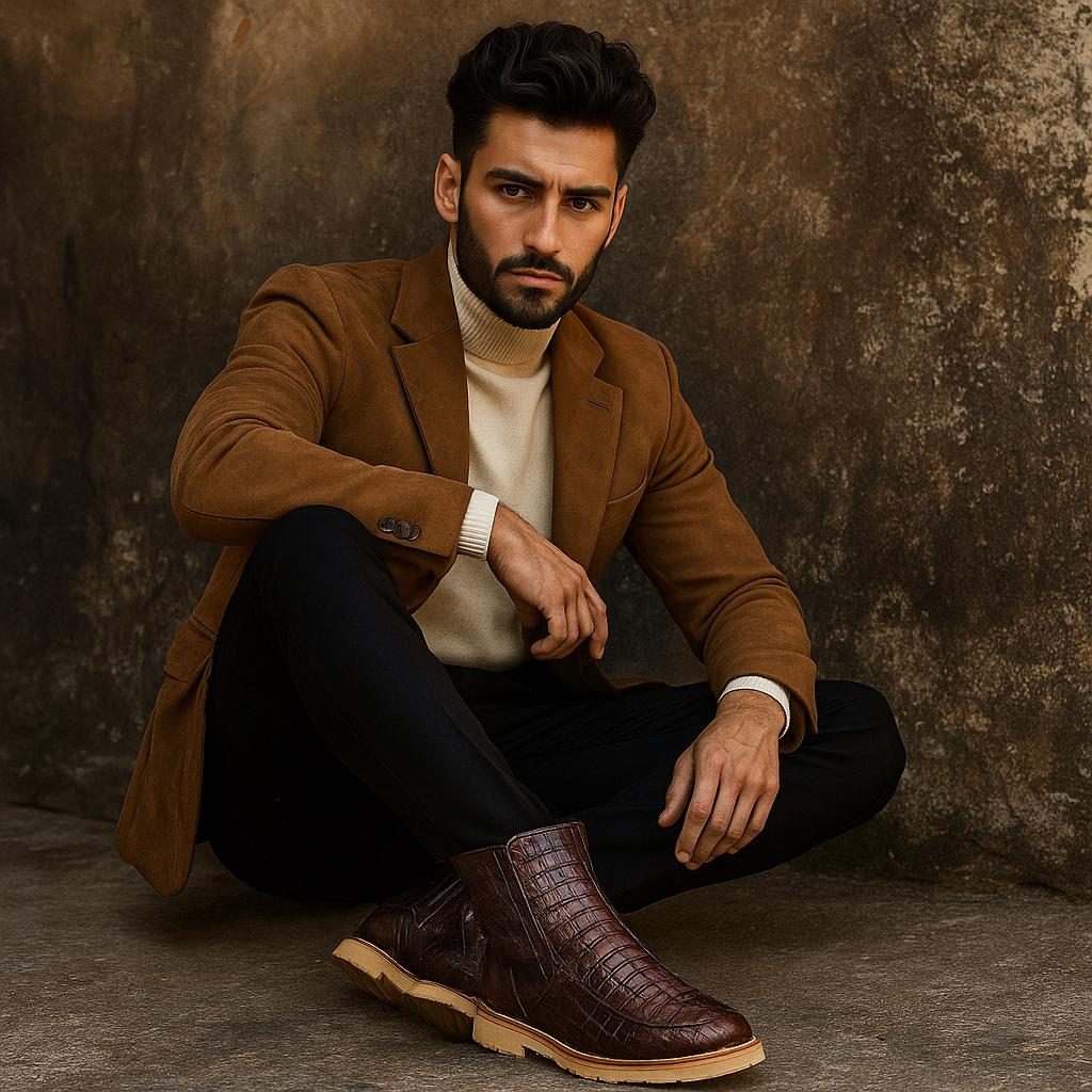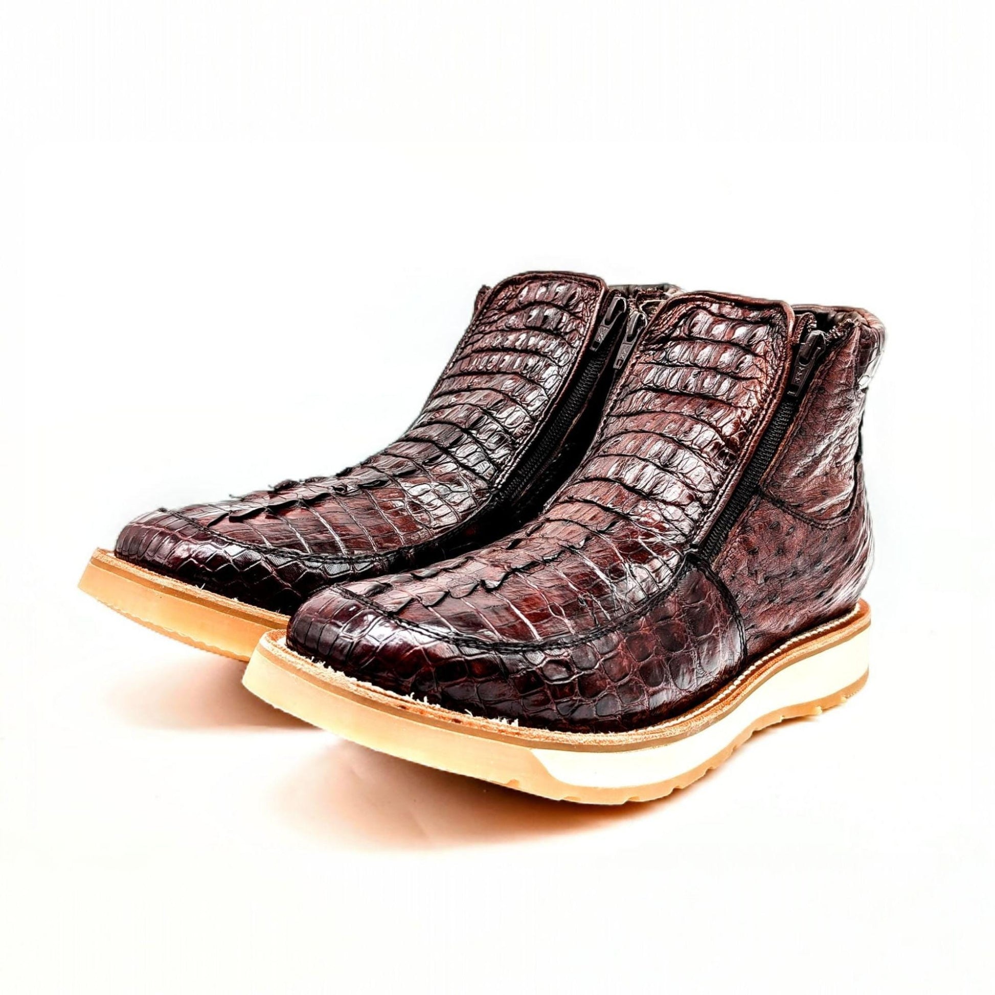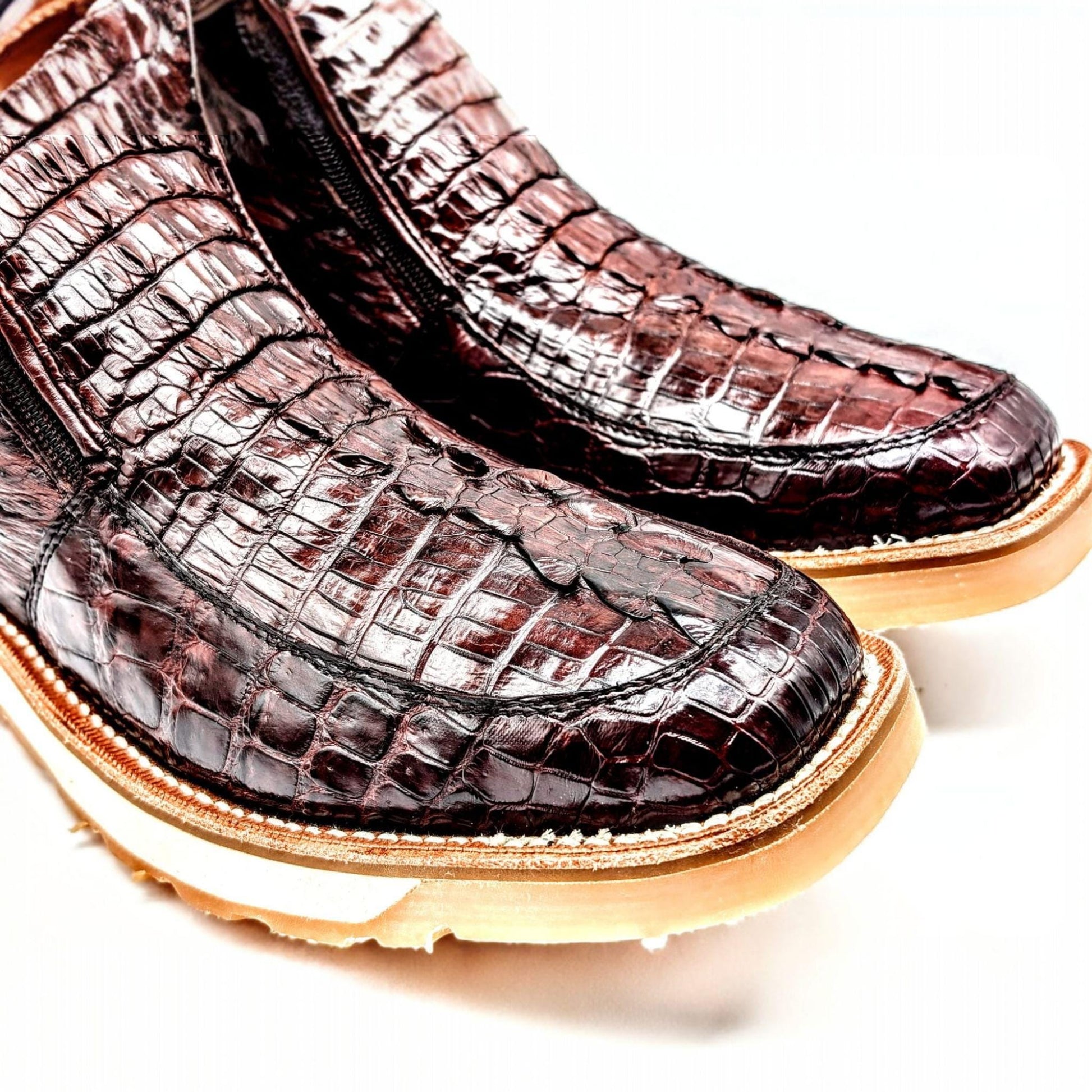 Step into unparalleled luxury and individuality with these Men‘s Premium Handmade Alligator Tail & Ostrich Leather Ankle Boots from Sobek. Expertly crafted using the renowned Goodyear welt technique, each pair is a one-of-a-kind masterpiece, blending the exotic allure of alligator leather with the distinctive texture of ostrich leather. The glossy alligator leather forms the main body, while the heel side features ostrich leather, identifiable by its unique quill points, adding an extra layer of sophistication and character. No two skins are the same, ensuring your boots are as distinctive as you are.