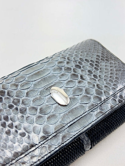 • This is a One of a Kind luxury handbag you will not find anywhere else! It is hand crafted from ethically sourced Italian python and lizard leather of the finest quality. This clutch is beautifully embellished with a silver Egyptian scarab representing rebirth and regeneration.