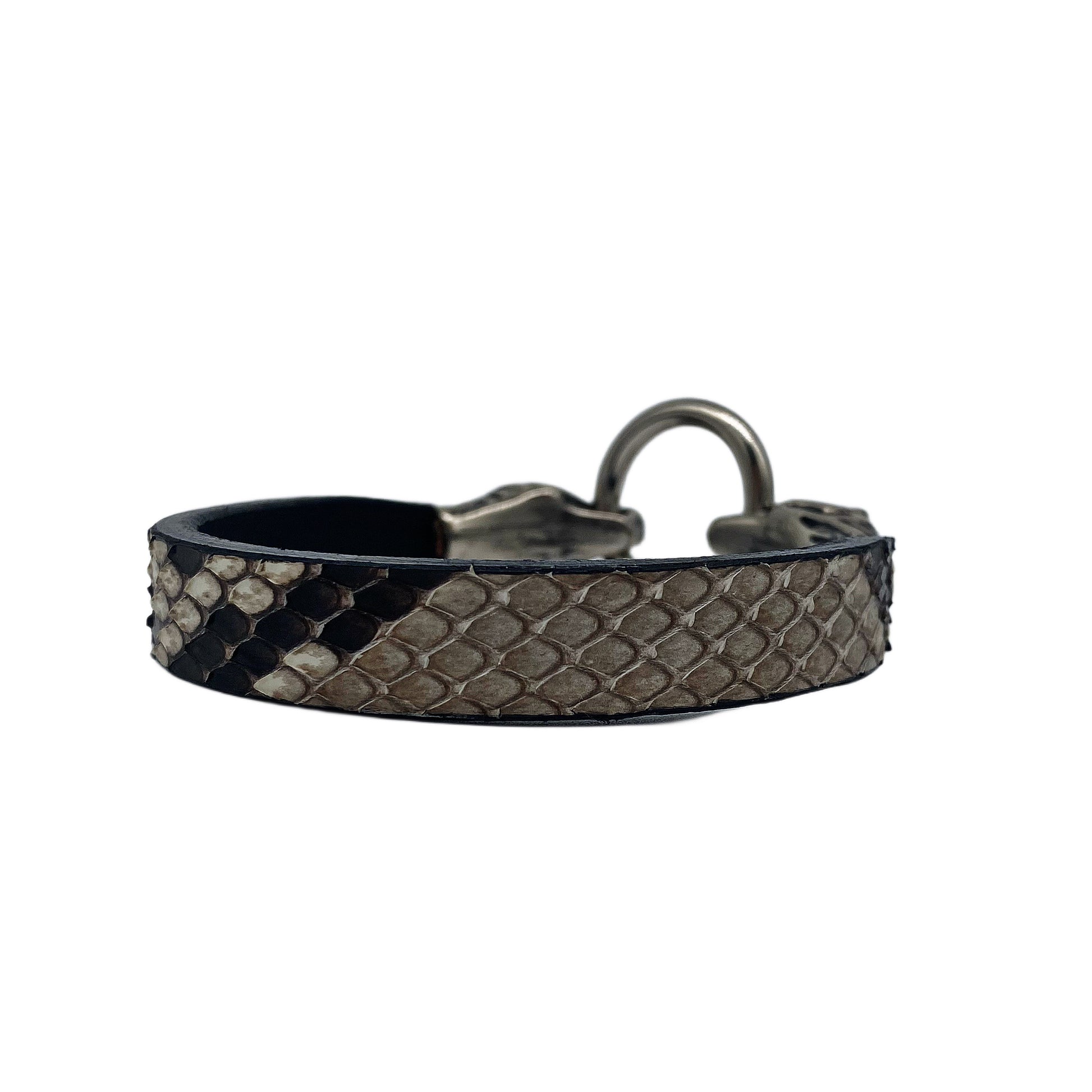 • With its distinctive python skin, this bracelet is a standout accessory, perfect for those who want to make a statement. It features silver python head embellishments as attachments, adding an elegant touch to the overall design.