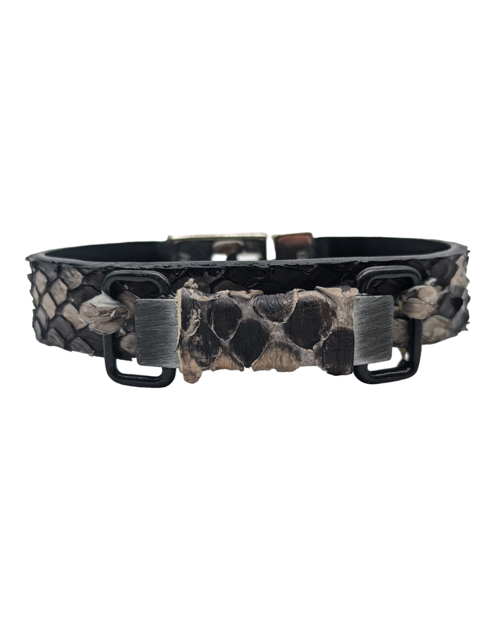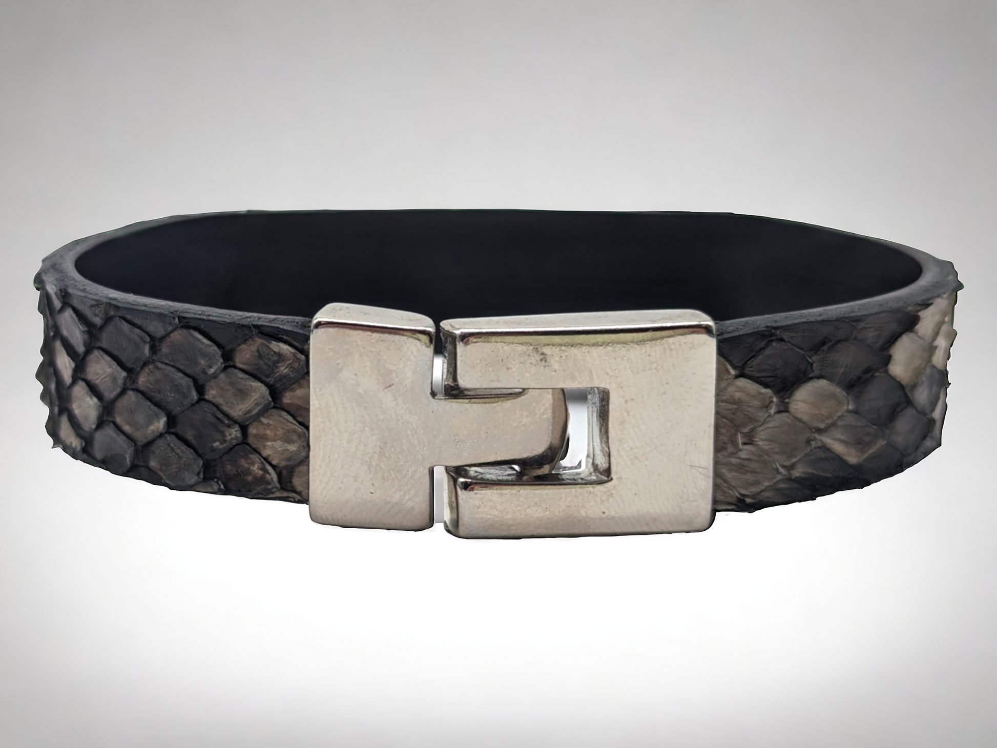 • With its distinctive python skin, this bracelet is a standout accessory, perfect for those who want to make a statement. It features silver python head embellishments as attachments, adding an elegant touch to the overall design.