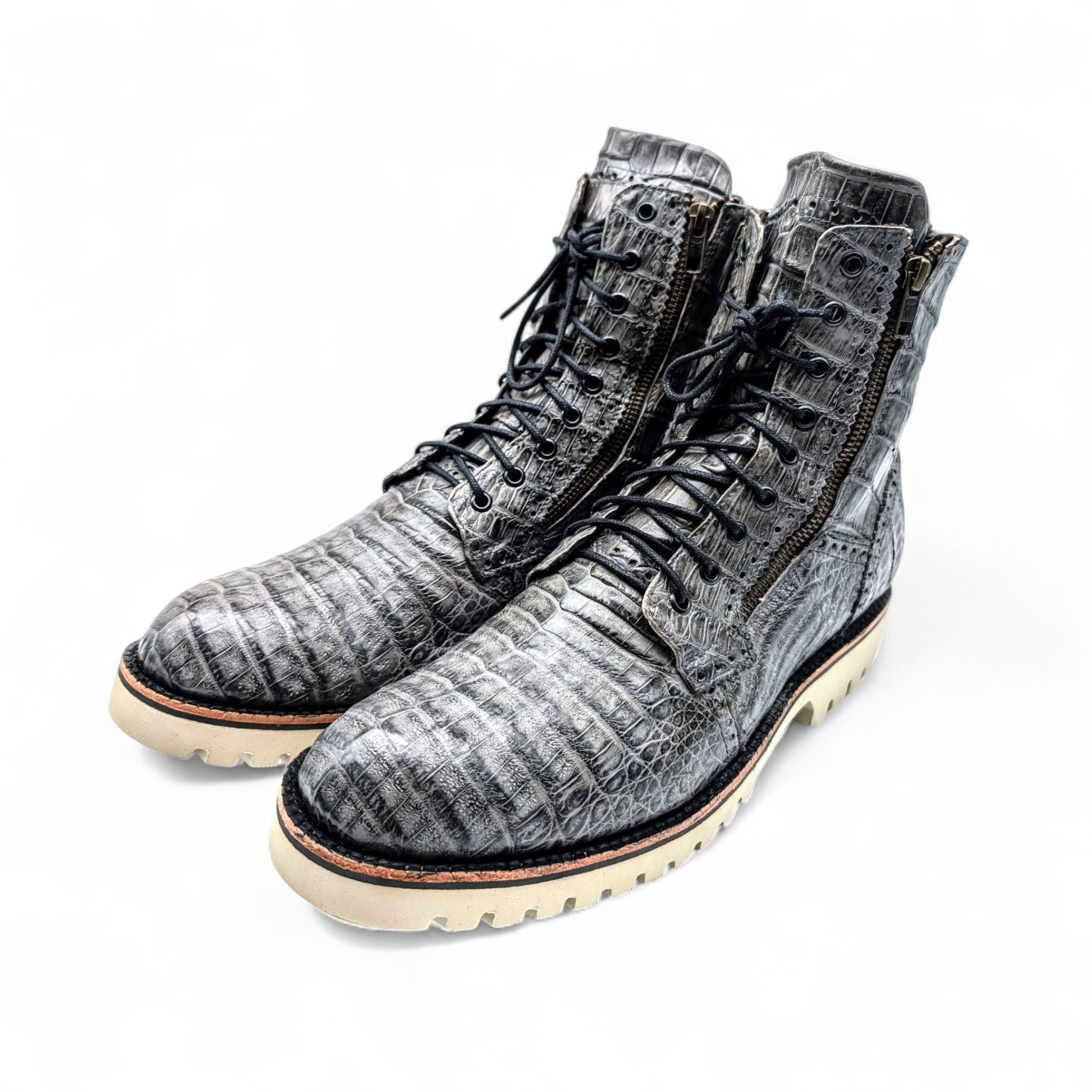 Make an impression with Sobèk's Gunmetal Grey Lace Up Alligator Boots - the ultimate fusion of style and substance in footwear.