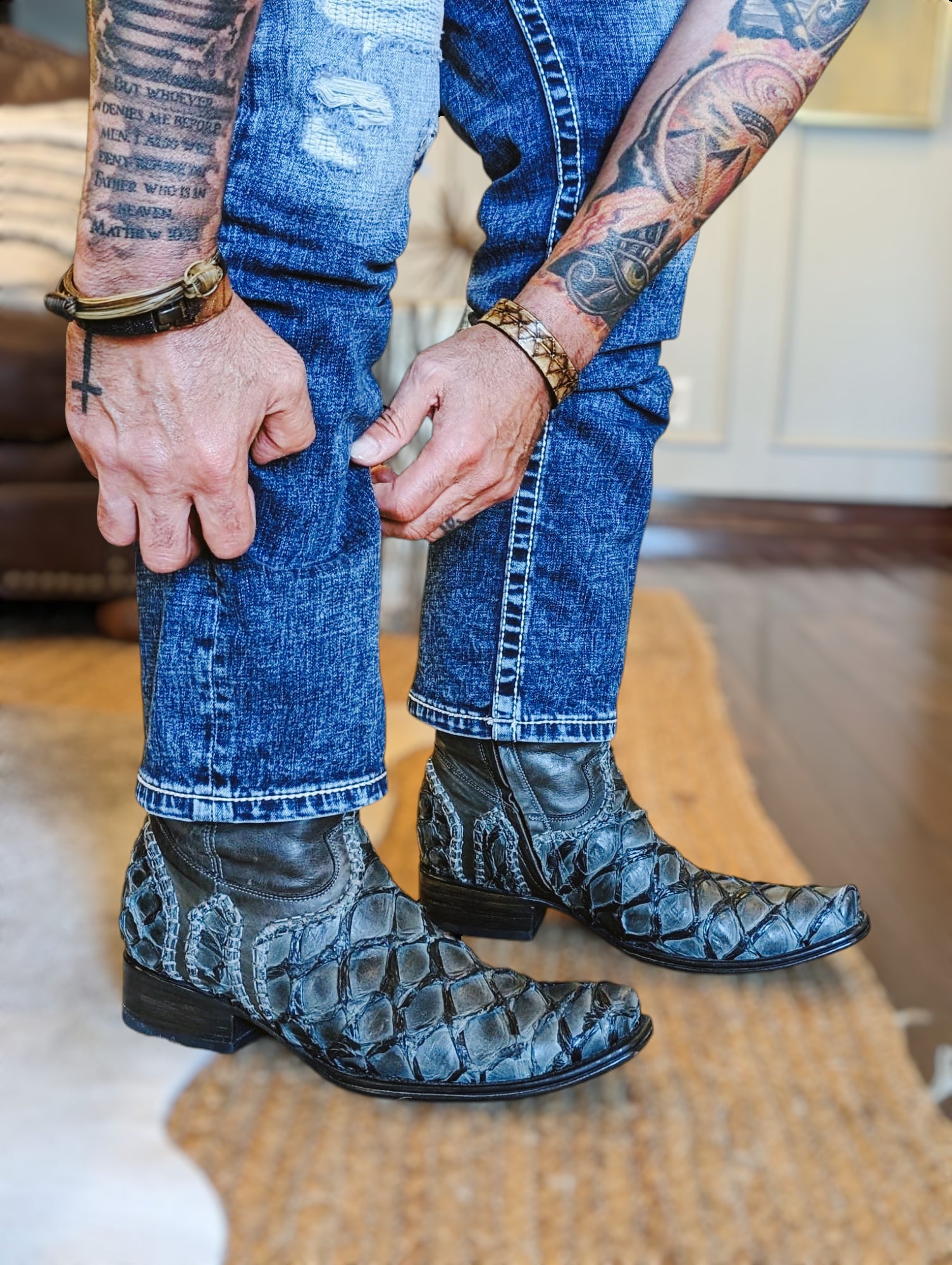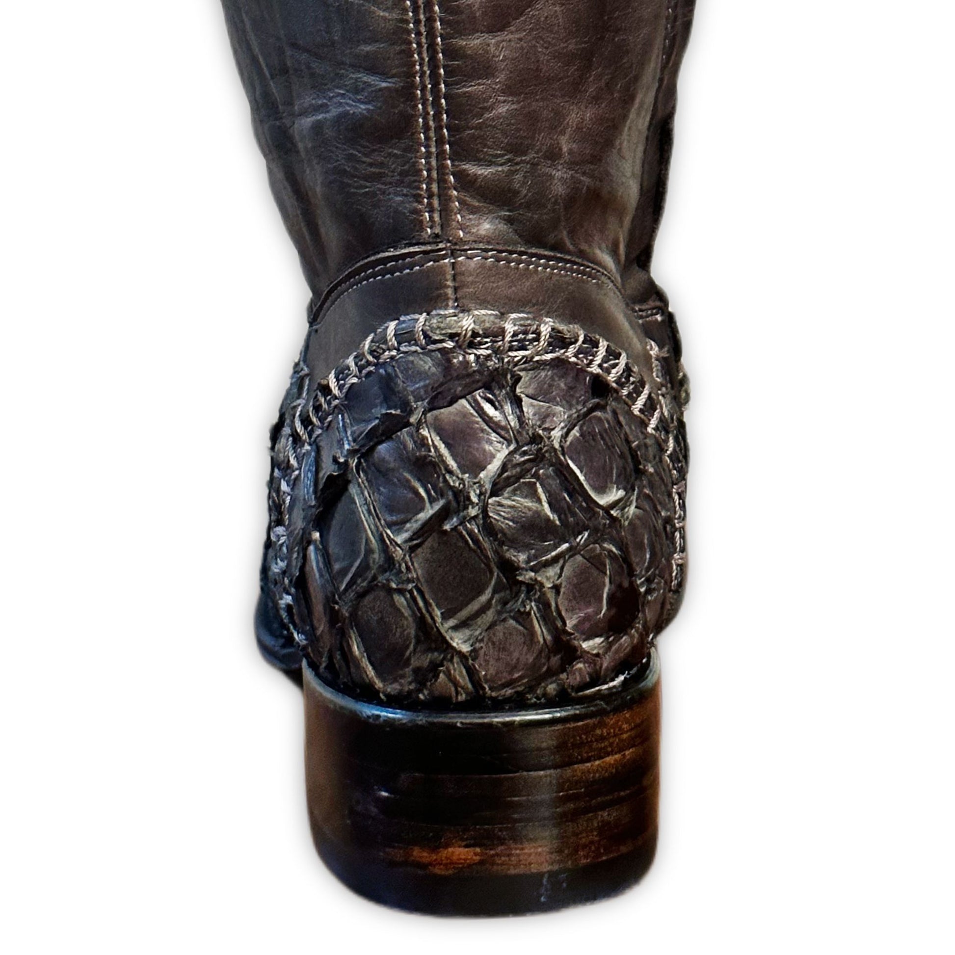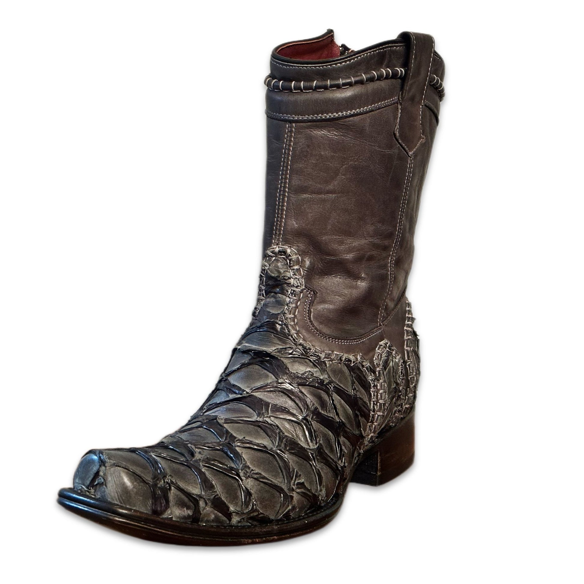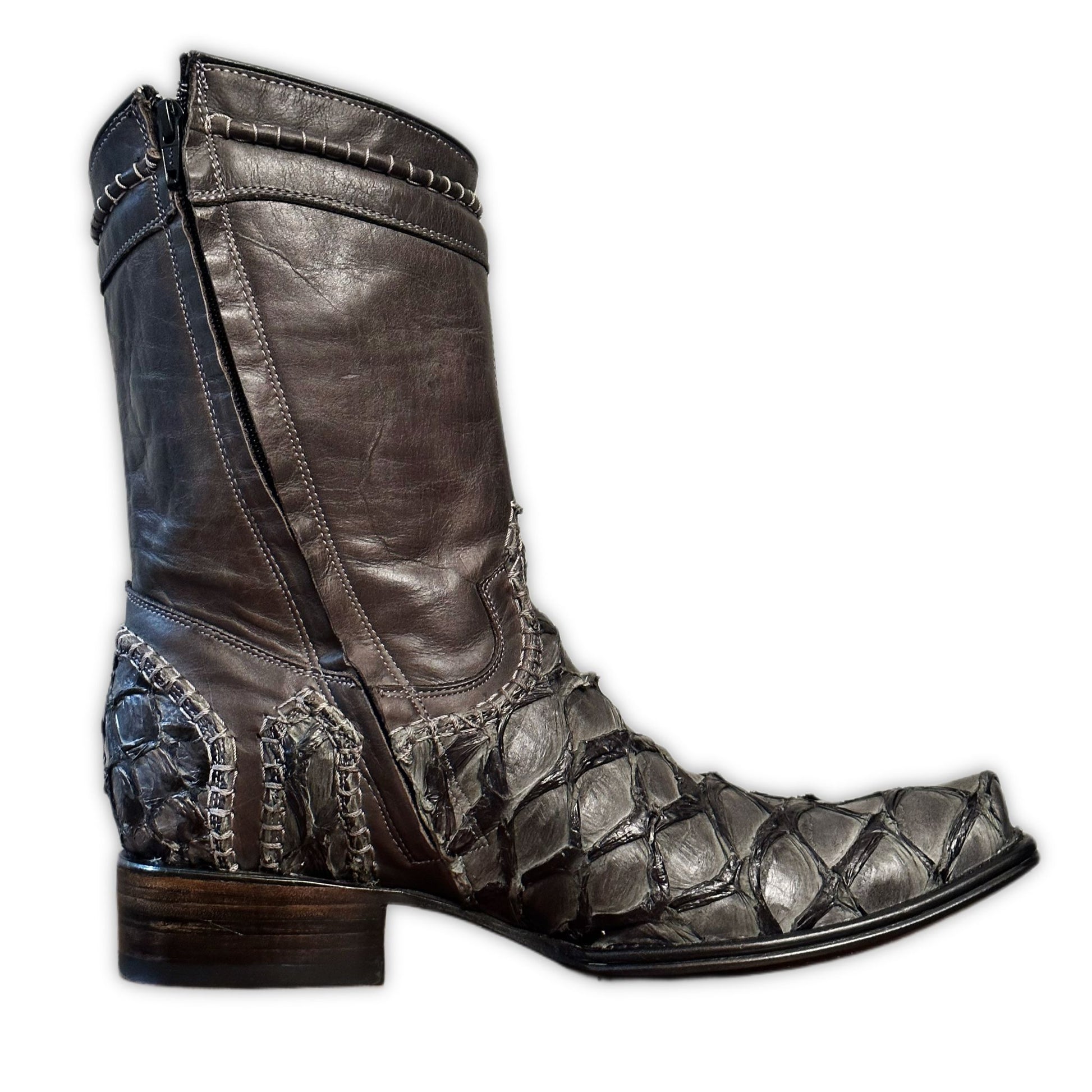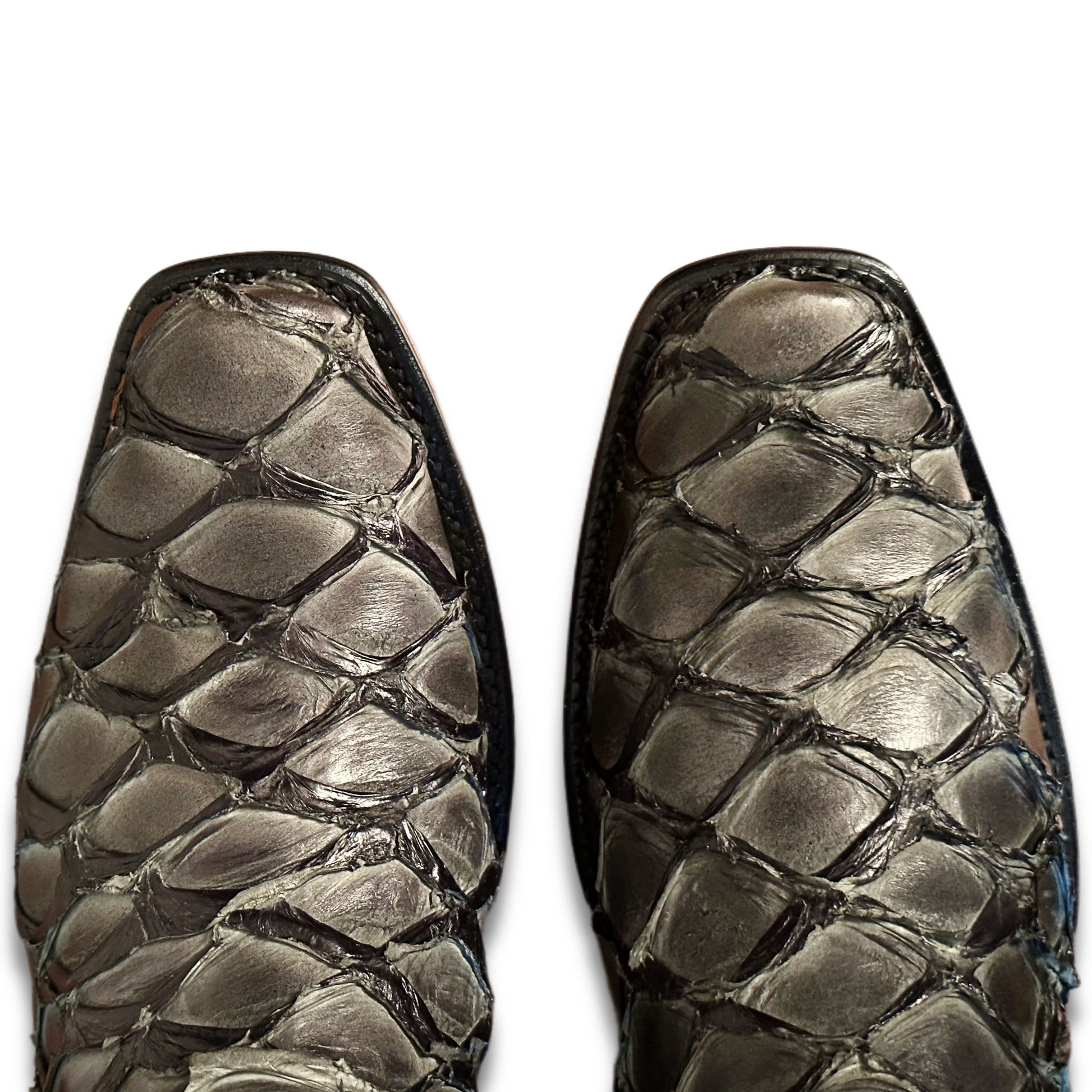Crafted from genuine pirarucu leather, these boots are unrivaled in quality. The gunmetal gray hue adds a sleek, modern touch to the classic fish scale texture.