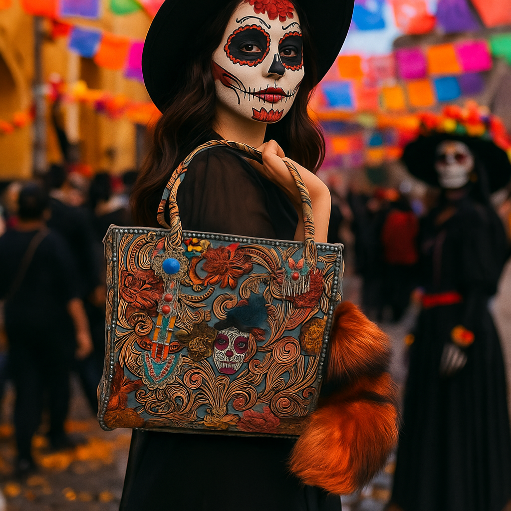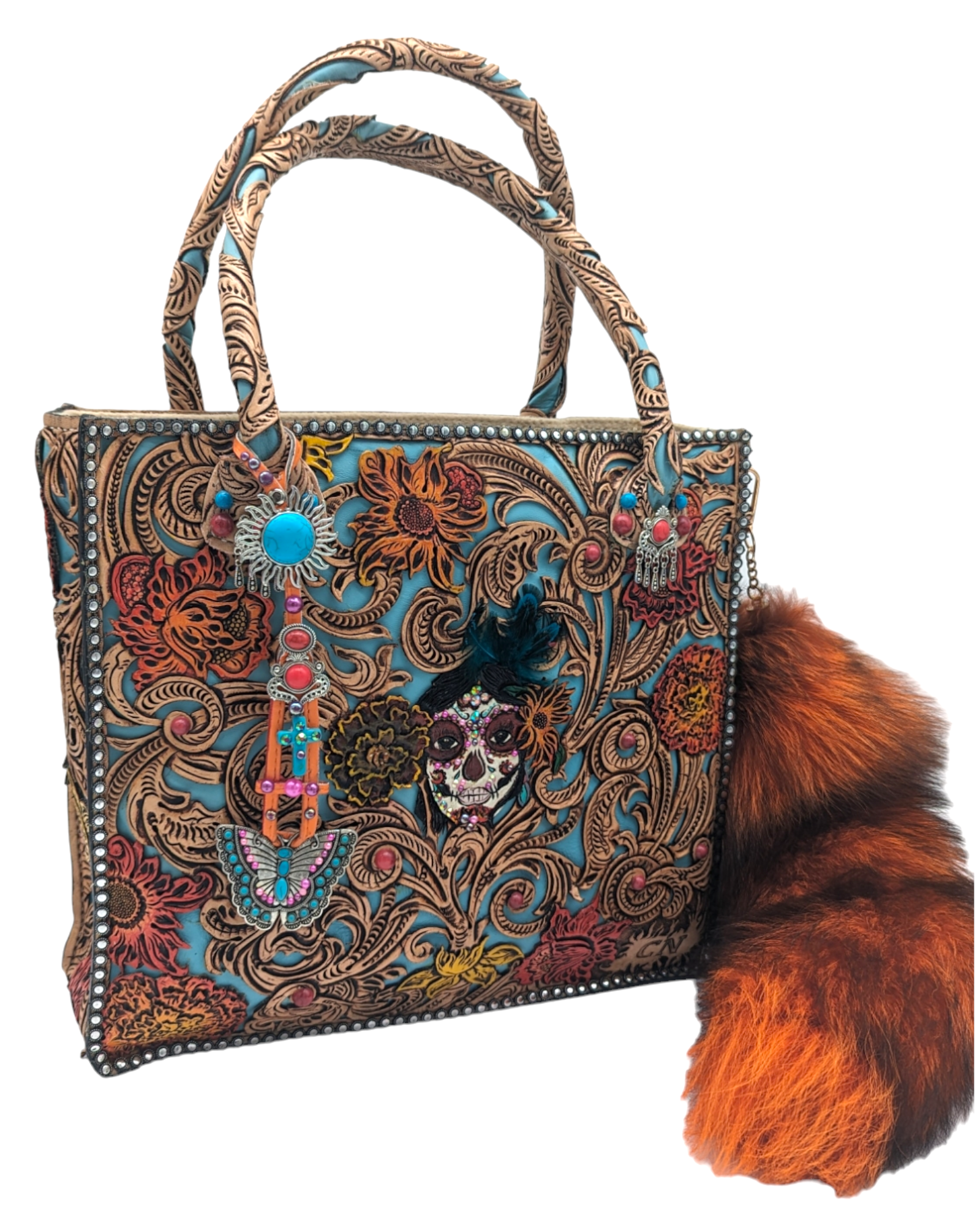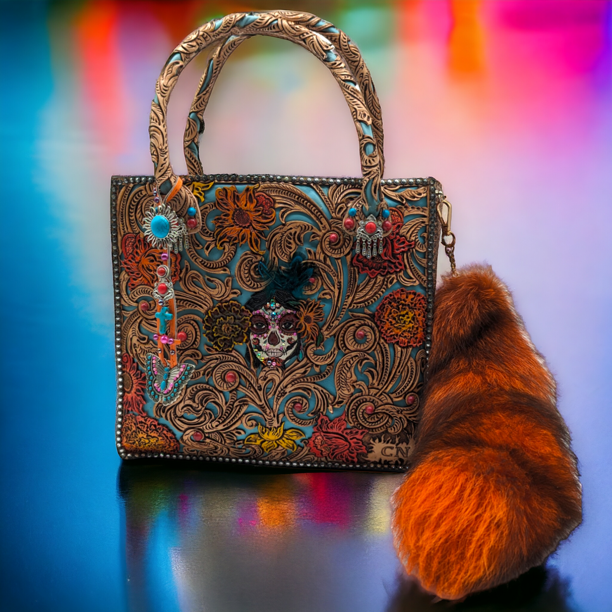 The Catrina Bag, Day of the Dead Western Hand Tooled Leather Handbag with Fox Tail and Butterfly Charm