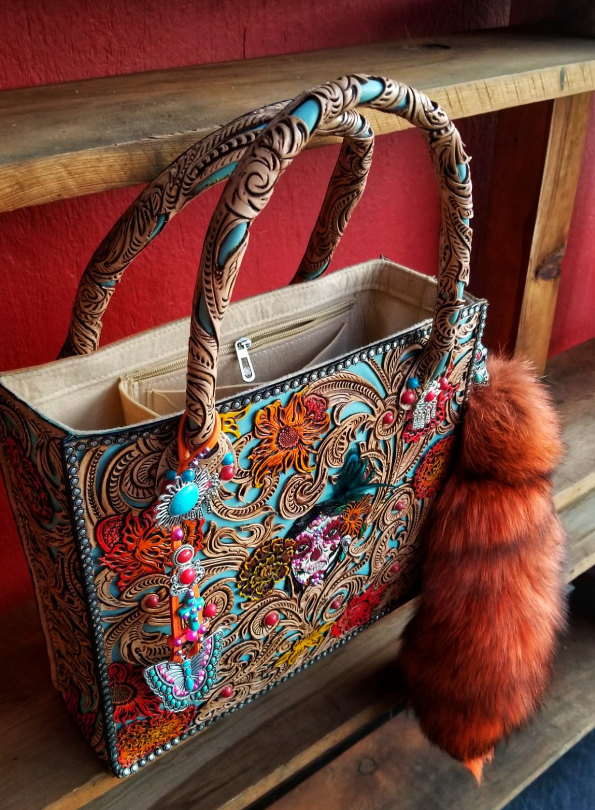 This purse is a leather masterpiece inspired by the Day of the Dead Mexican celebrations. It was meticulously crafted by our skilled artisans in Mexico using traditional techniques. The colorful hand-tooling and delicate rivets add a unique touch to this bag, making it truly impressive. And let's not forget the stunning details, from the exquisite handles to the intricate face of The Catrina. Featuring real feathers and sparkling gems, her face is a work of art. The real fox tail accessory enhances the floral pattern with a touch of softness. The spacious interior of this bag includes multiple pockets to keep all your belongings organized.