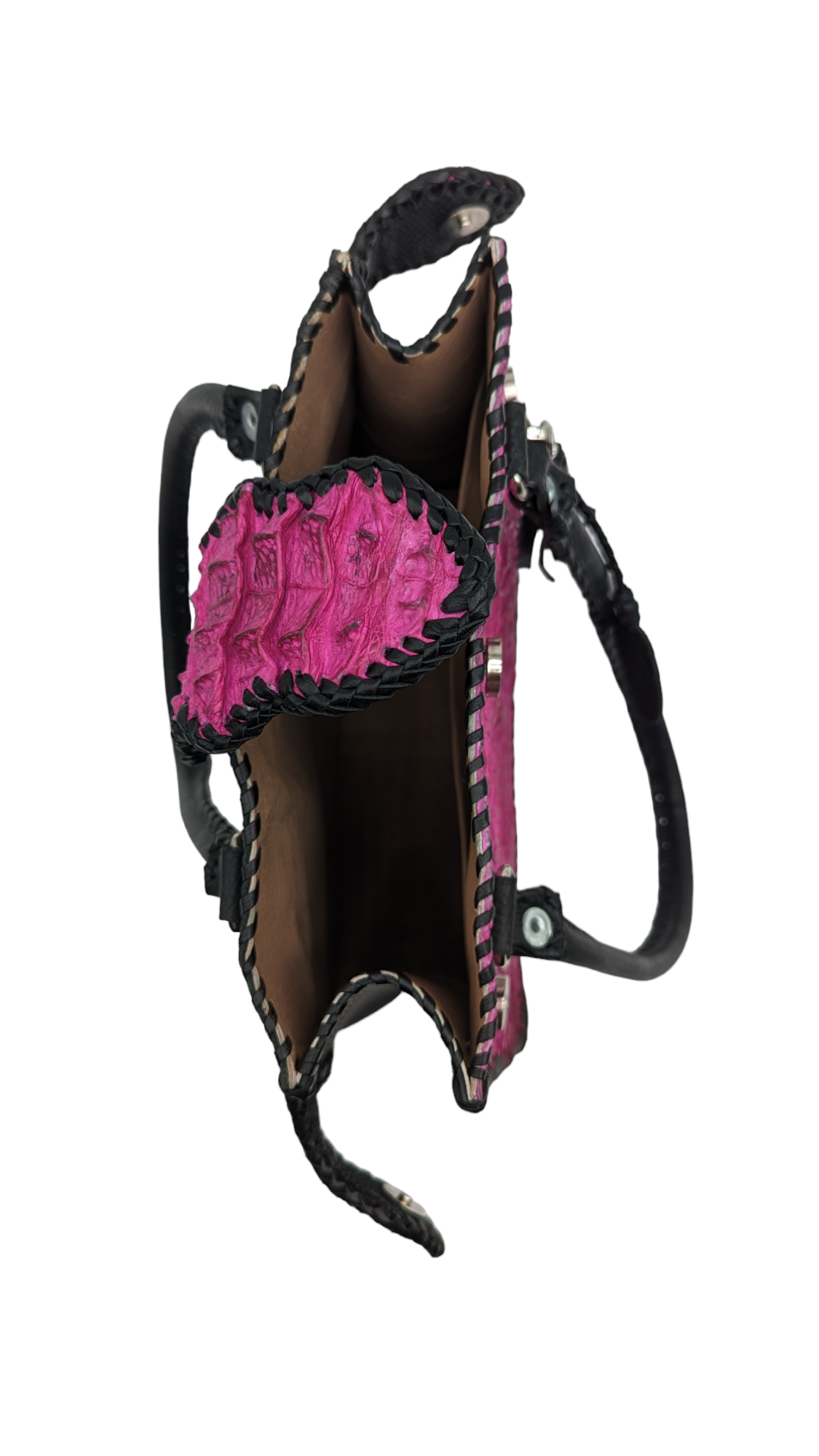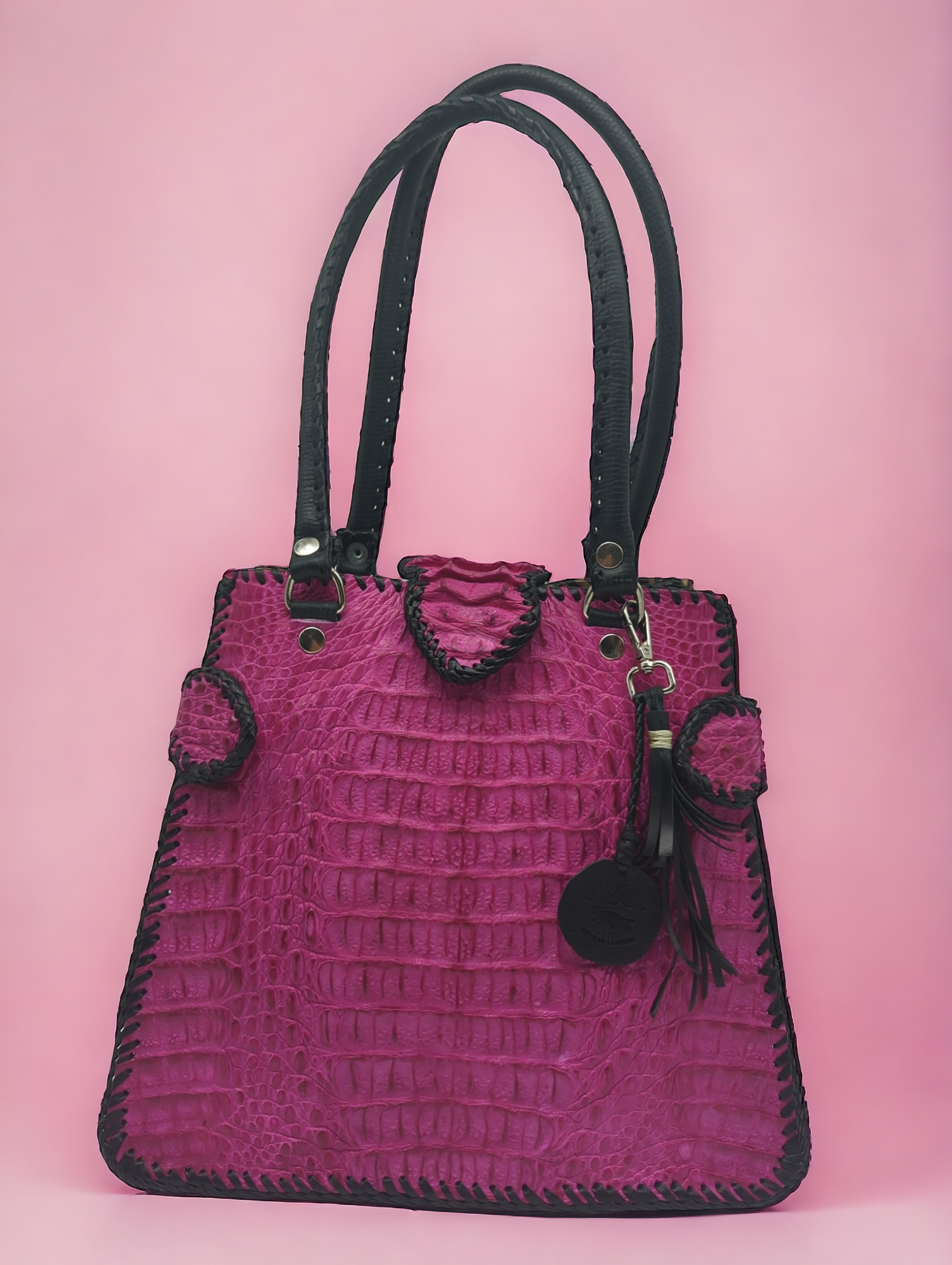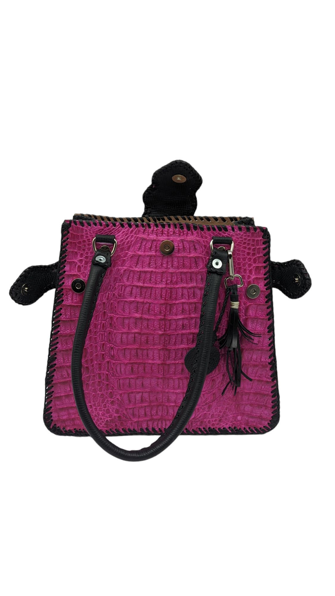 • Expertly handcrafted from genuine alligator leather. This bag is completely artisanal and features a unique whip stitching design. This bag is rugged yet feminine. The leather backside features a convenient zipper for easy access. The interior is also lined in leather. It offers 1 magnetic closure and 2 additional magnetic side closures that allow the bag to expand. This bag is made to last!