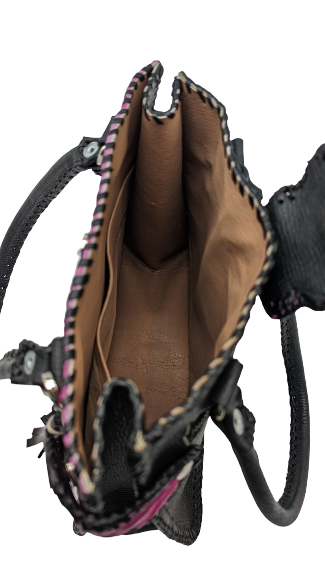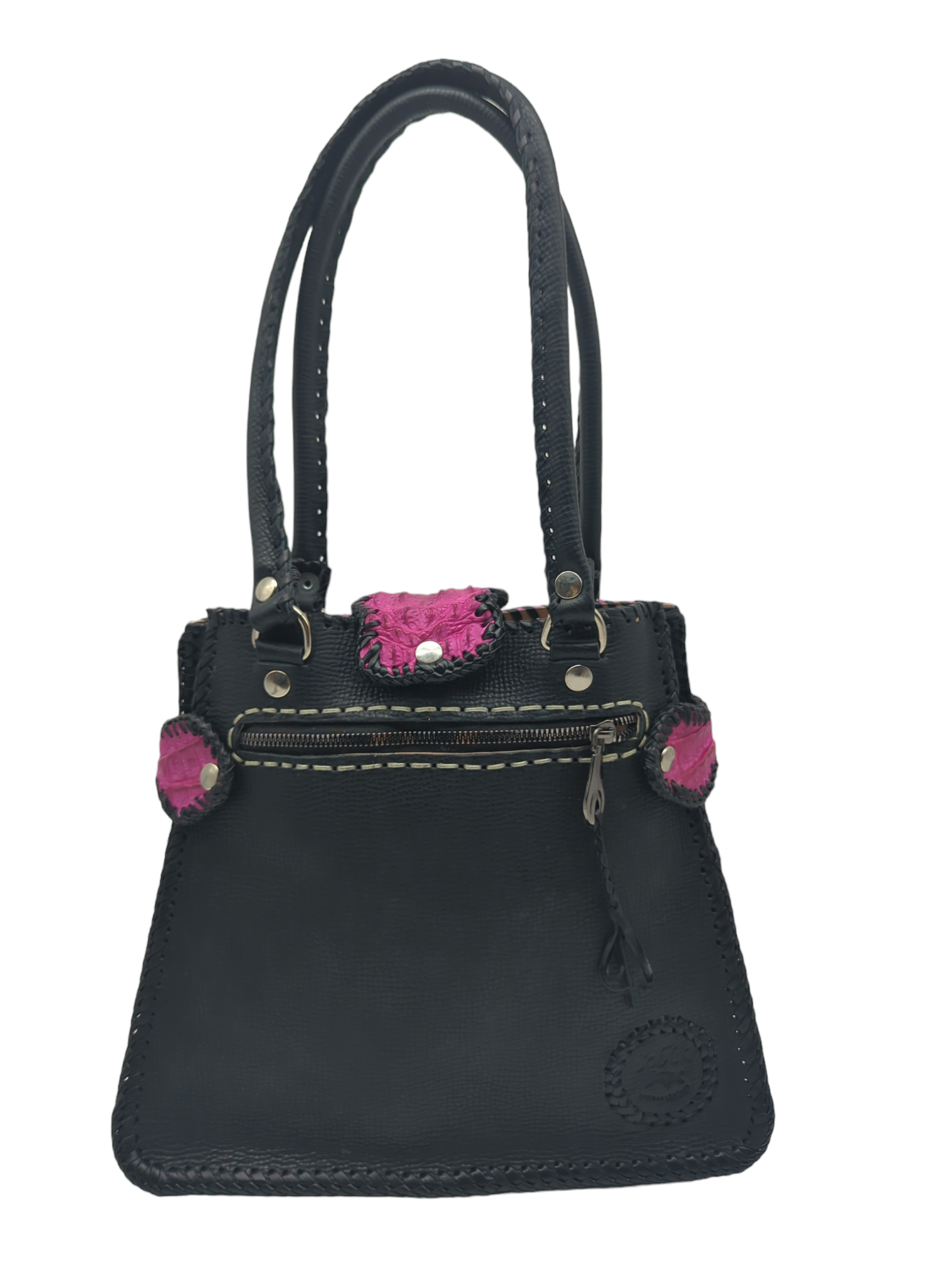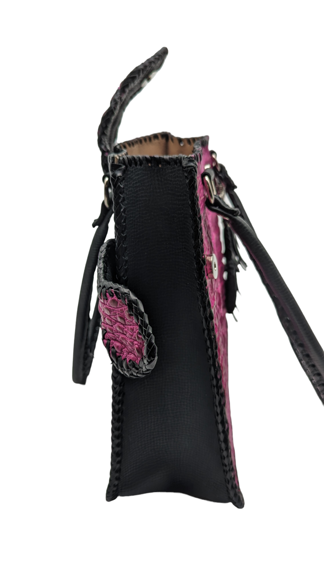 • Expertly handcrafted from genuine alligator leather. This bag is completely artisanal and features a unique whip stitching design. This bag is rugged yet feminine. The leather backside features a convenient zipper for easy access. The interior is also lined in leather. It offers 1 magnetic closure and 2 additional magnetic side closures that allow the bag to expand. This bag is made to last!
