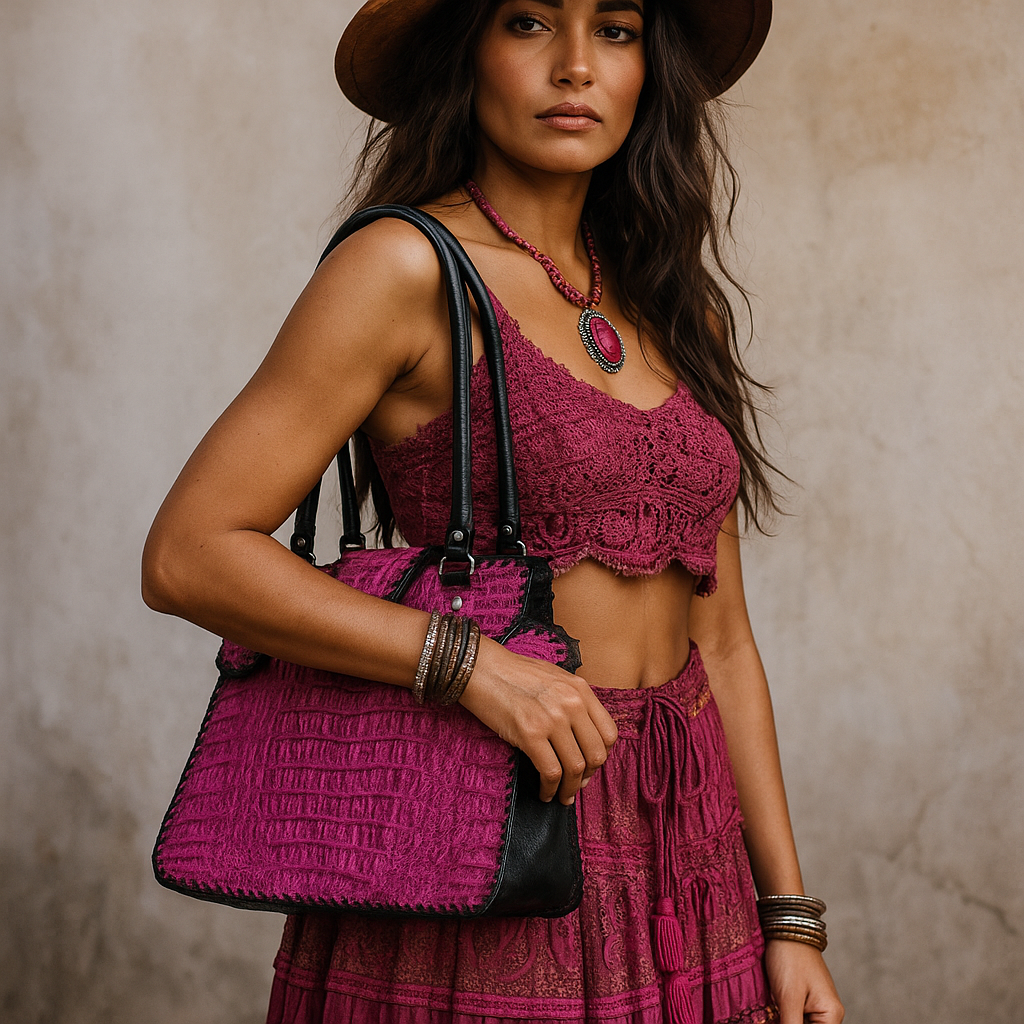Trifecta Alligator Shoulder Bag in Fuschia