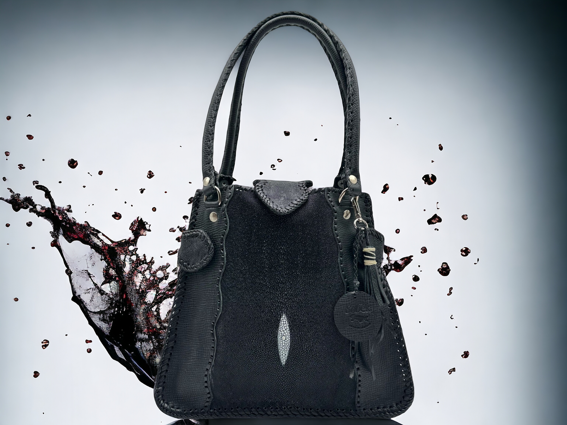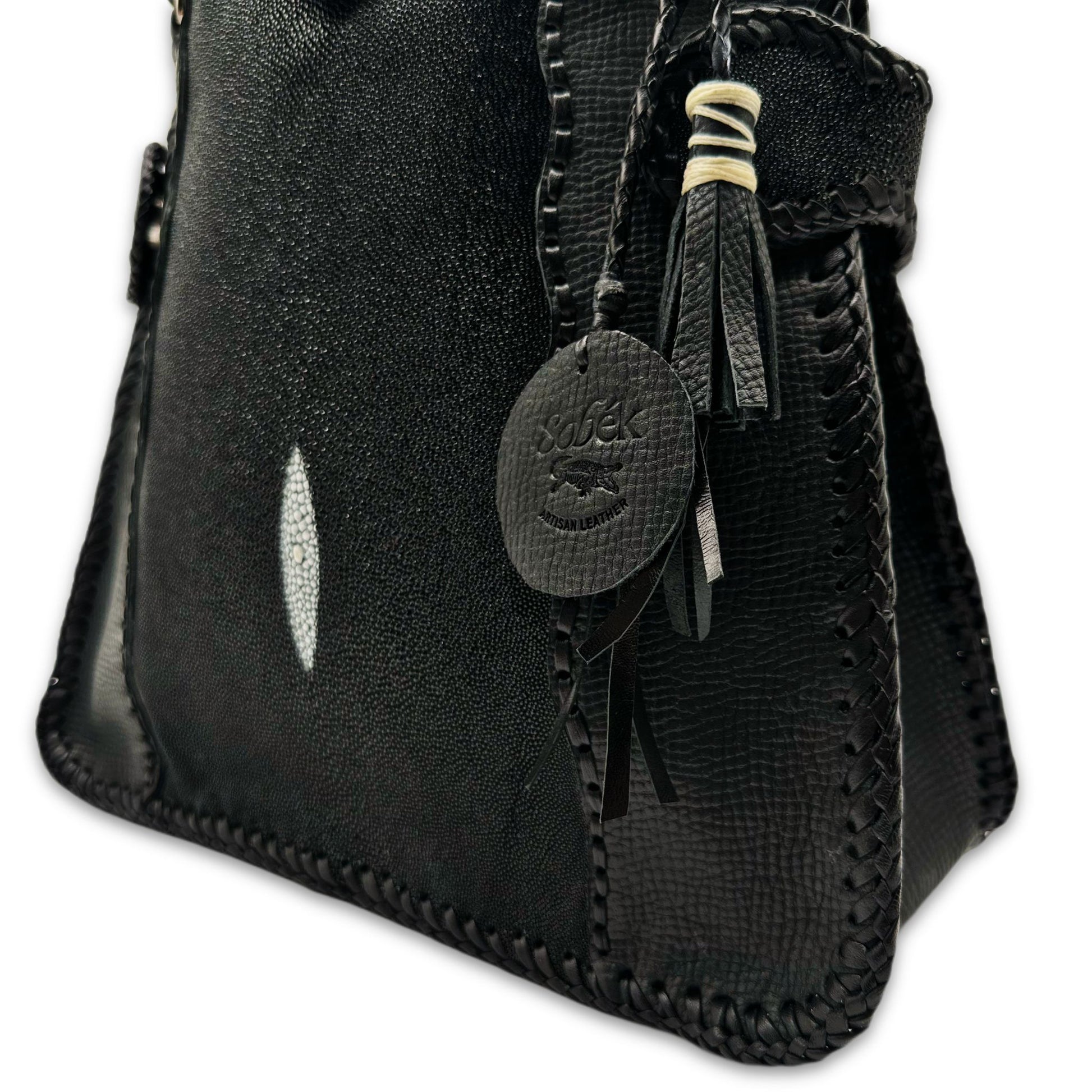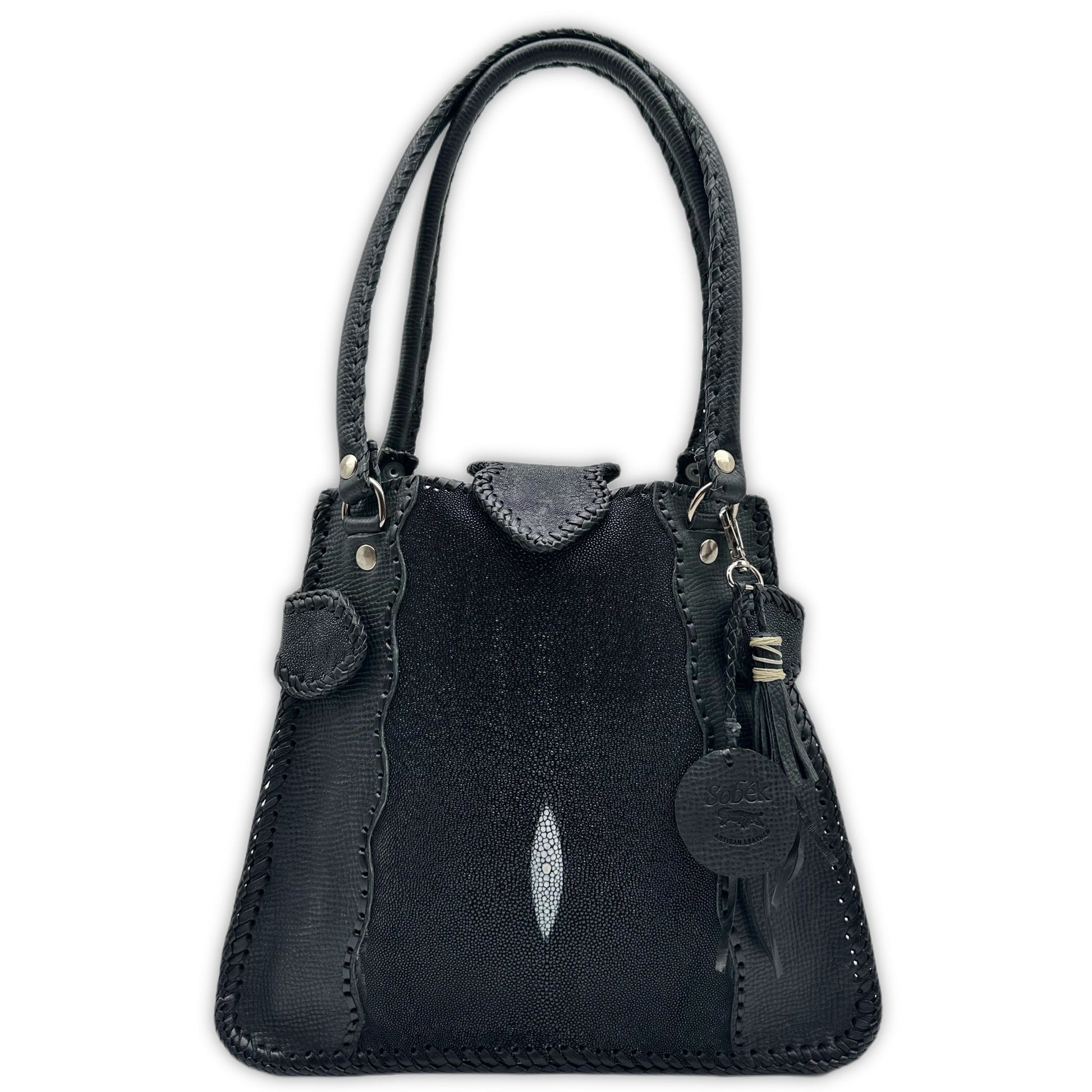 Crafted with expert precision, the Trifecta Stingray Shoulder Bag is a unique blend of luxurious stingray skin and supple calfskin leather. Its hand-whipped stitching gives it a rugged yet feminine appearance, while a zipper on the back provides convenient access. Lined with soft calfskin leather, this bag offers 1 magnetic closure and 2 side closures for easy expansion. Designed for durability, it also comes with a braided keychain. With dimensions of 12.5" L x 11" H x 4.5" W and a top handle measuring 11", this bag is made large enough to carry plenty!