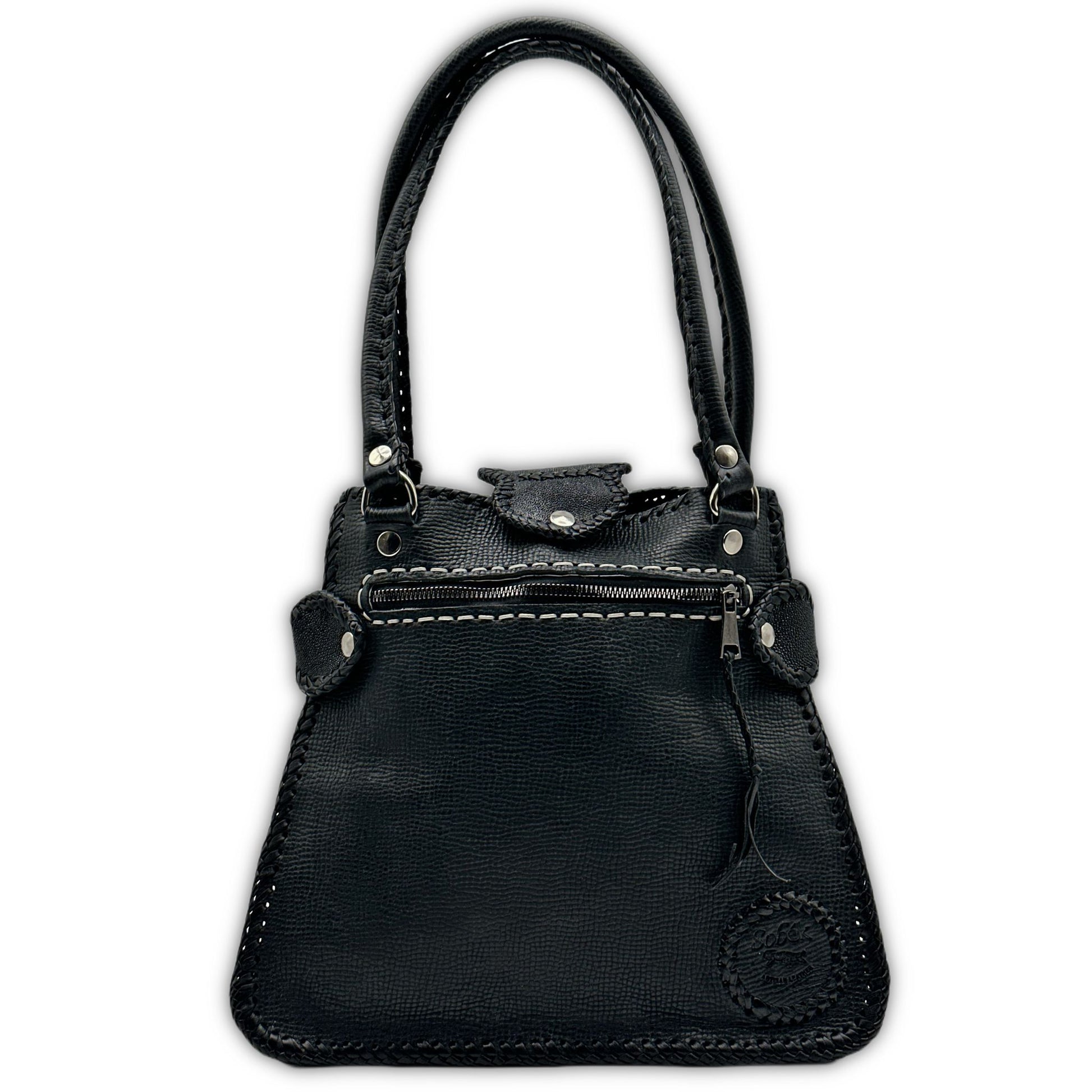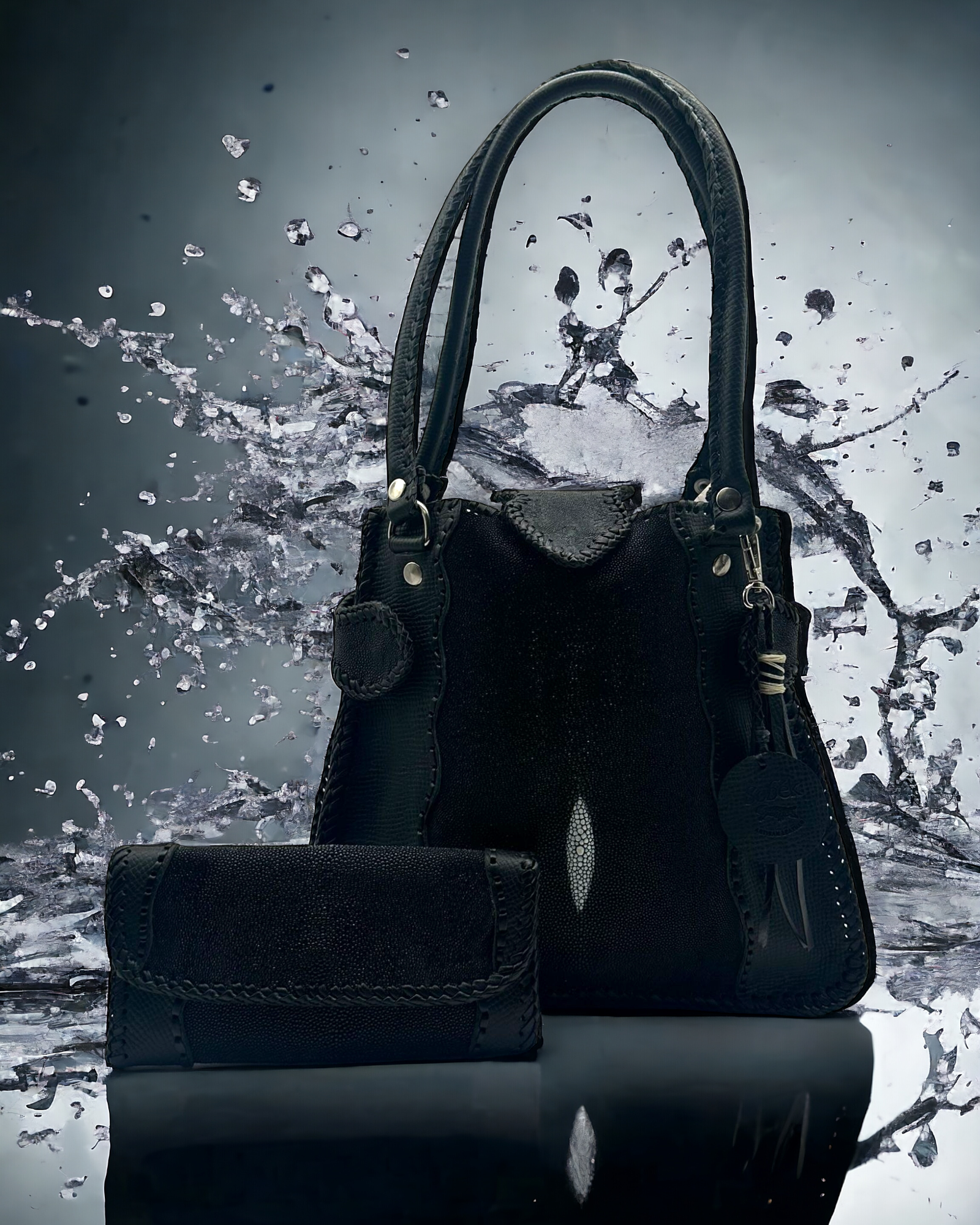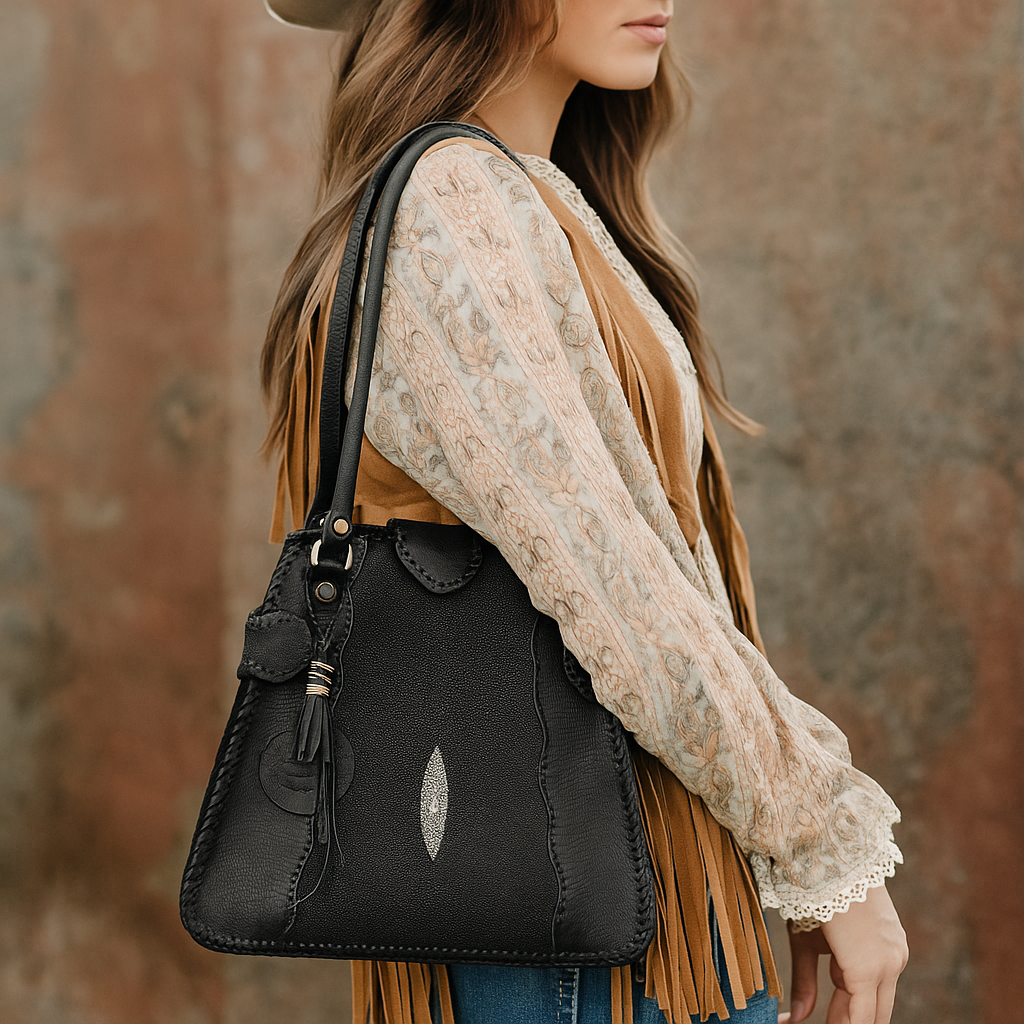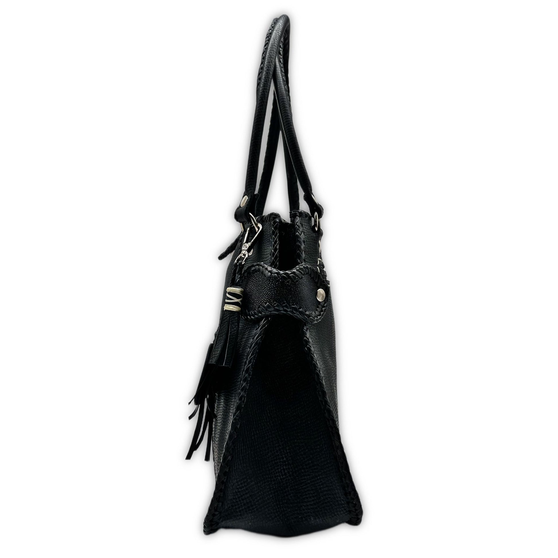 Crafted with expert precision, the Trifecta Stingray Shoulder Bag is a unique blend of luxurious stingray skin and supple calfskin leather. Its hand-whipped stitching gives it a rugged yet feminine appearance, while a zipper on the back provides convenient access. Lined with soft calfskin leather, this bag offers 1 magnetic closure and 2 side closures for easy expansion. Designed for durability, it also comes with a braided keychain. With dimensions of 12.5" L x 11" H x 4.5" W and a top handle measuring 11", this bag is made large enough to carry plenty!