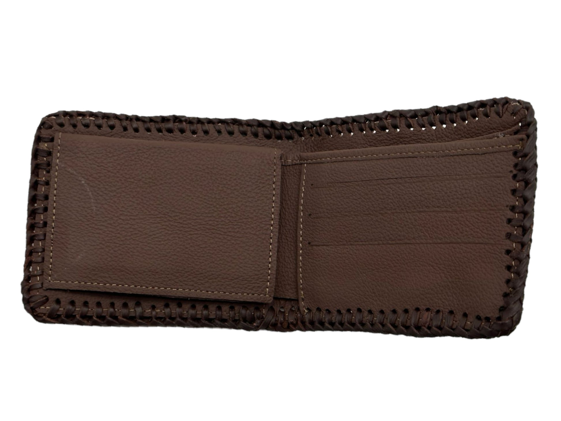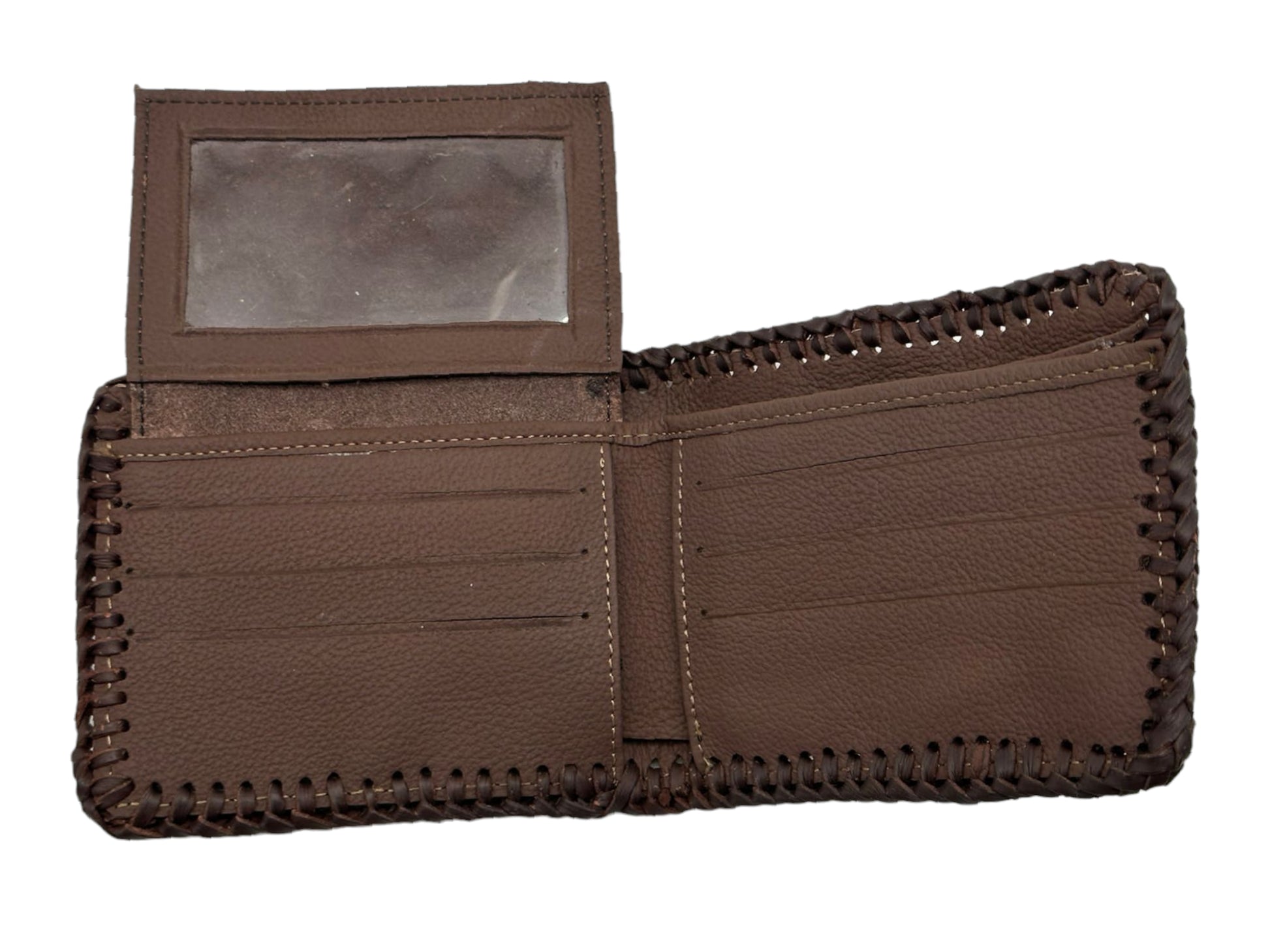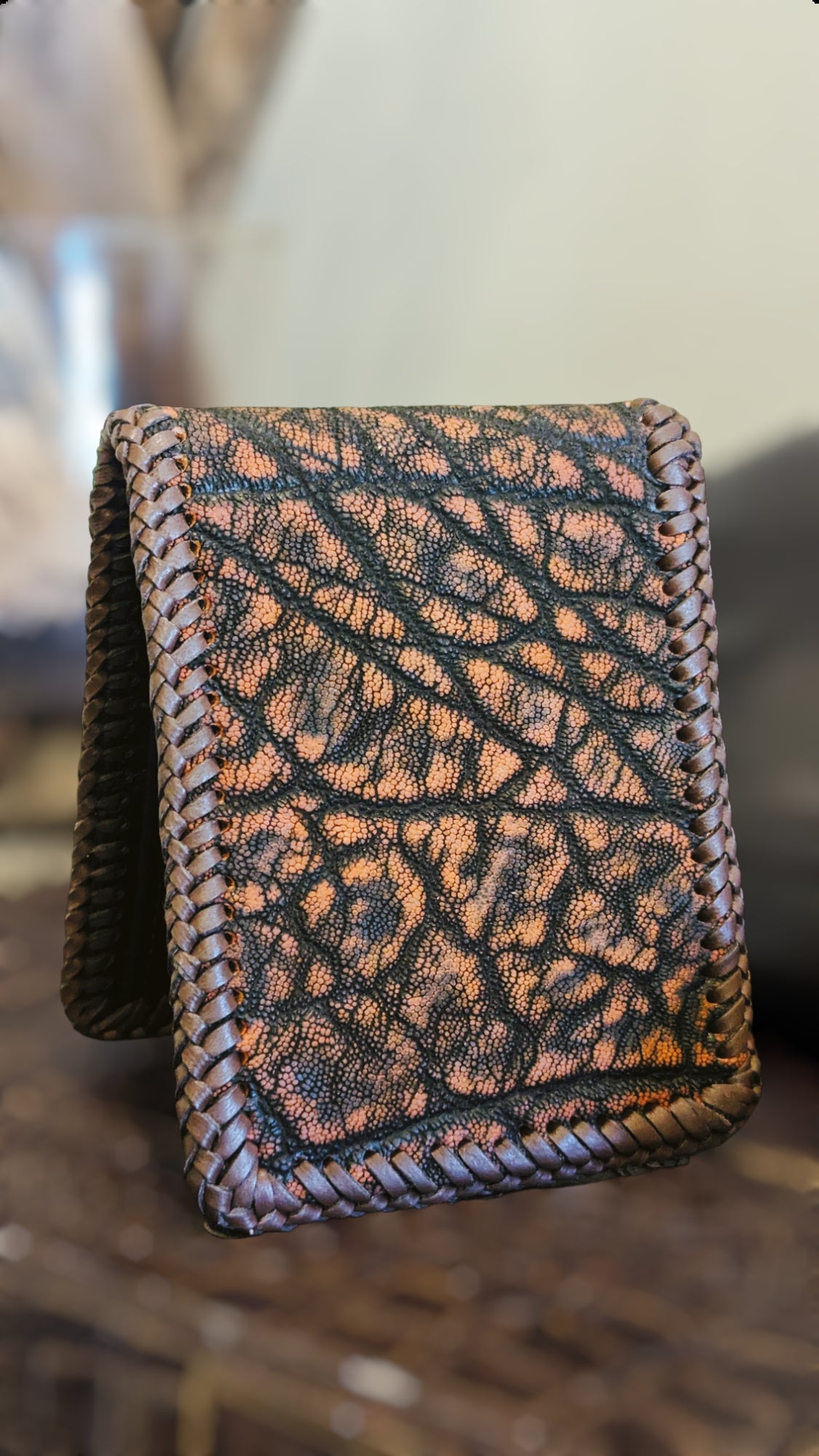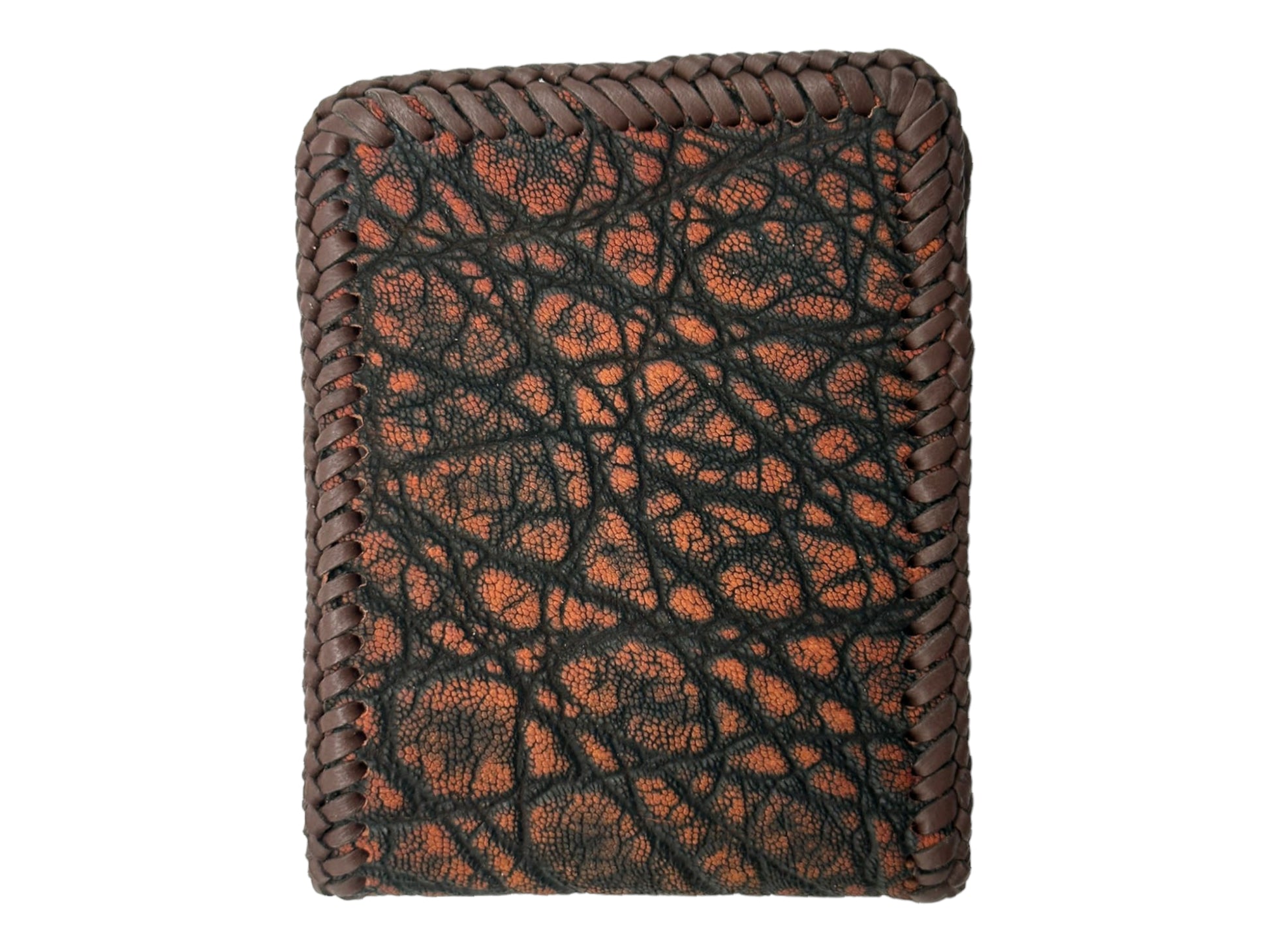 This wallet is made from genuine elephant leather in a unique whip stitched design. It features a beautiful wood tone and heavy grain texture.